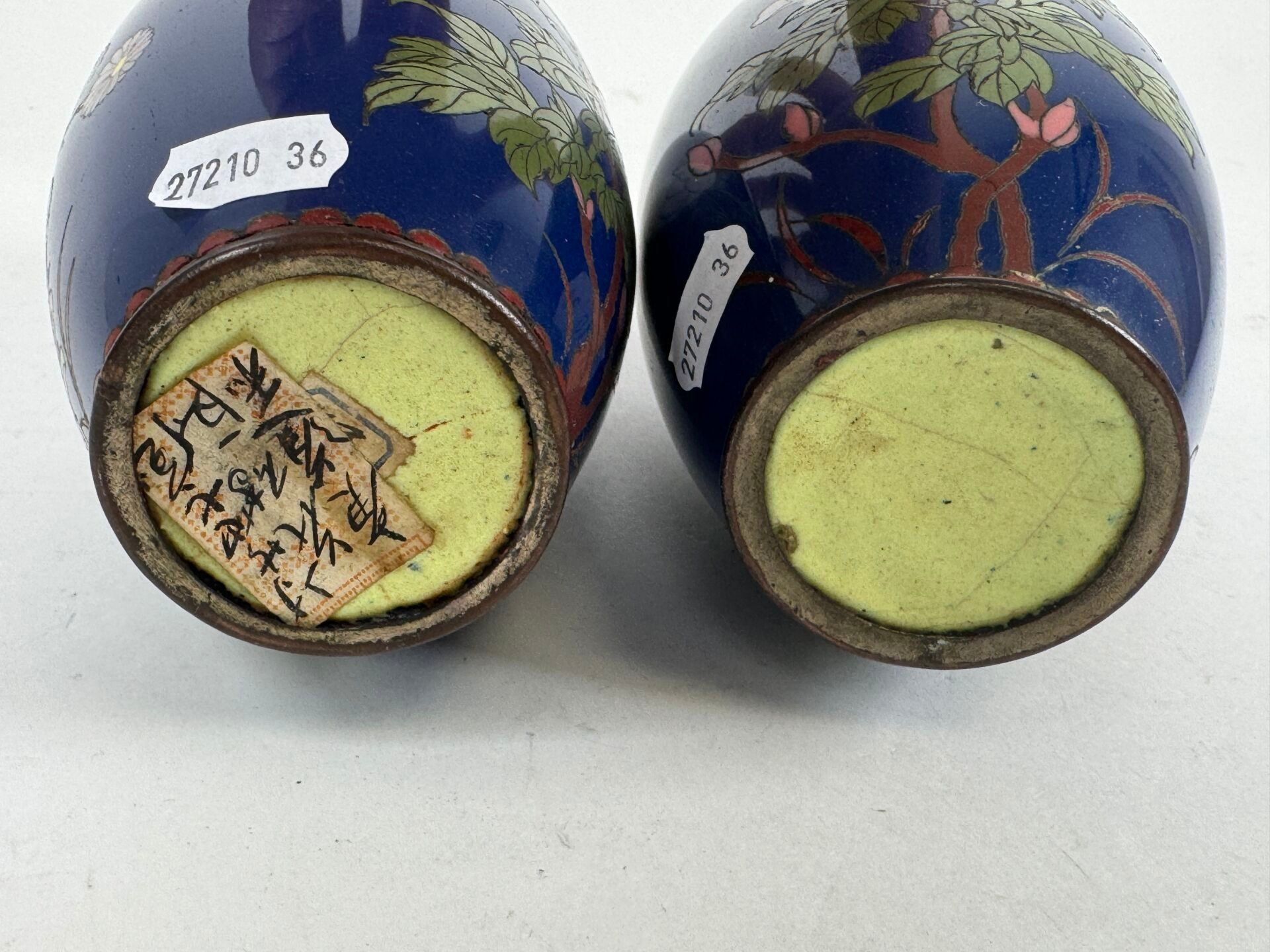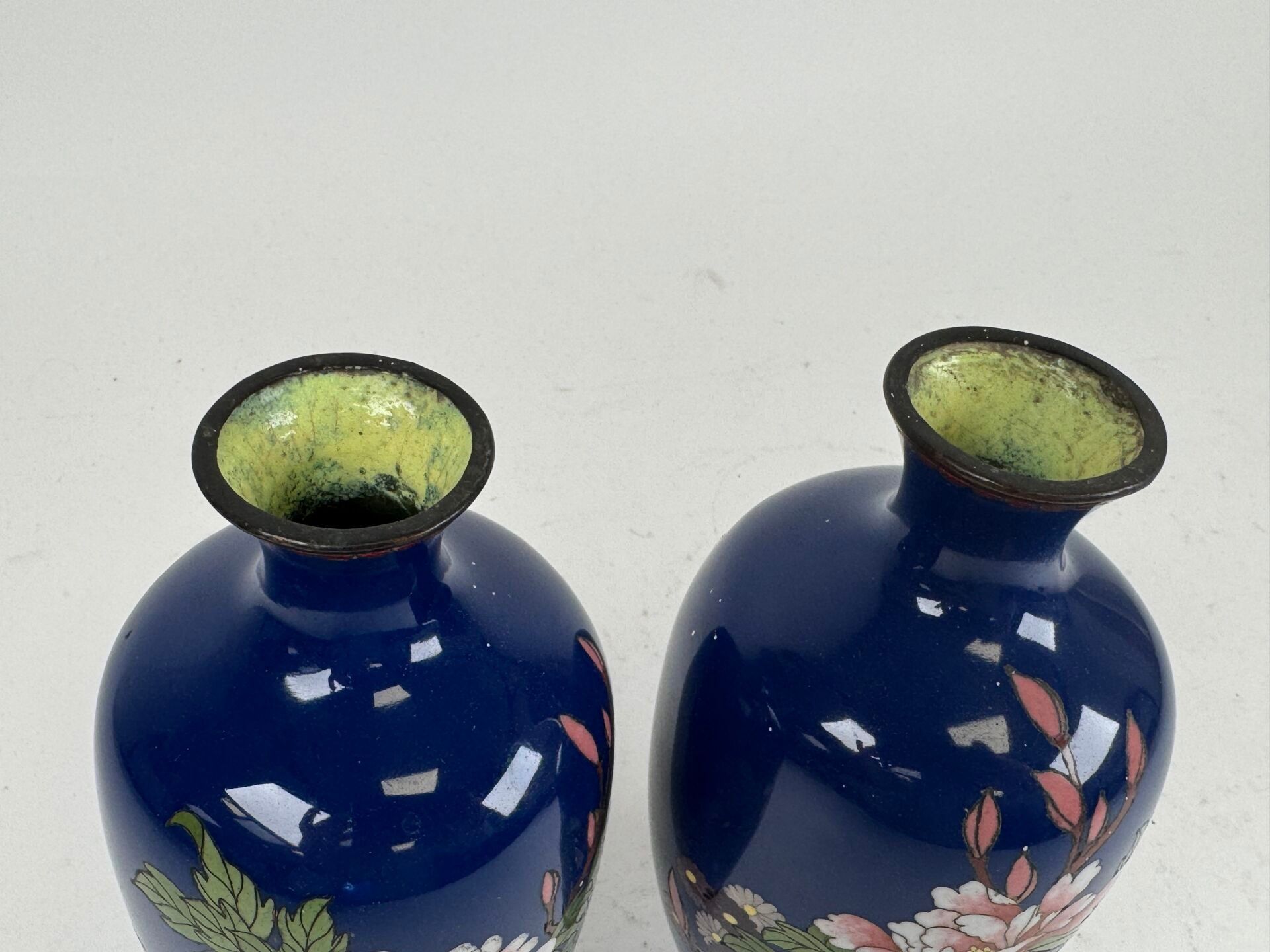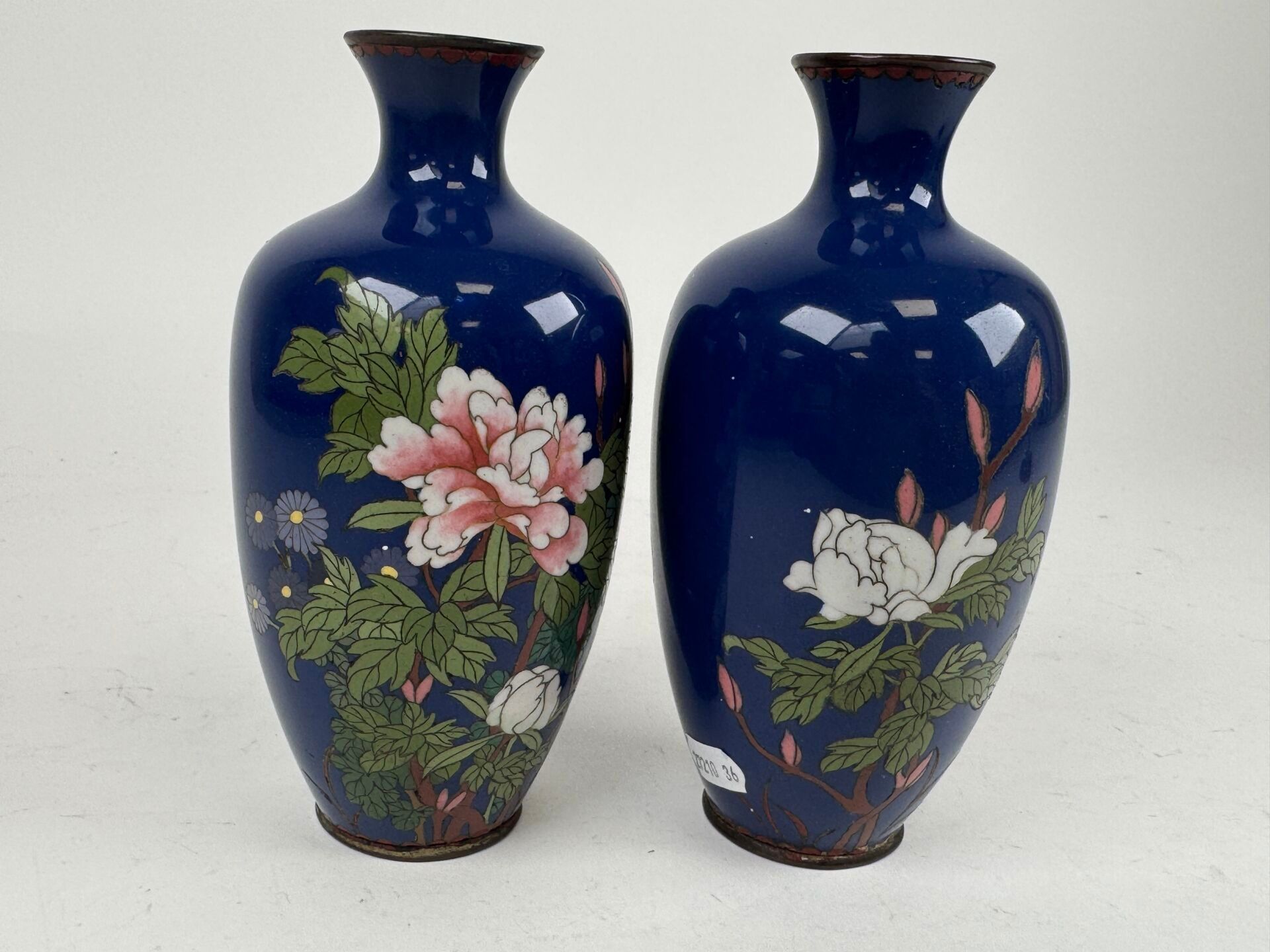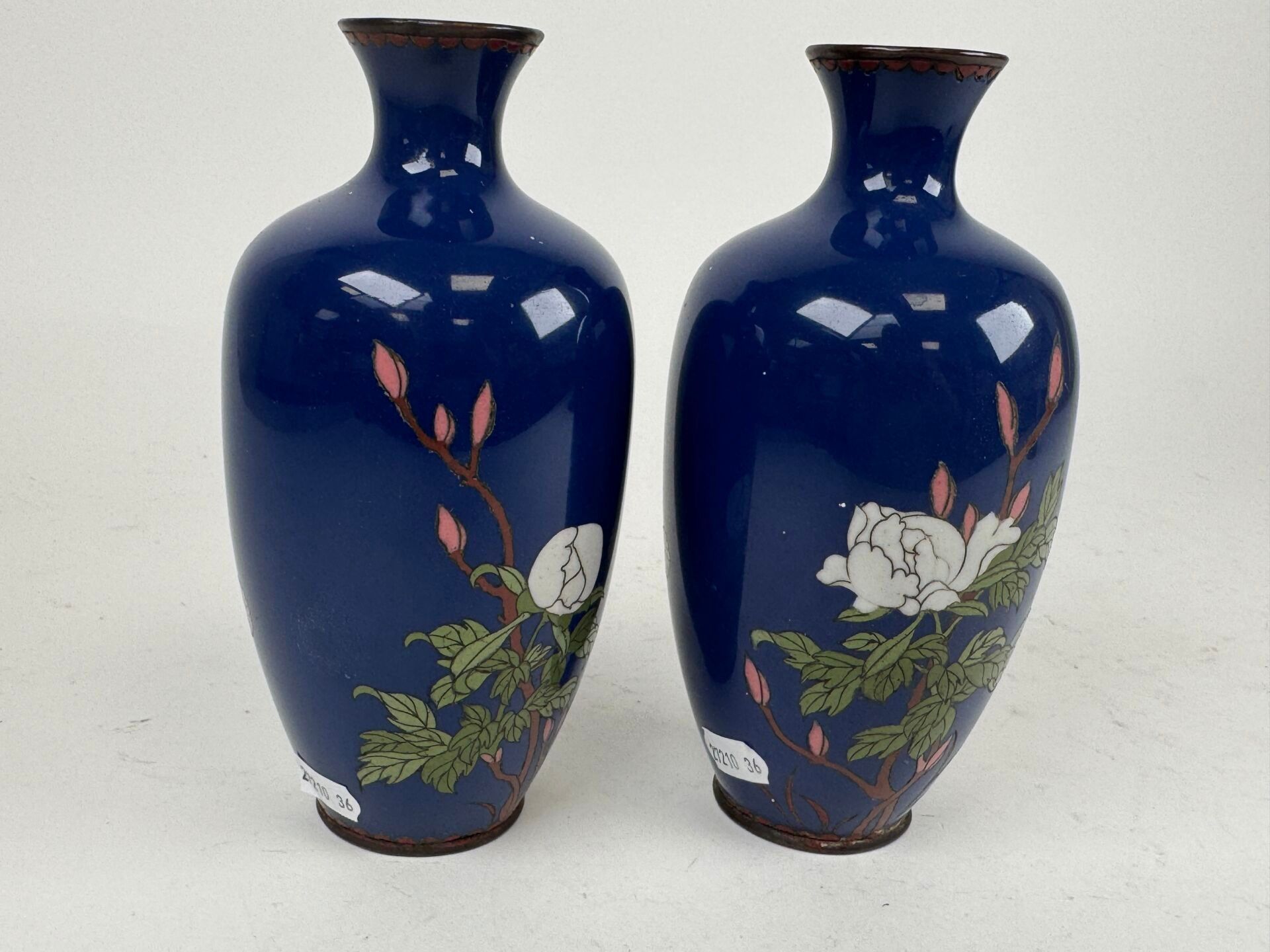 A pair of cloisonné vases with flowers on a blue background.