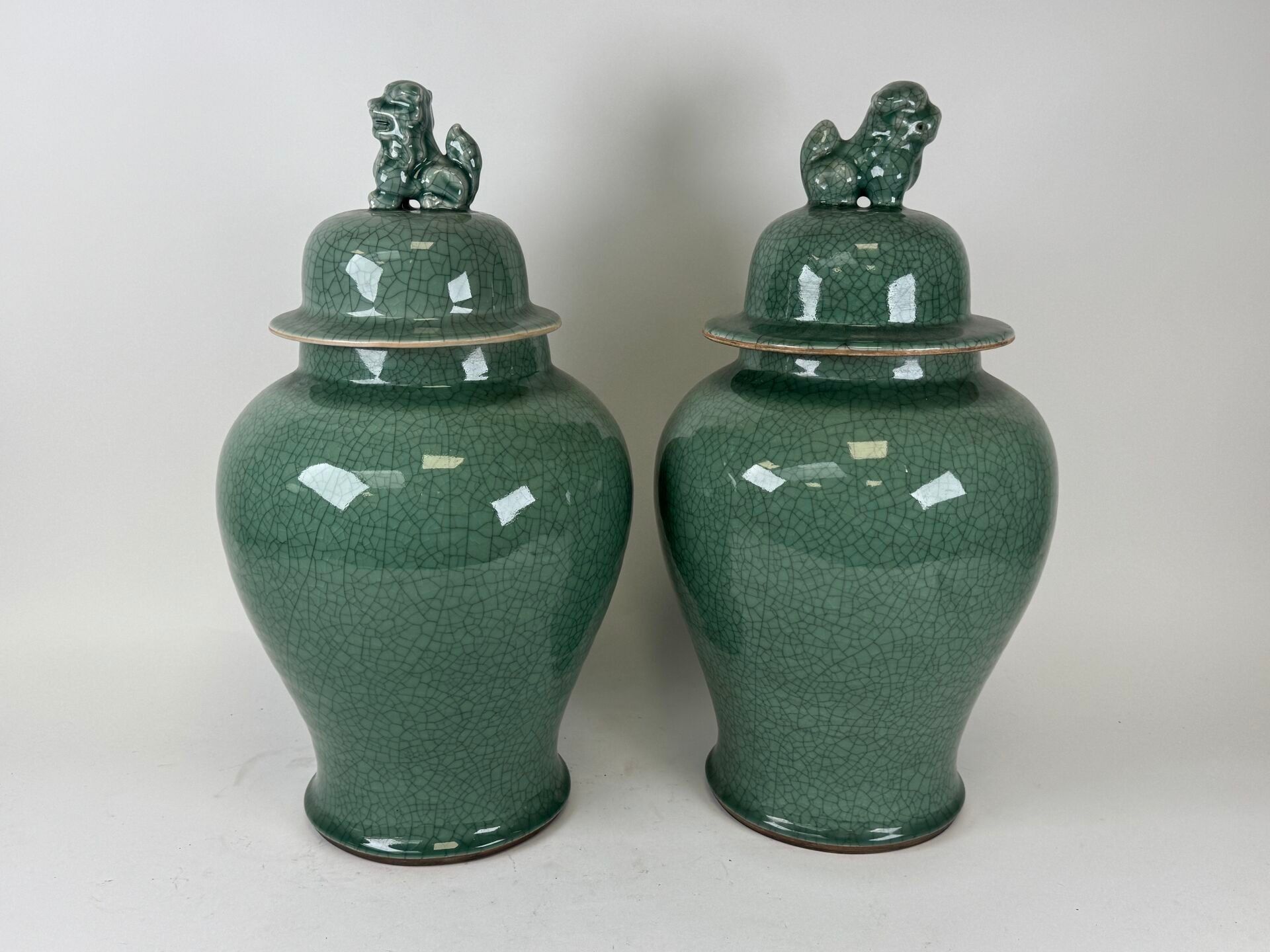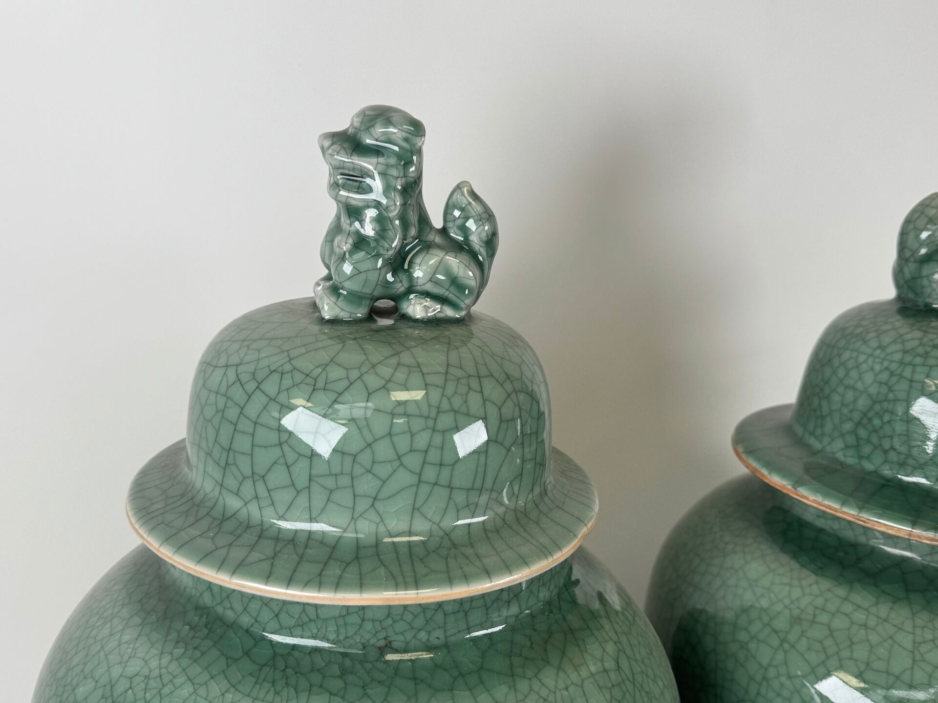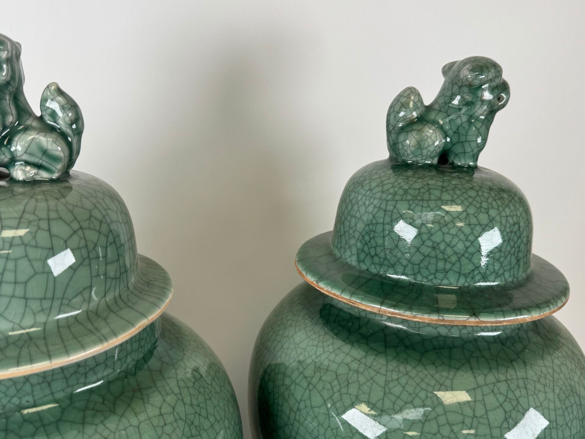 An important pair of covered vases in green crackle porcelain, the lid featuring a stylised animal.