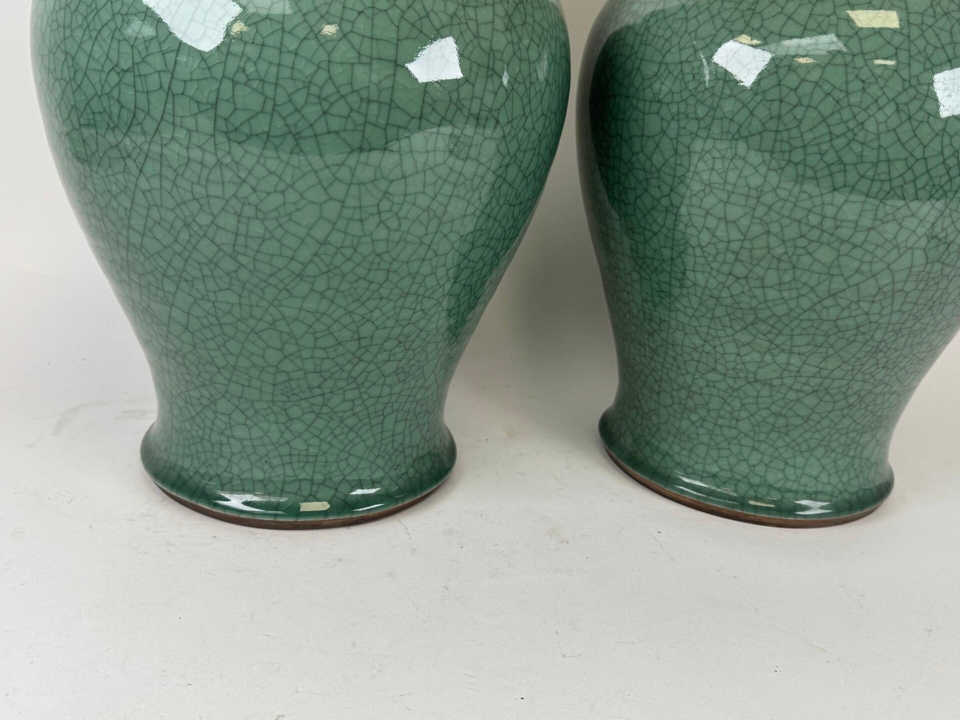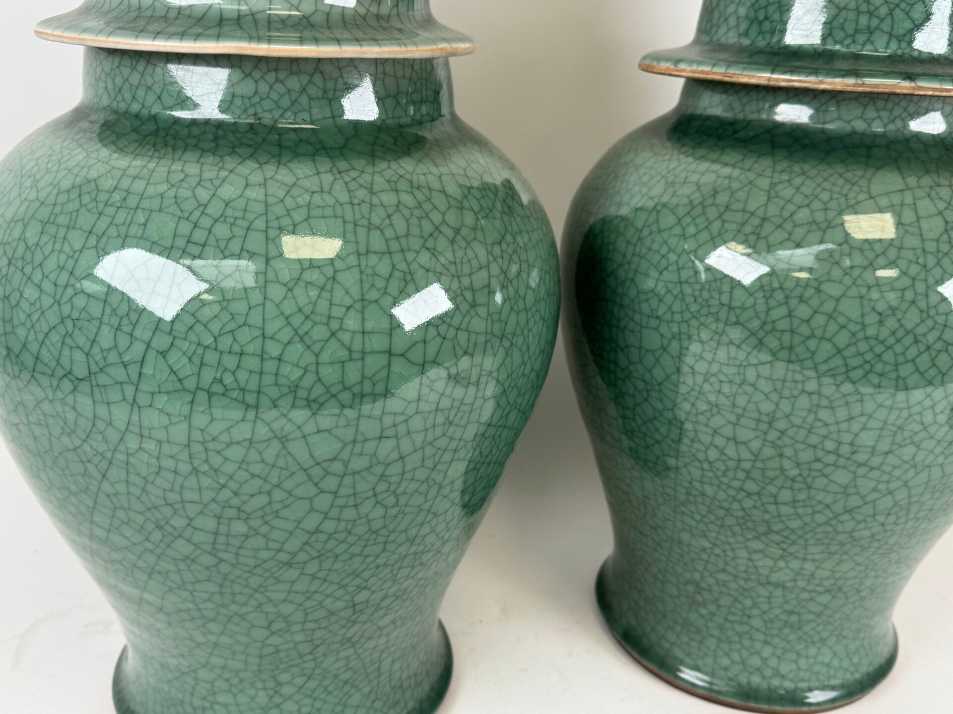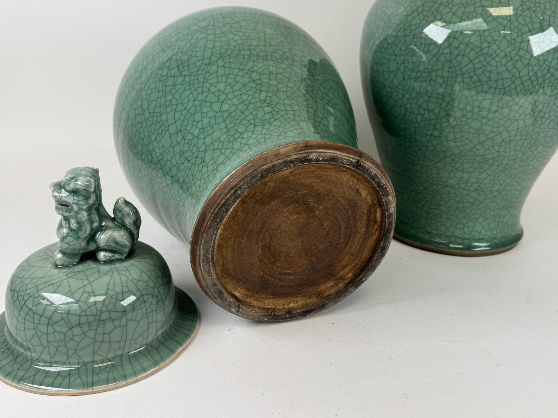 An important pair of covered vases in green crackle porcelain, the lid featuring a stylised animal.