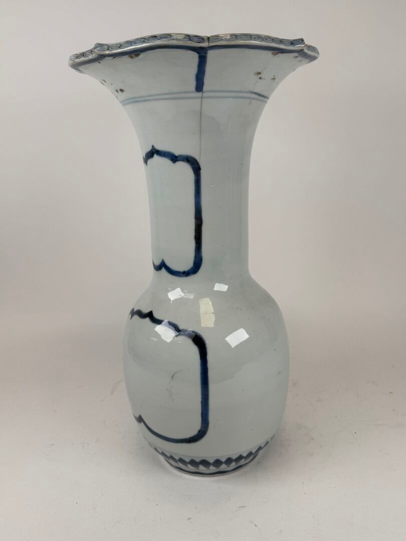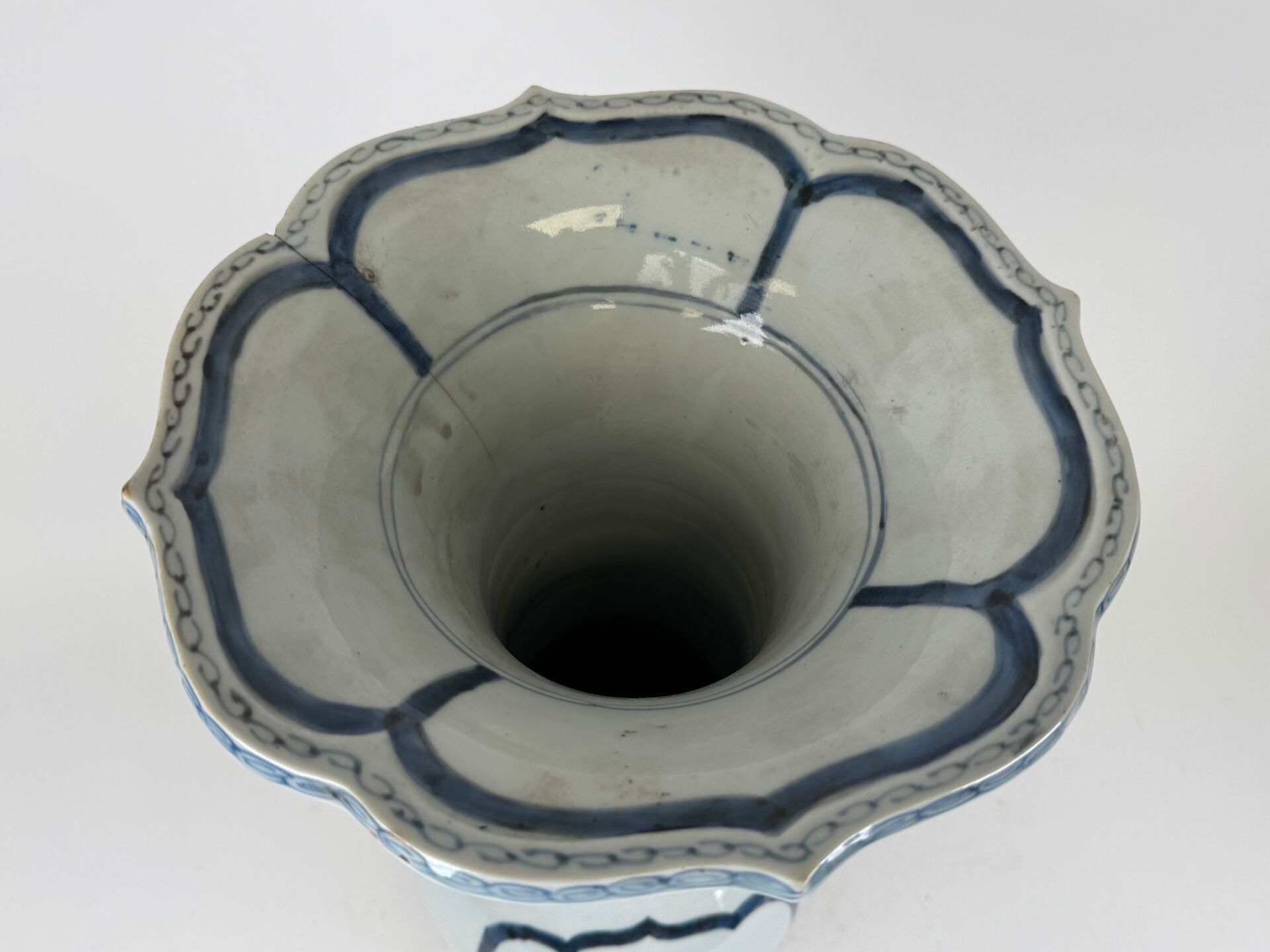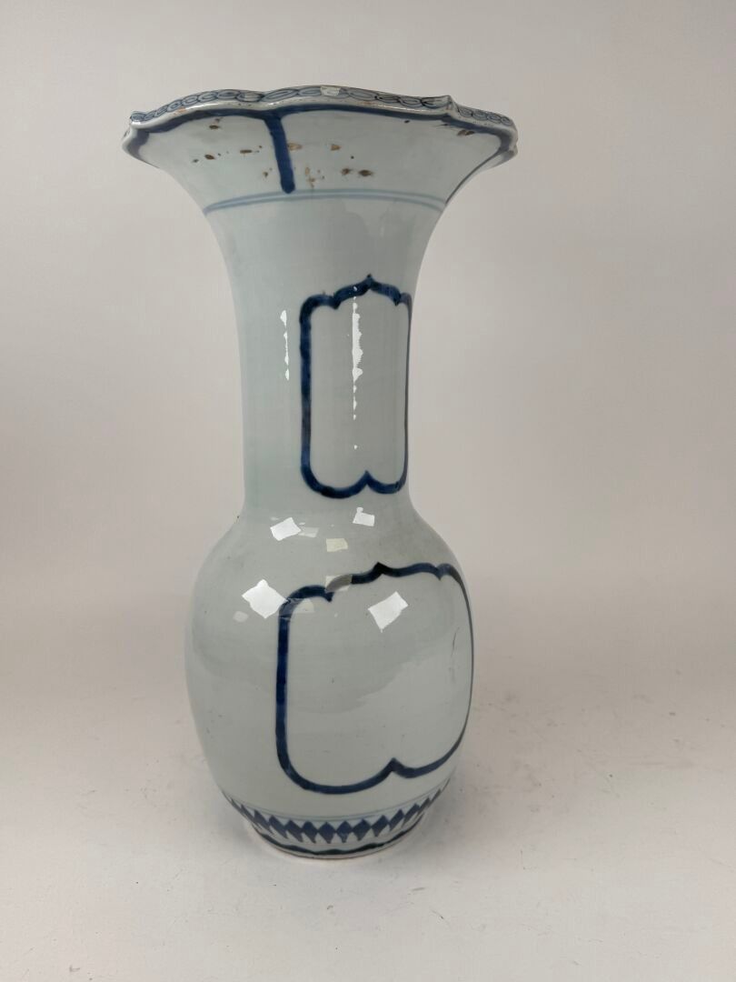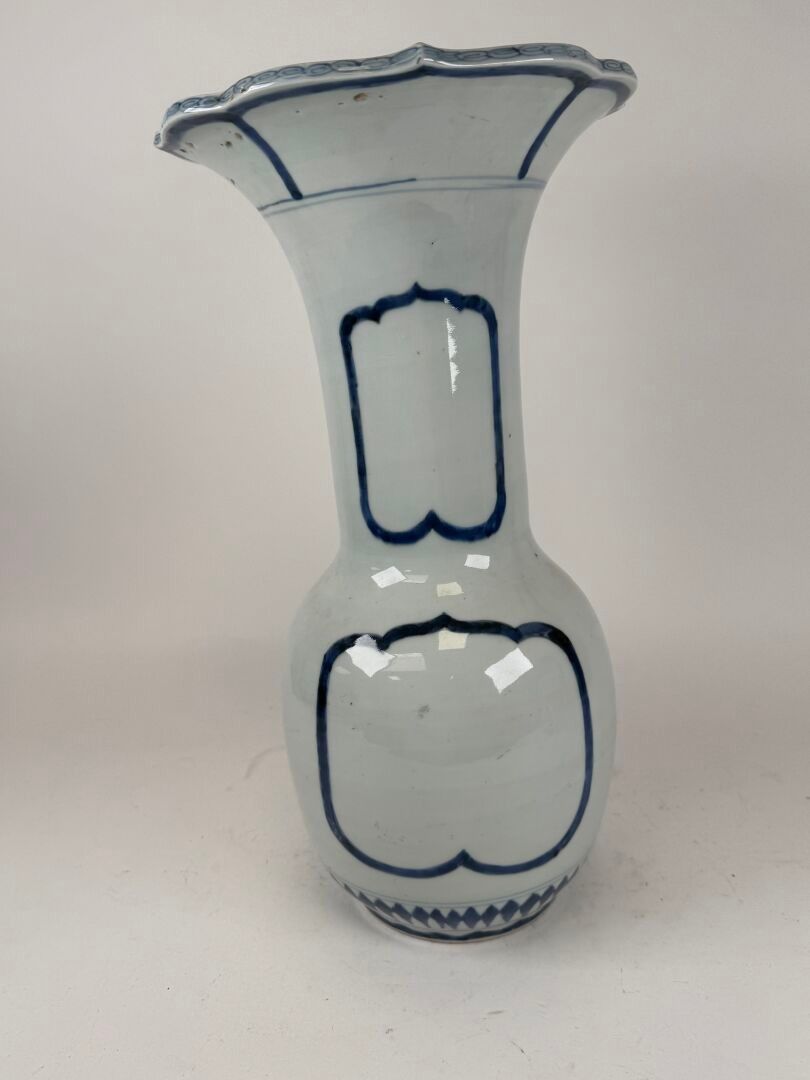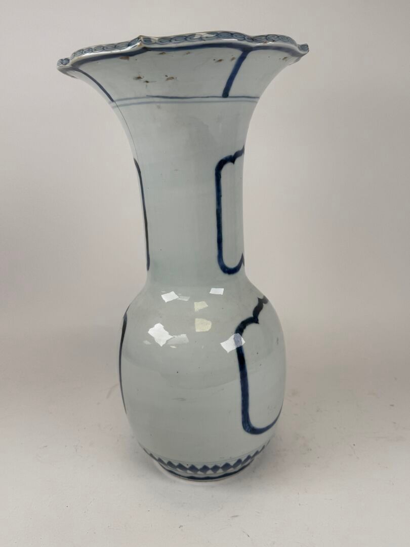 A large white and blue porcelain vase decorated with stylised motifs, with a scalloped neck.