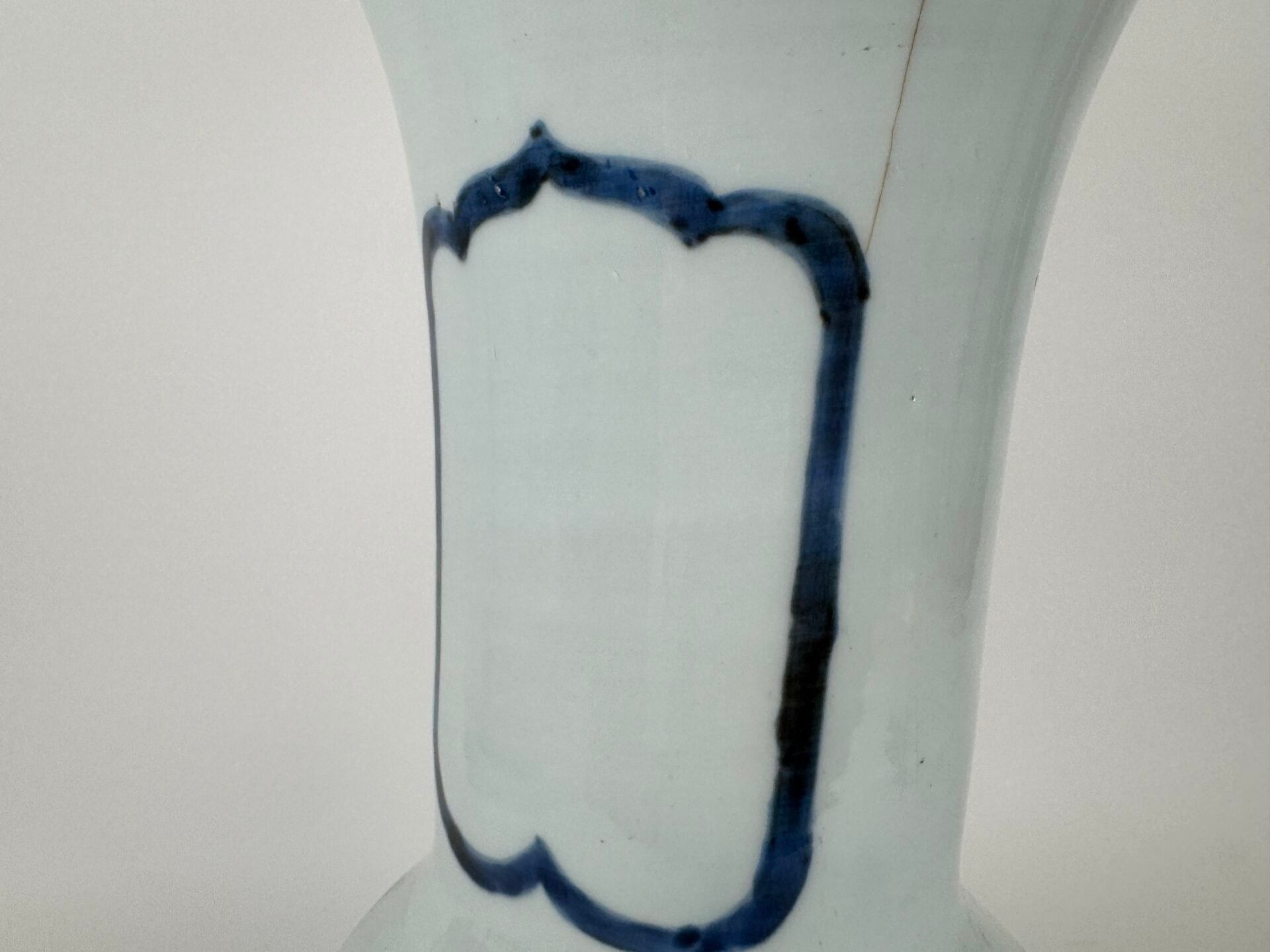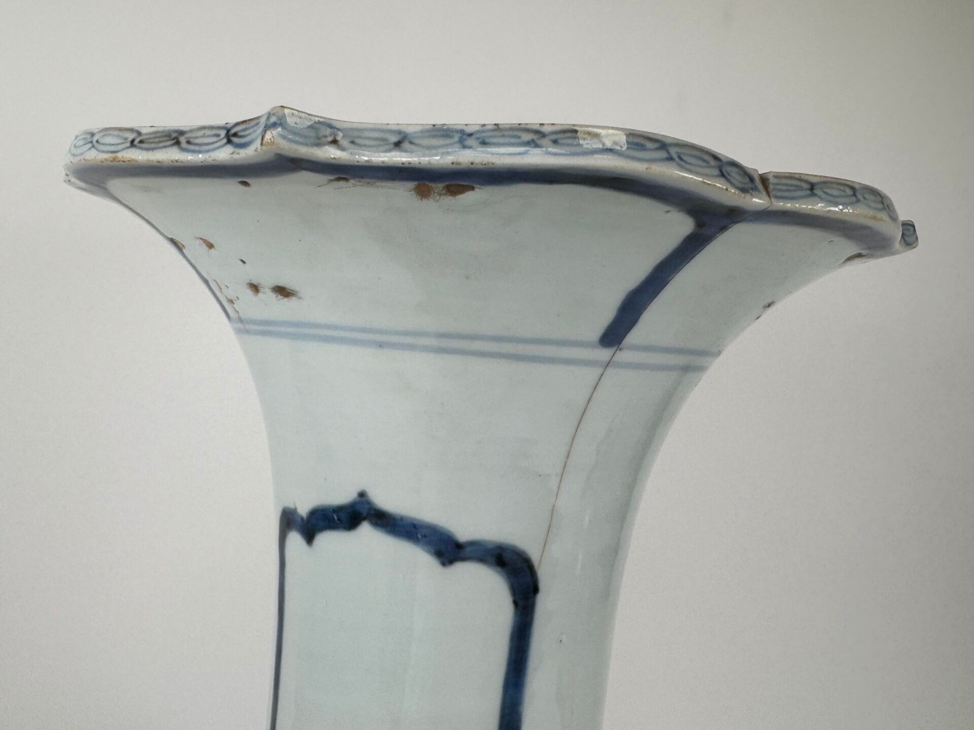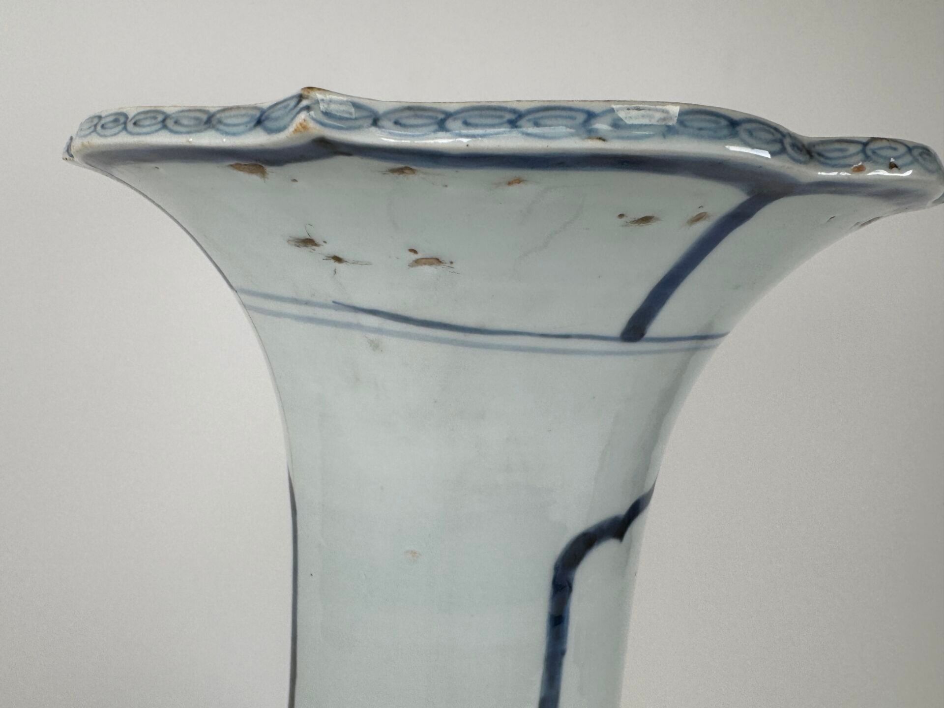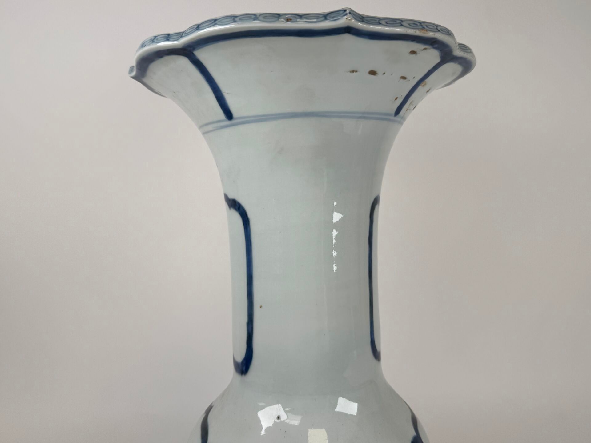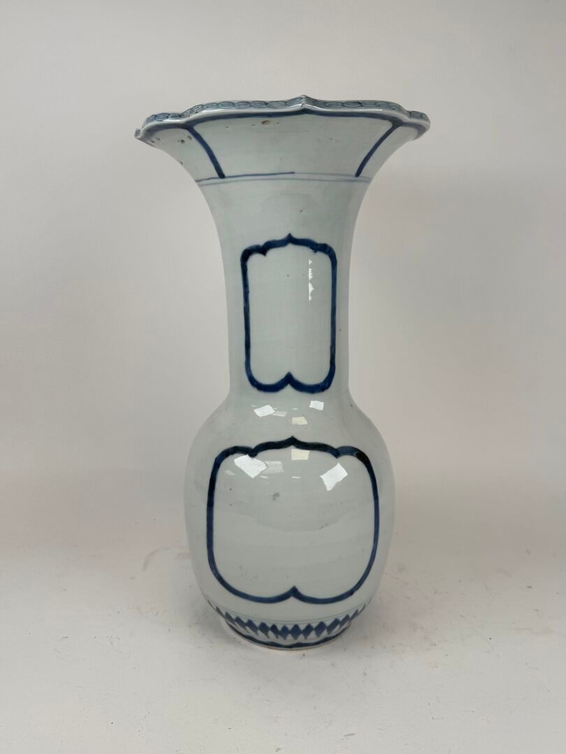 A large white and blue porcelain vase decorated with stylised motifs, with a scalloped neck.