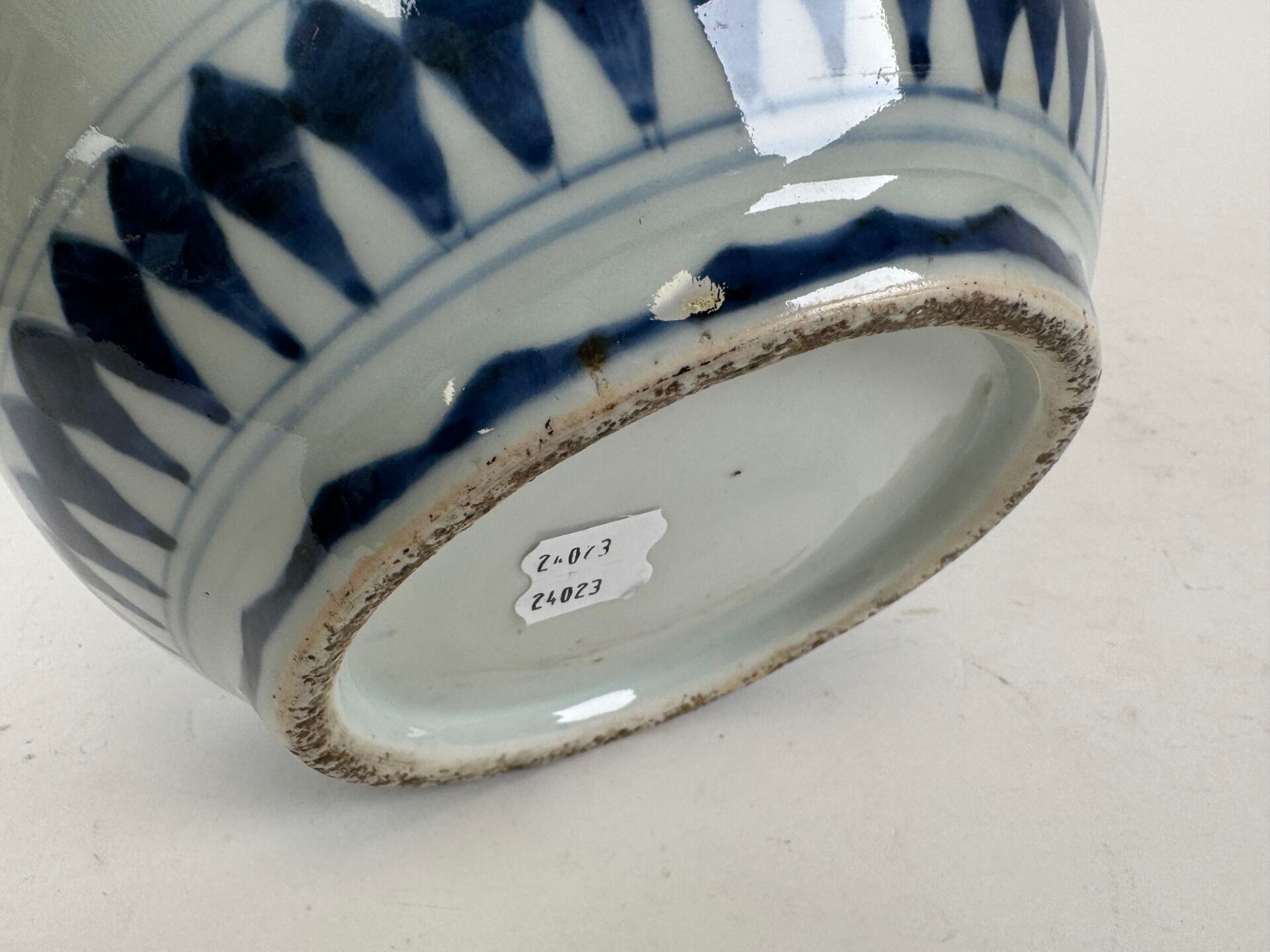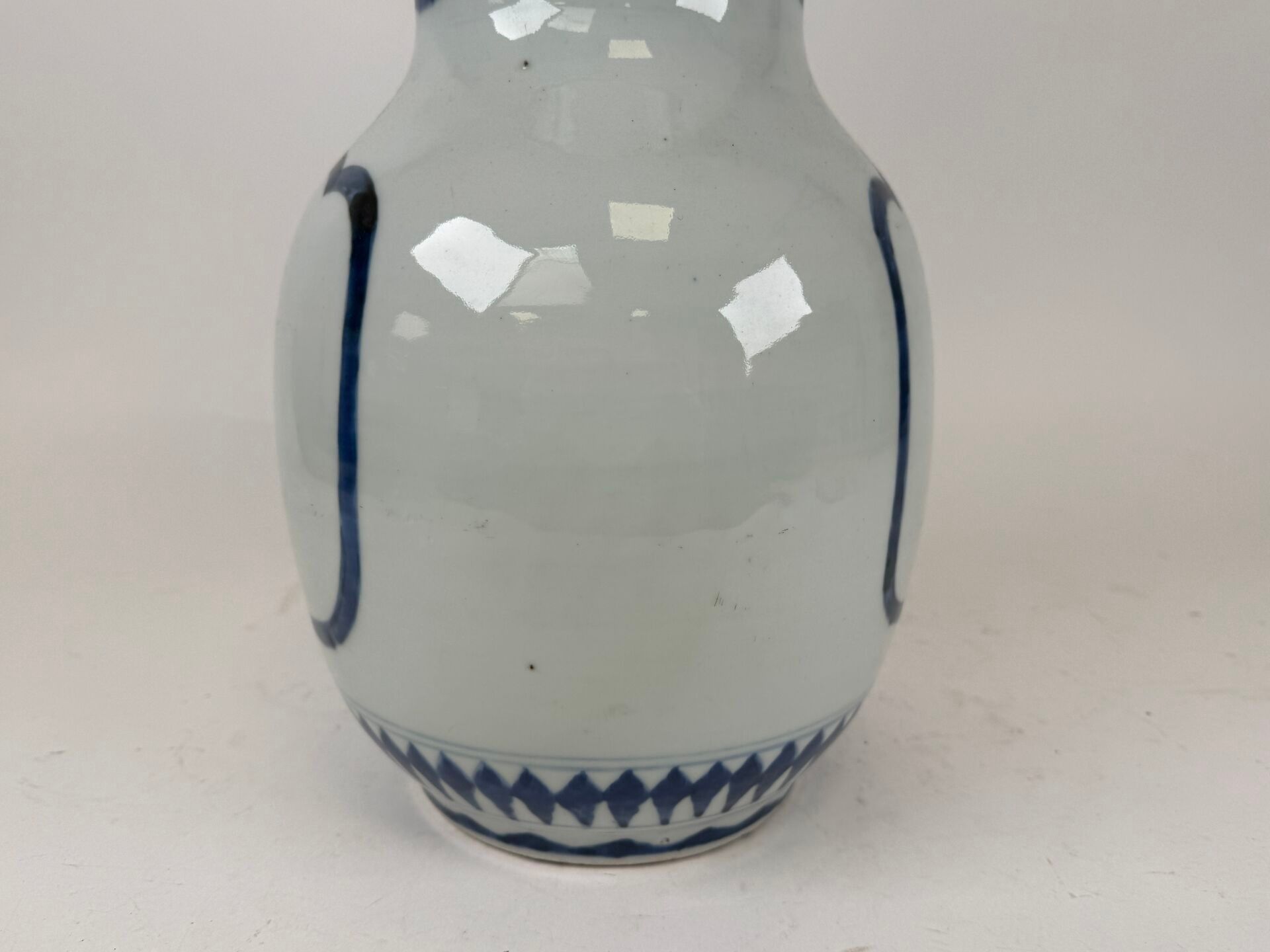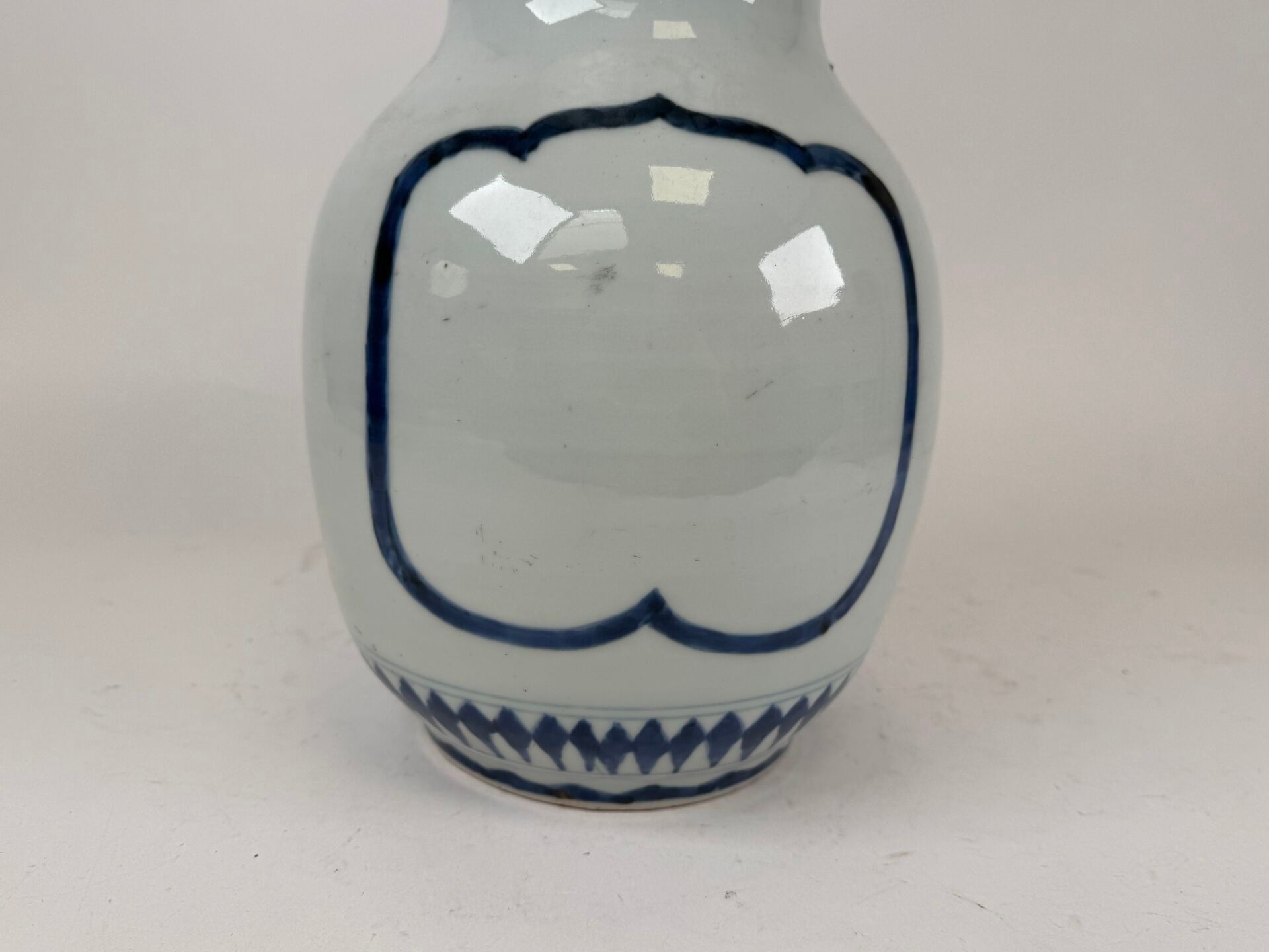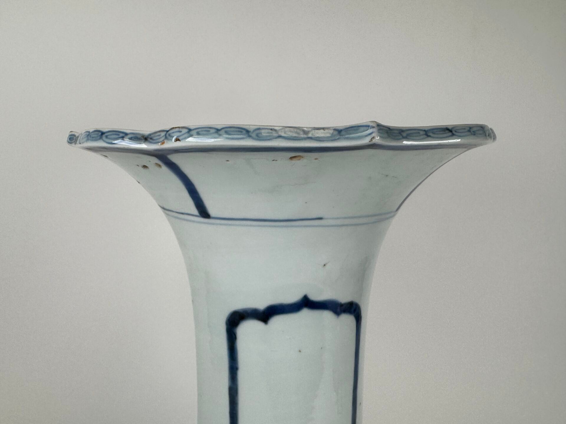 A large white and blue porcelain vase decorated with stylised motifs, with a scalloped neck.