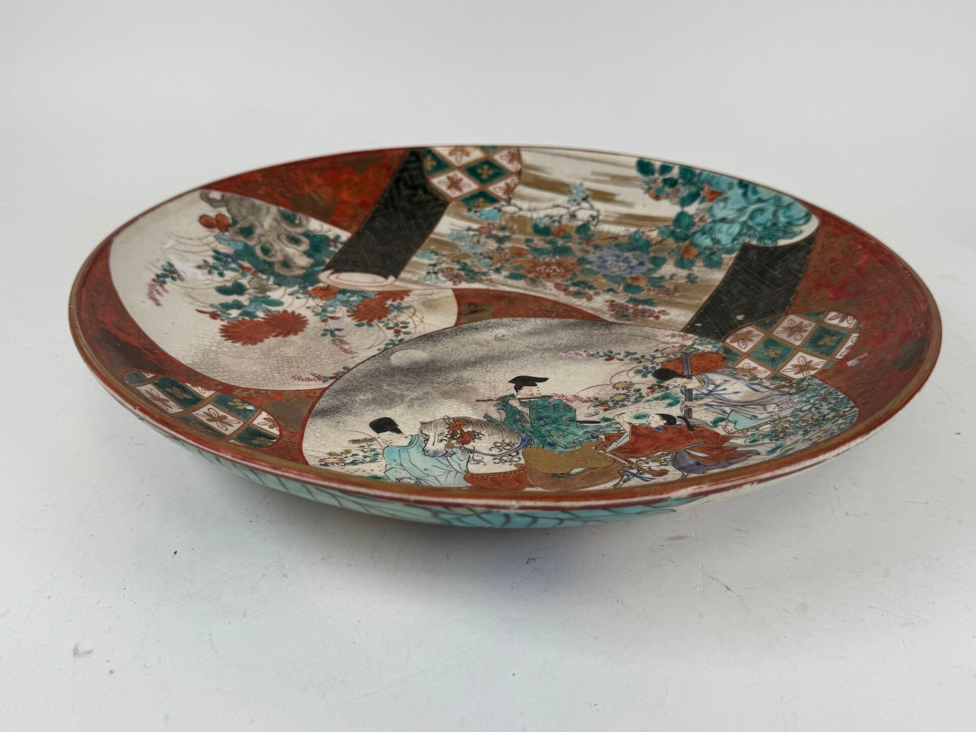 A large circular dish in polychrome and gold porcelain decorated with animated characters, flowers and foliage.