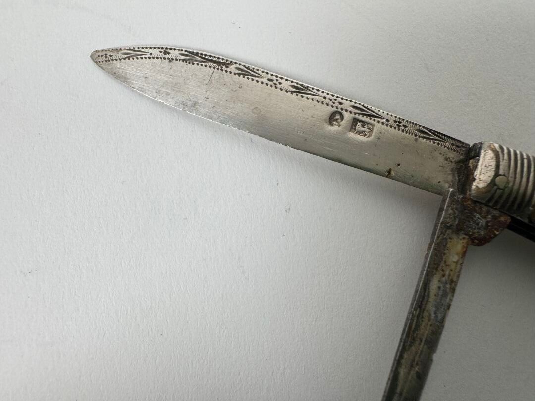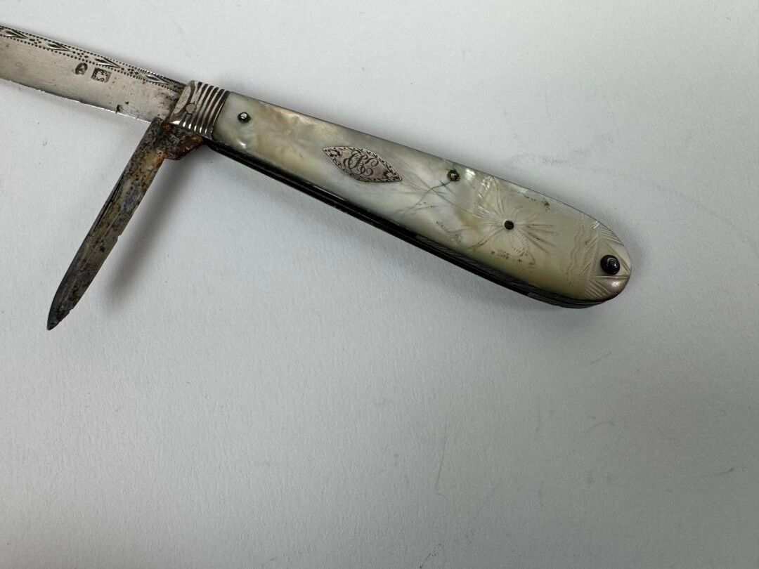 Small pocket knife with silver and metal blade, the mother-of-pearl plates with chased decoration and decorated with a numbered cartouche.