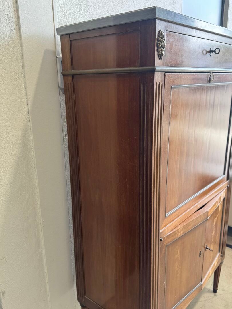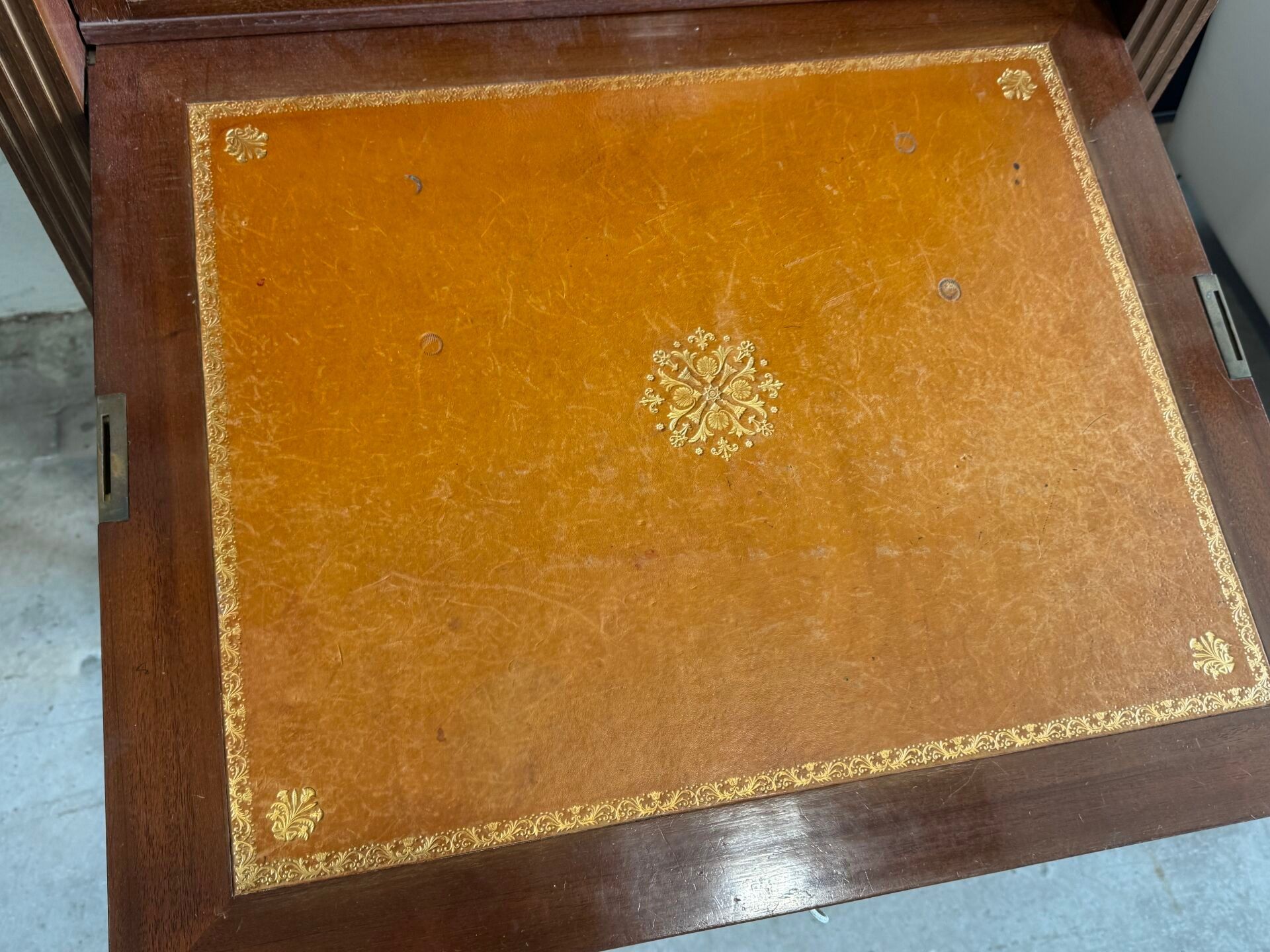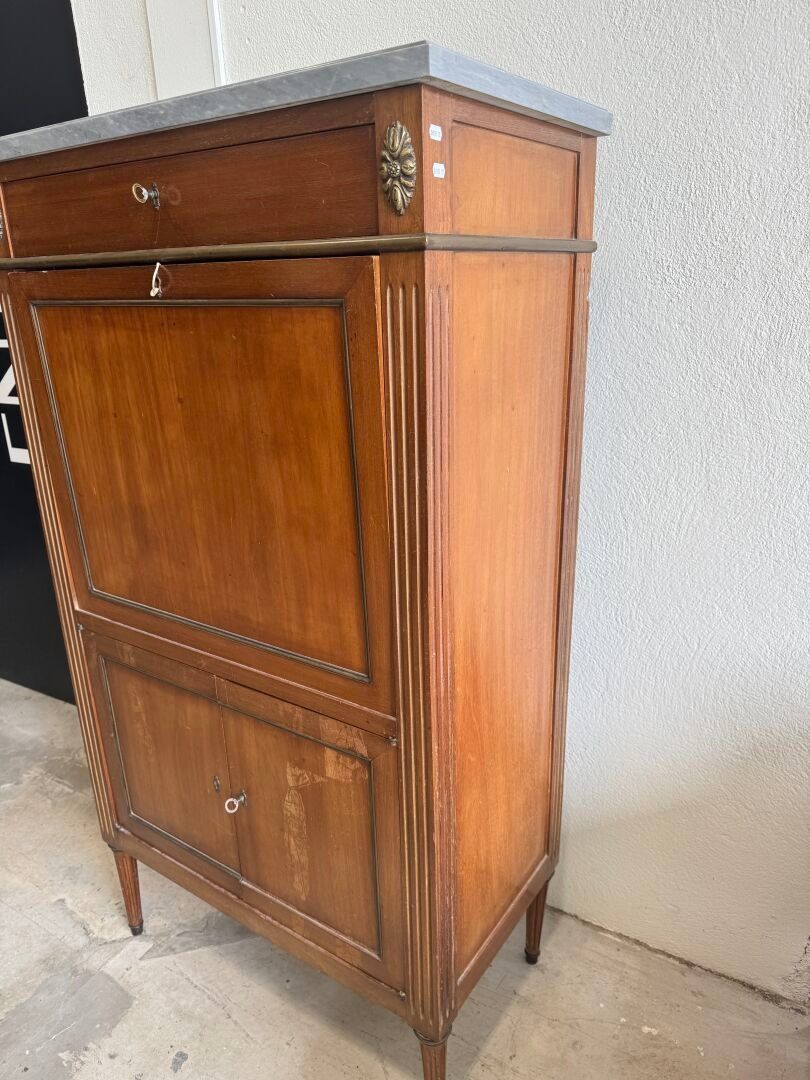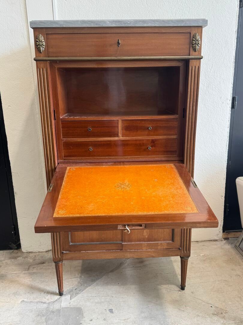 Straight blond mahogany veneered writing desk opening with a drawer, a flap and two doors in the lower section, fluted legs and uprights. Sainte-Anne grey marble top. The interior forms a writing desk with a leather top revealing a niche and three drawers.