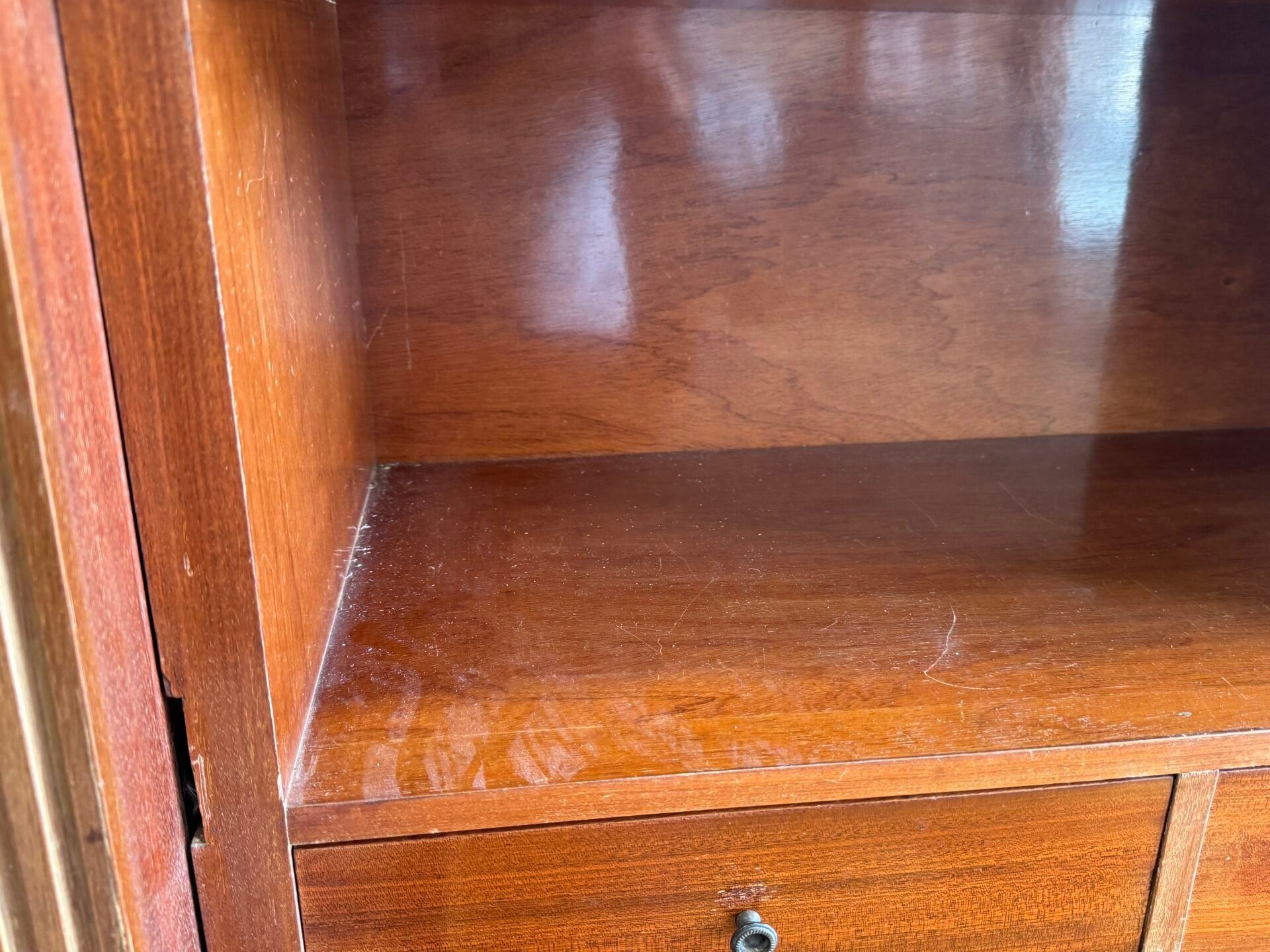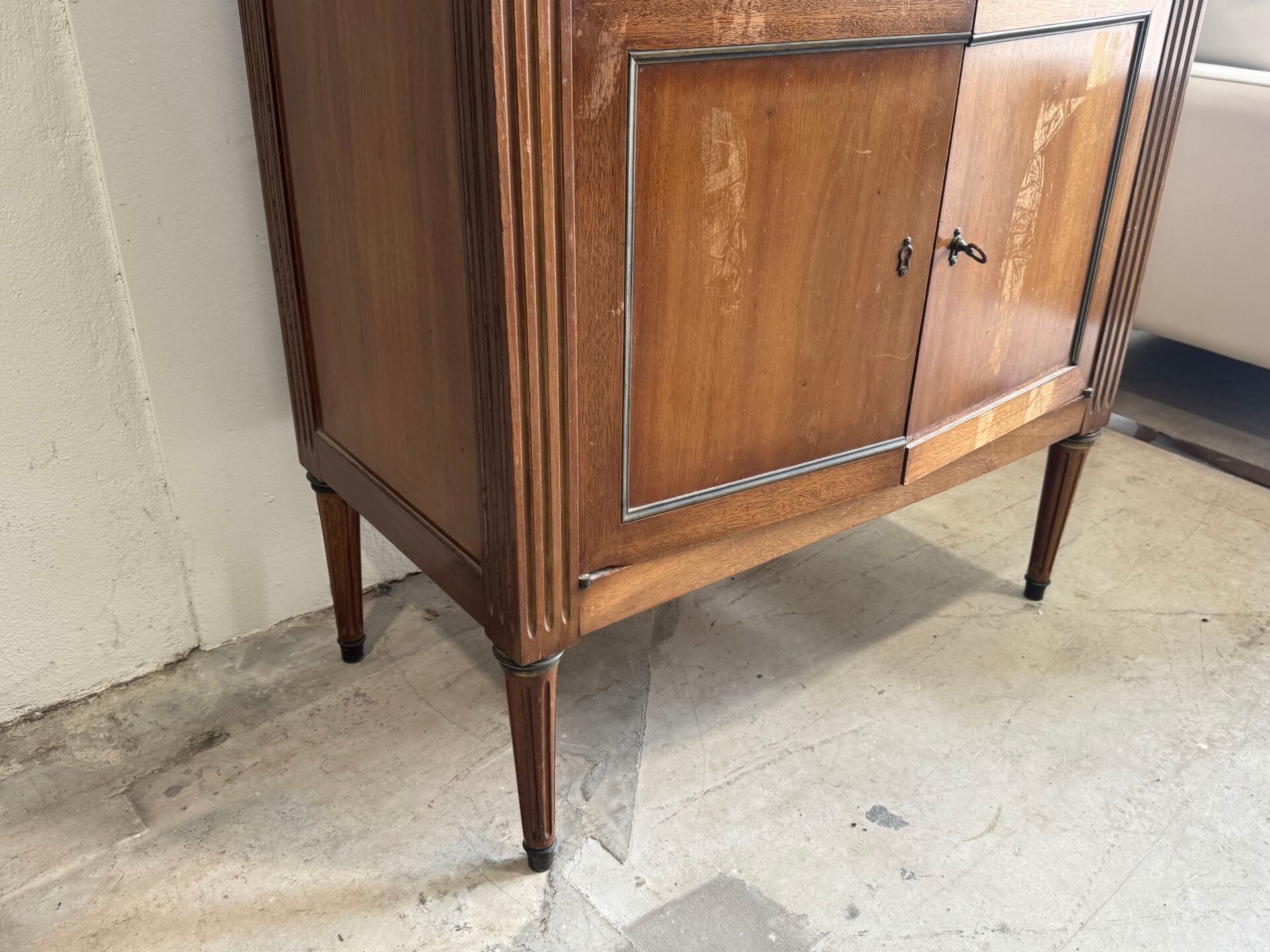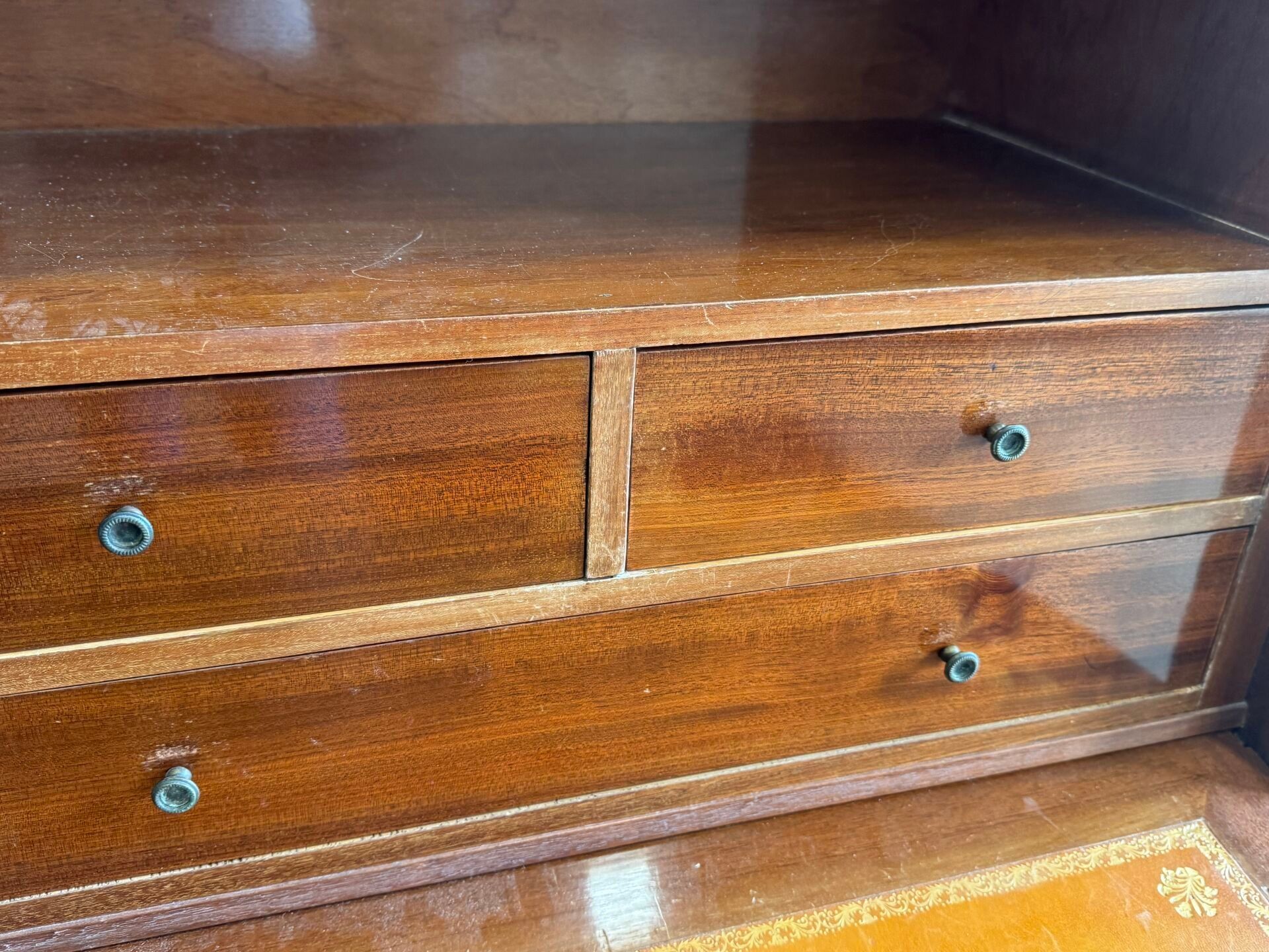 Straight blond mahogany veneered writing desk opening with a drawer, a flap and two doors in the lower section, fluted legs and uprights. Sainte-Anne grey marble top. The interior forms a writing desk with a leather top revealing a niche and three drawers.