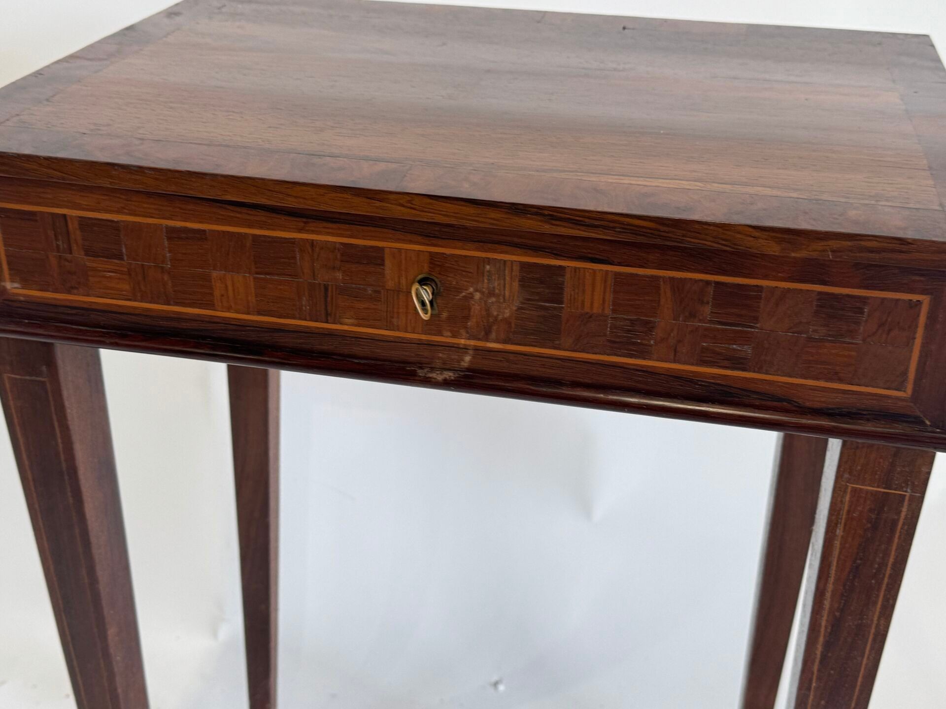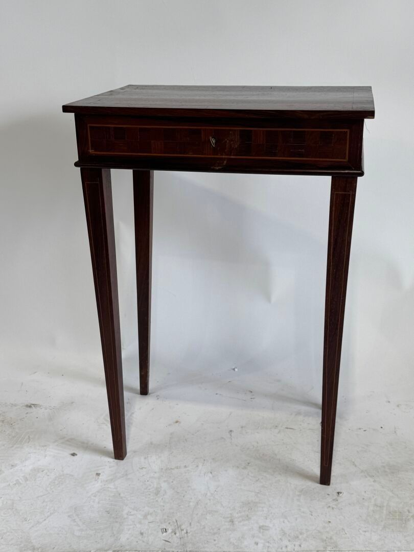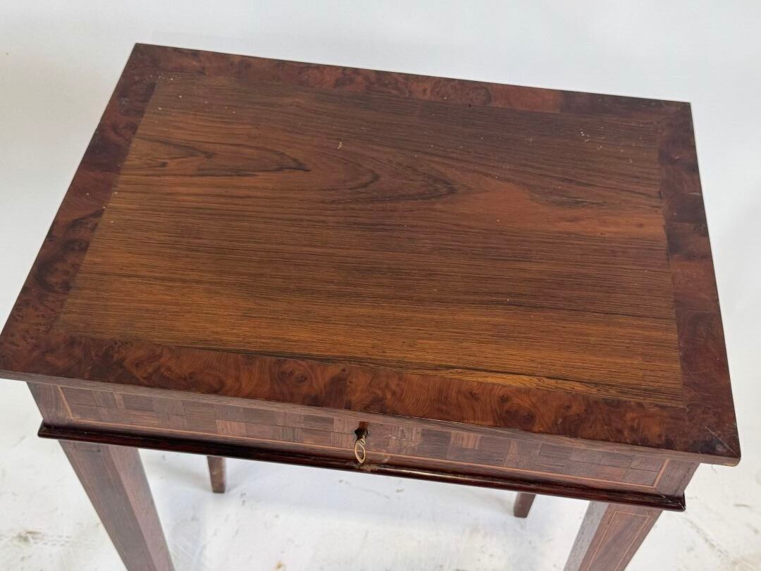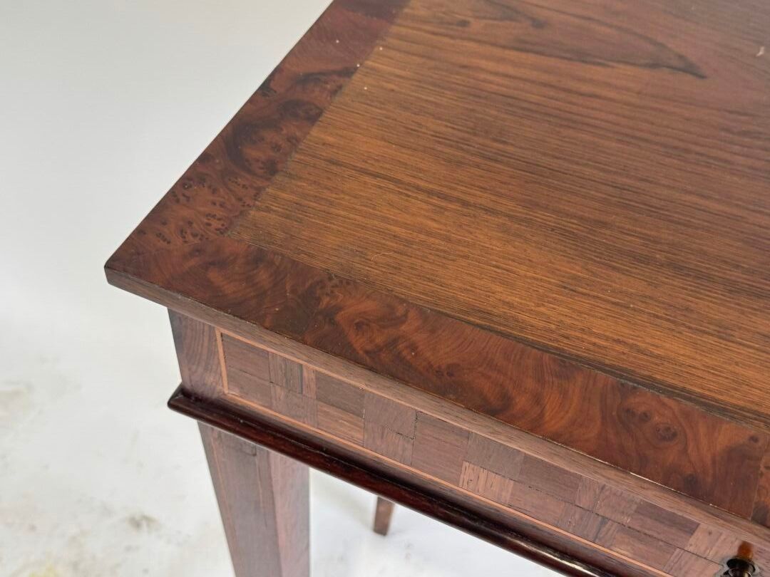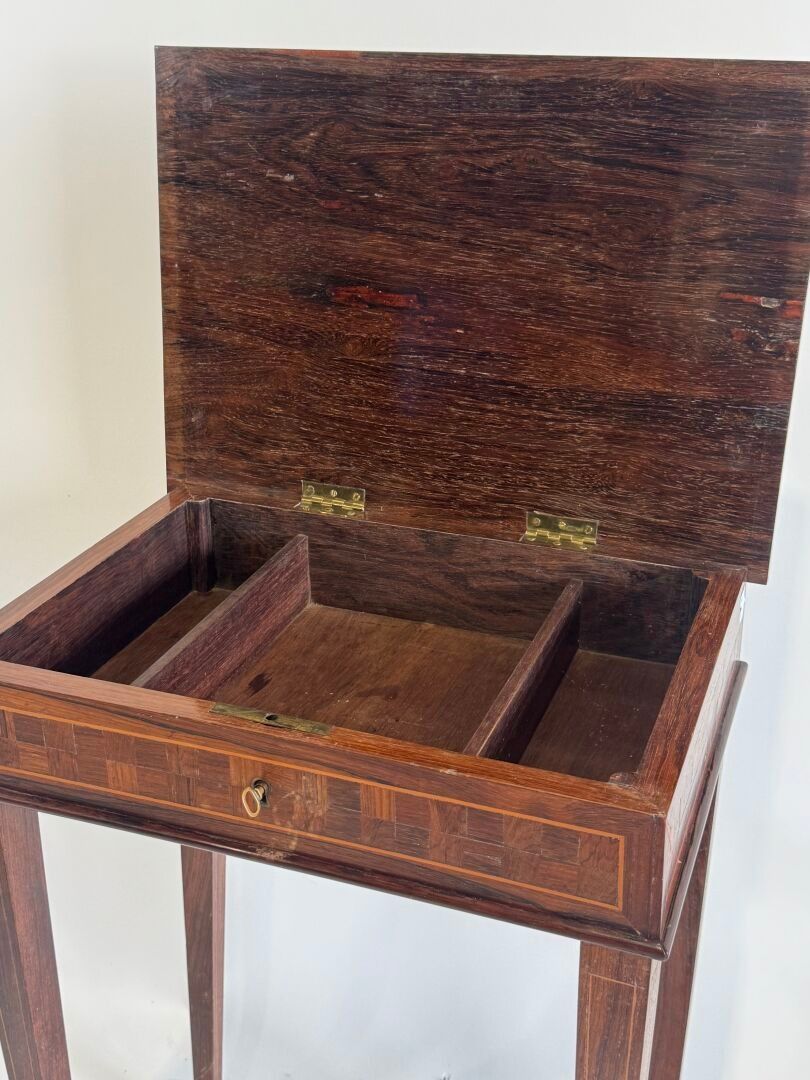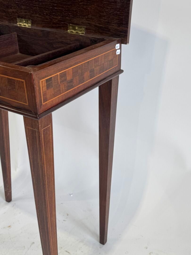 An exotic wood veneer chest of drawers with a flap opening to reveal a compartmented interior. The waistband is inlaid with a checkerboard pattern. The legs are sheathed and decorated with light fillets.