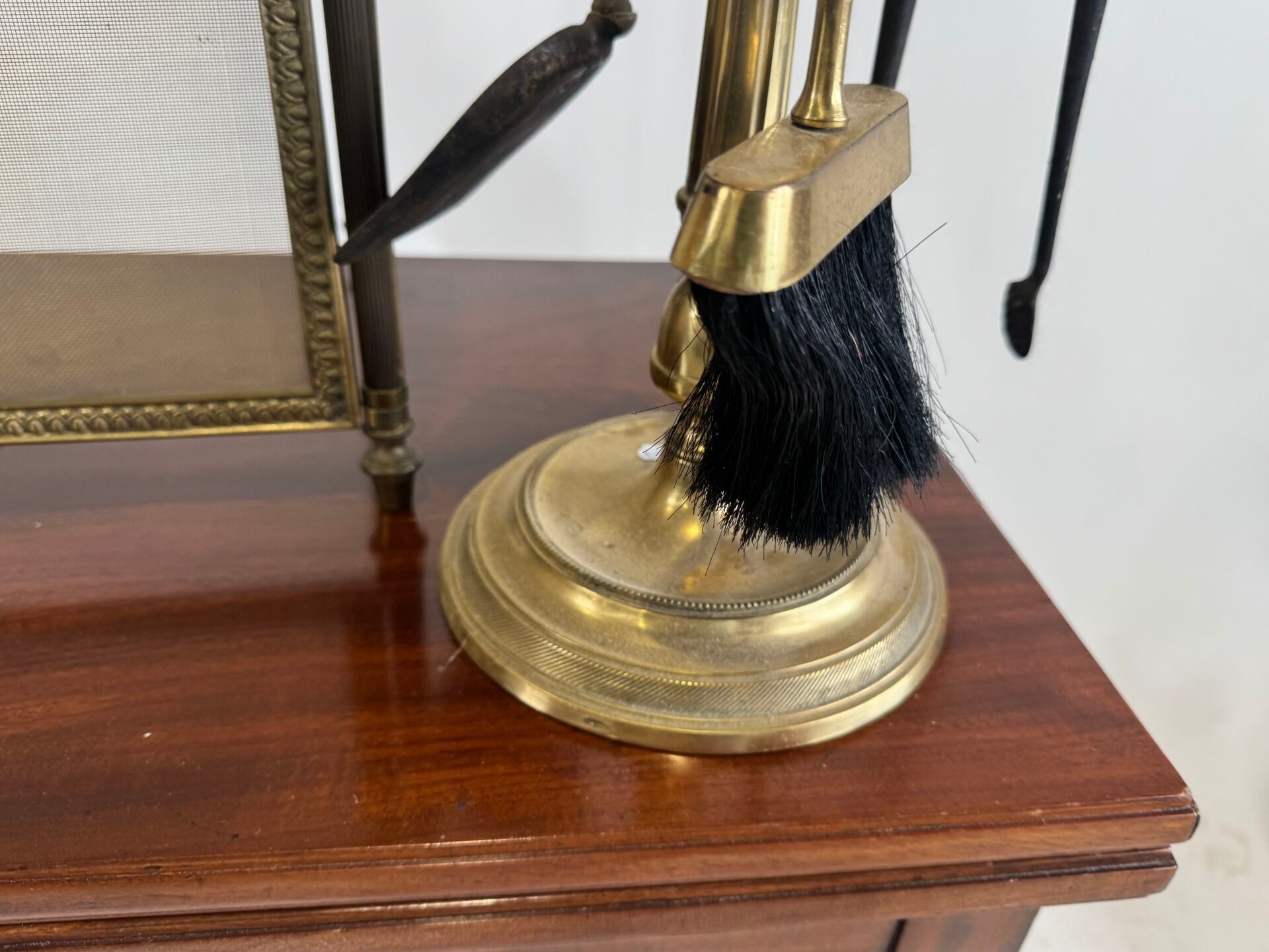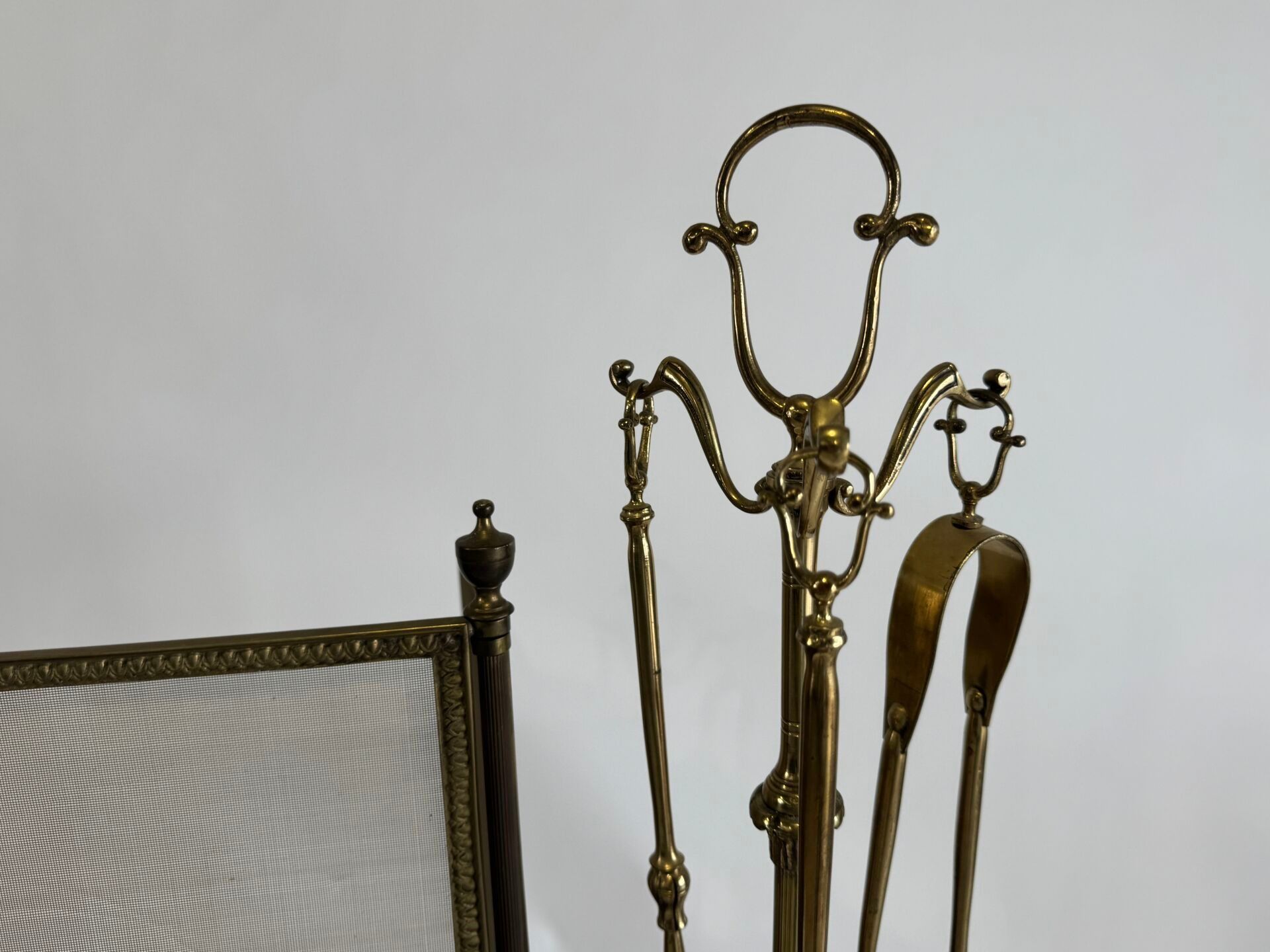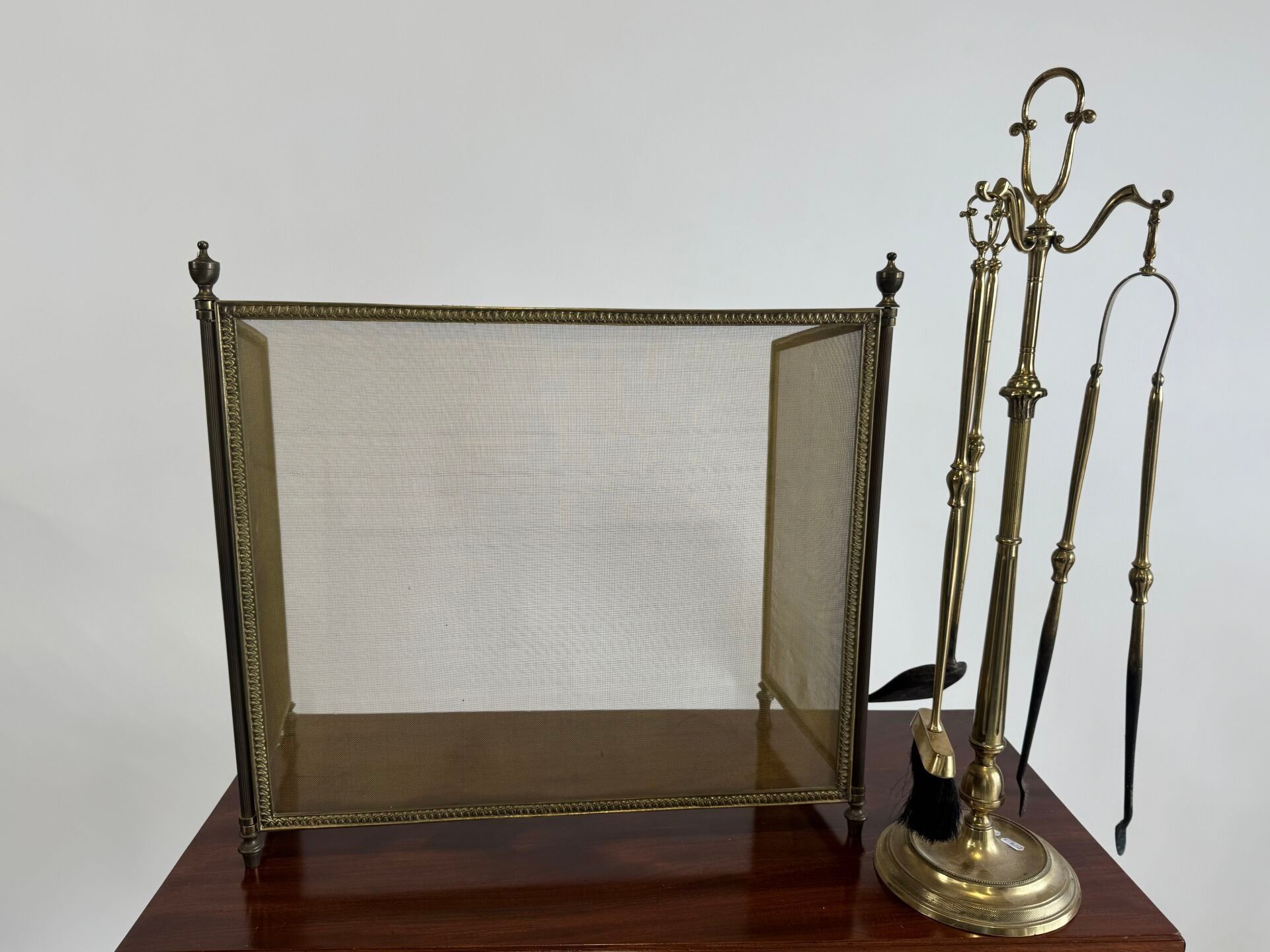 Brass fireplace set comprising a three-leaf fire screen and a display stand with dustpan, tweezers and brush.