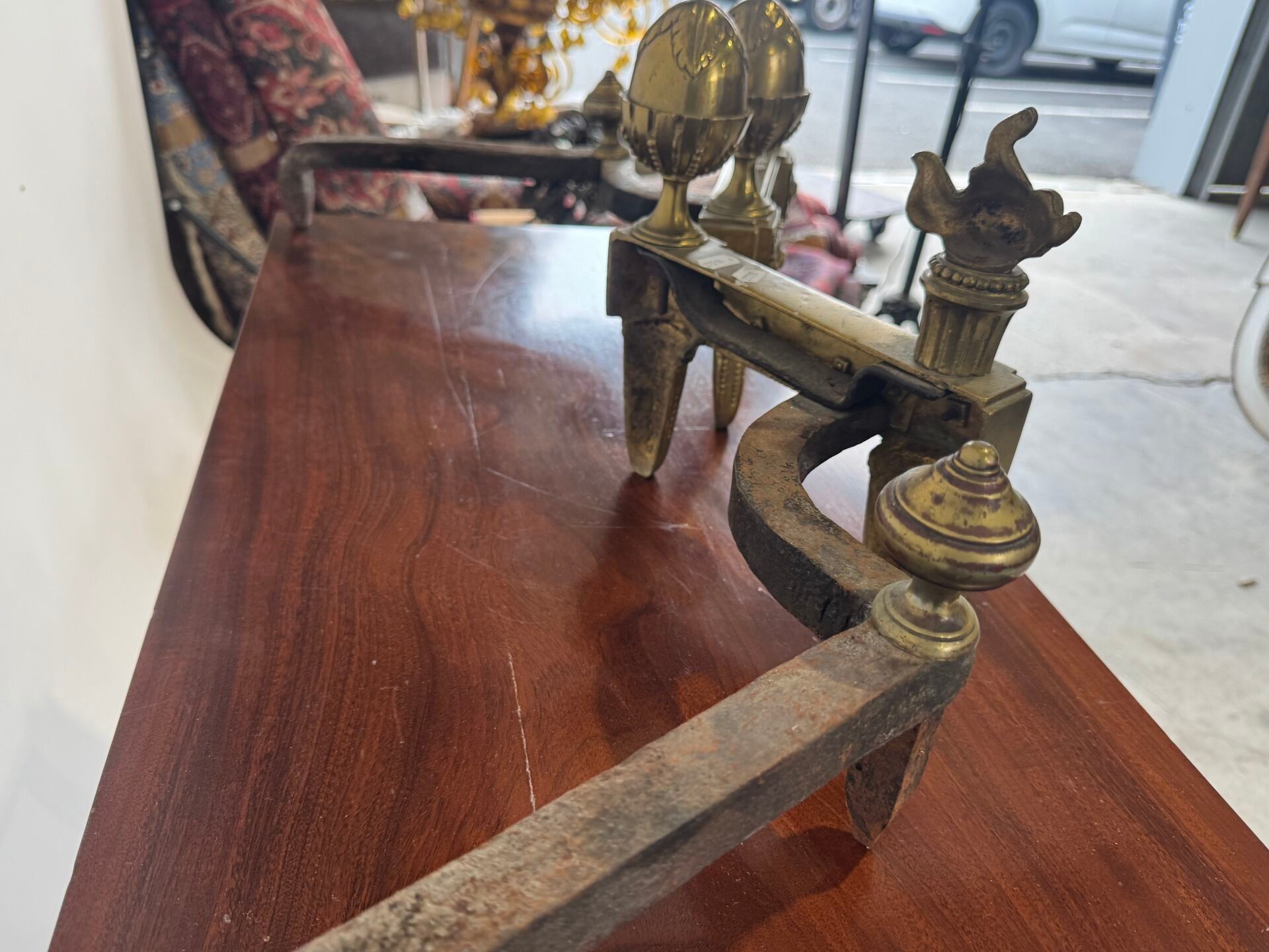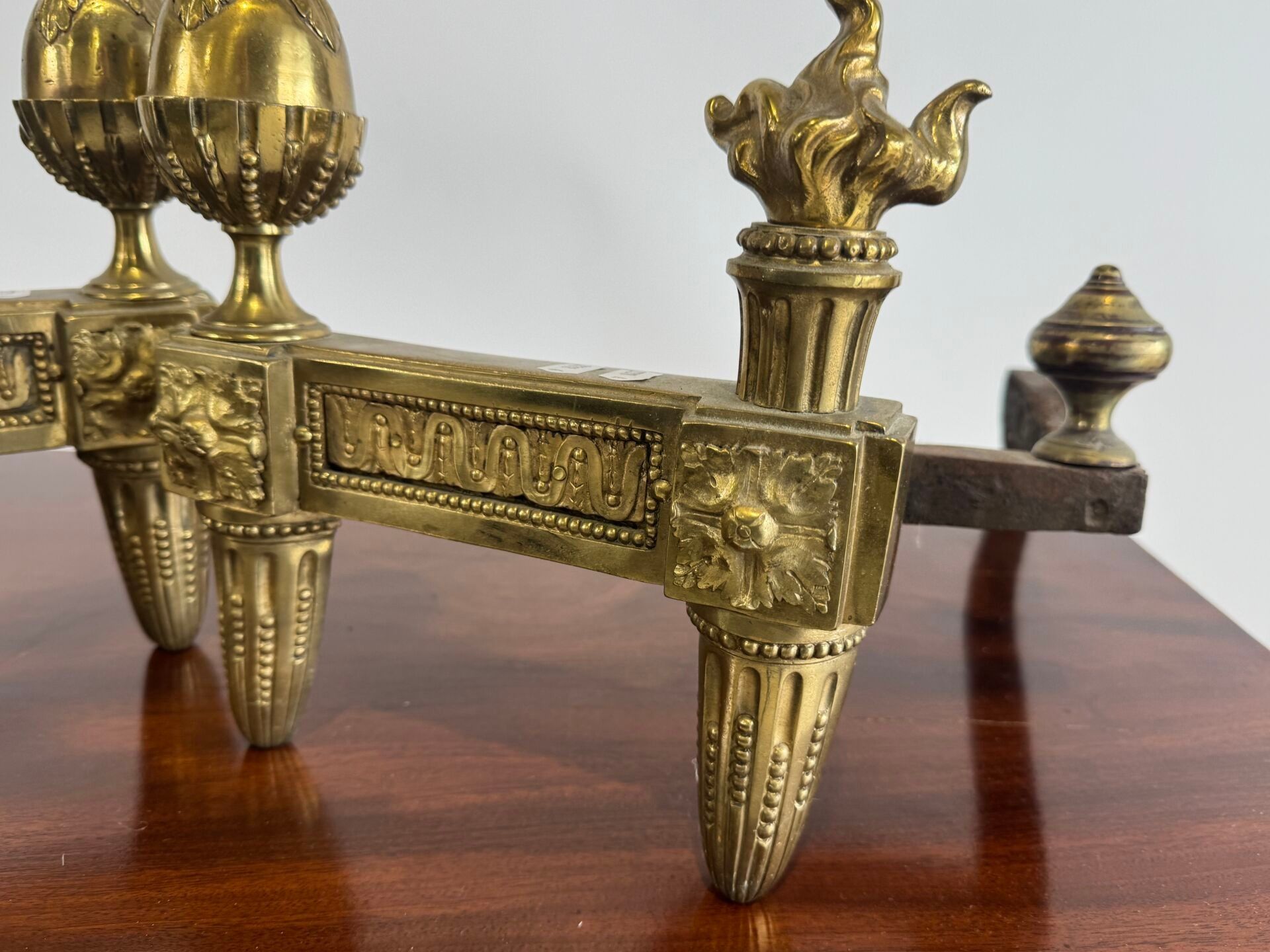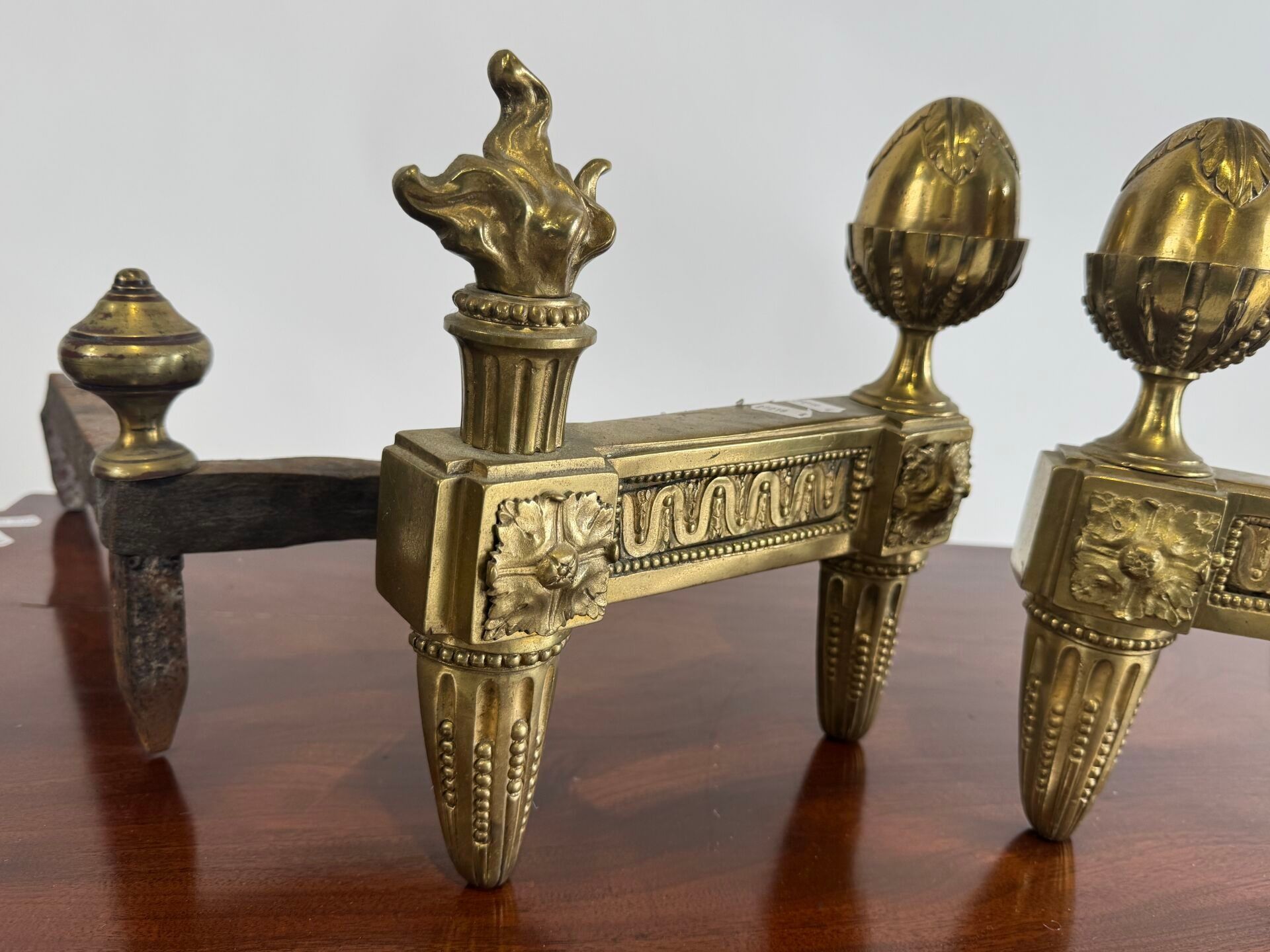 A pair of chased gilt bronze and iron andirons decorated with fire pots and pine cones. The legs are decorated with rows of pearls.