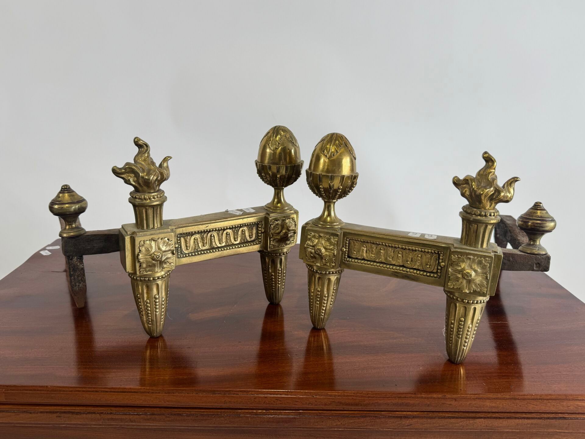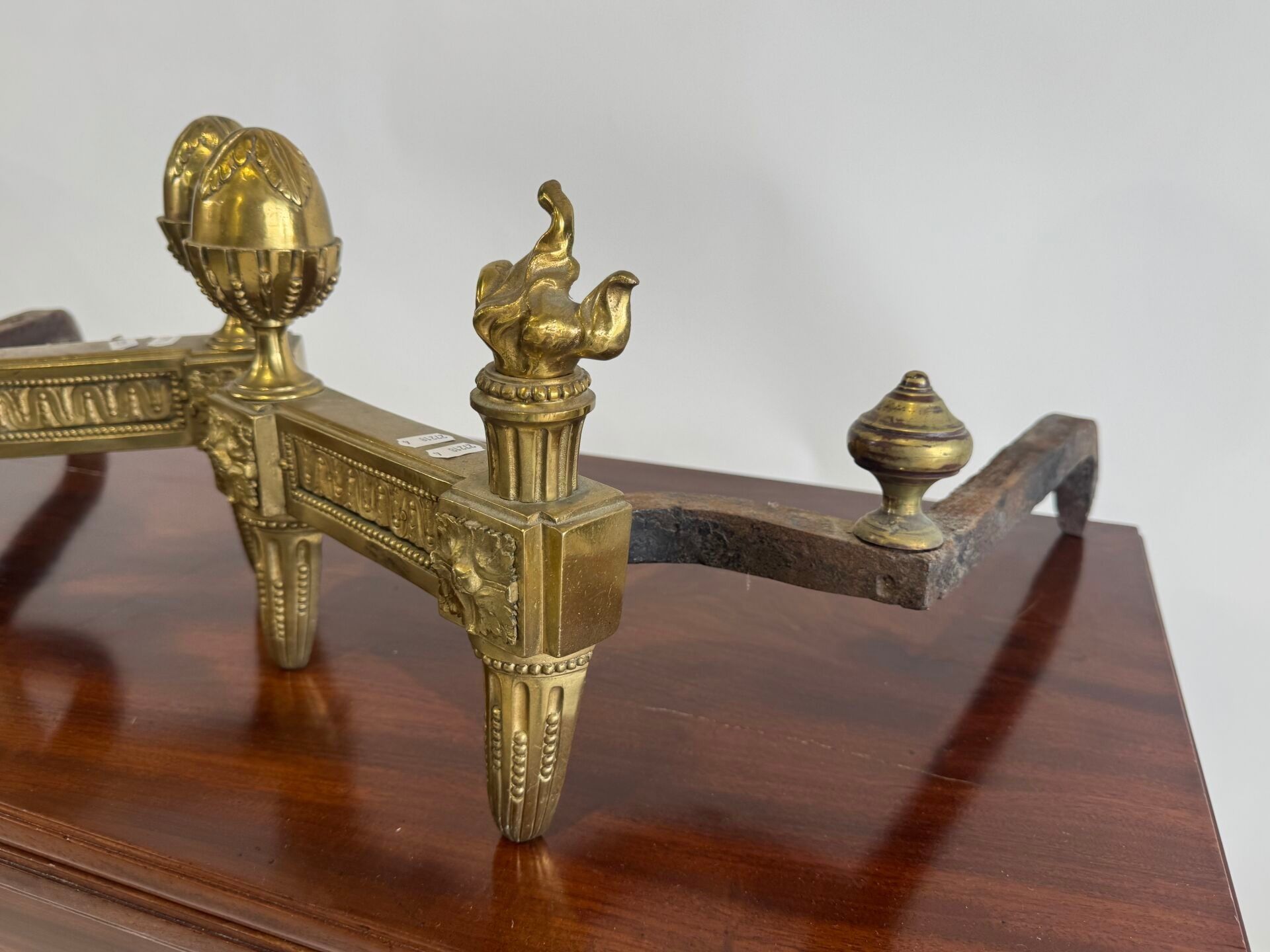 A pair of chased gilt bronze and iron andirons decorated wit…
