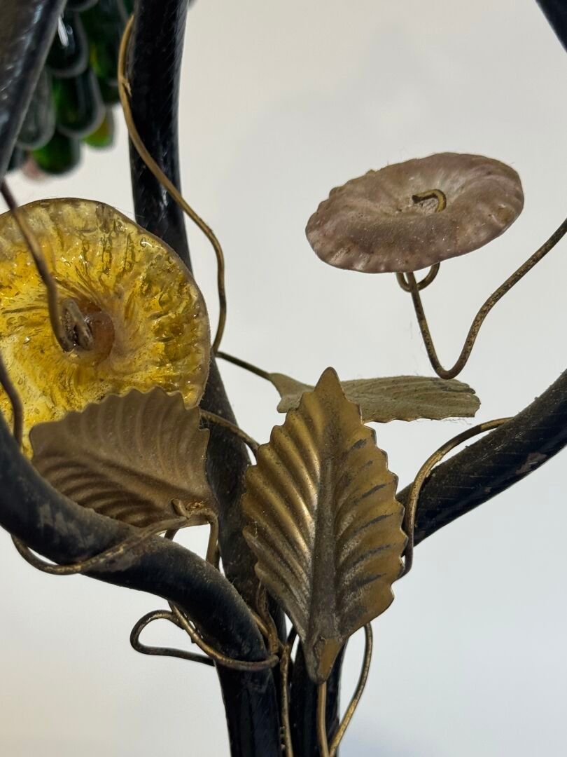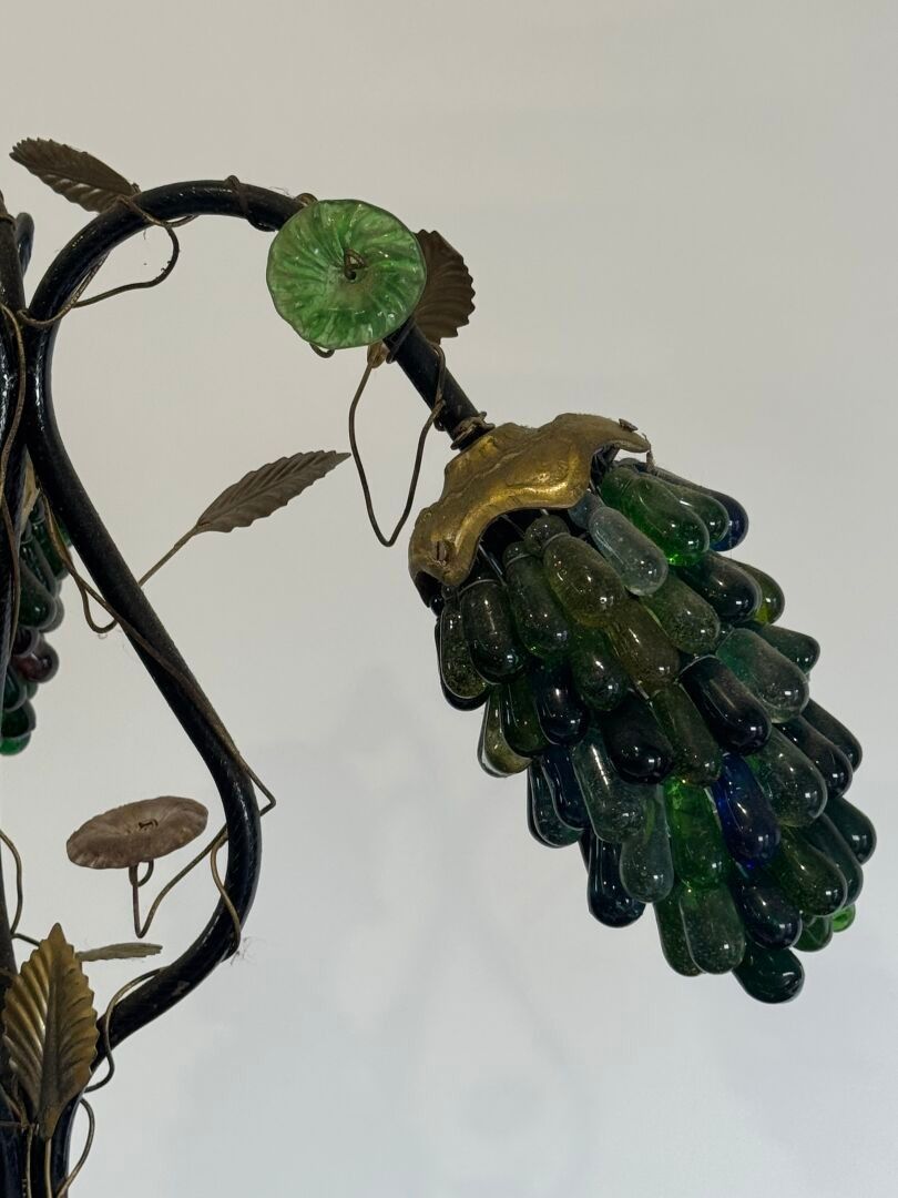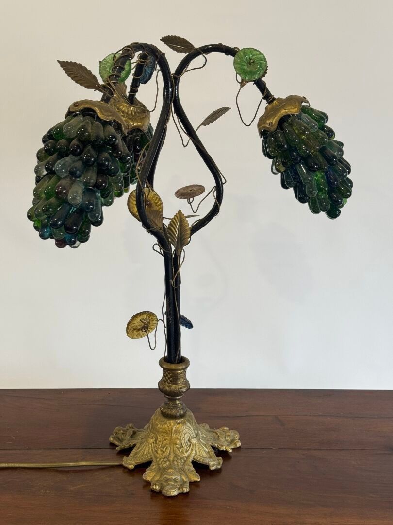 Table lamp in bronze, brass and coloured glass with three lights decorated with pampres.