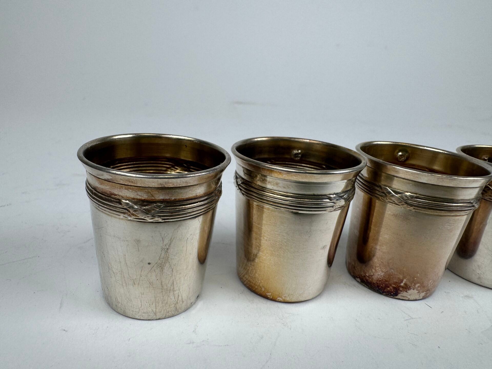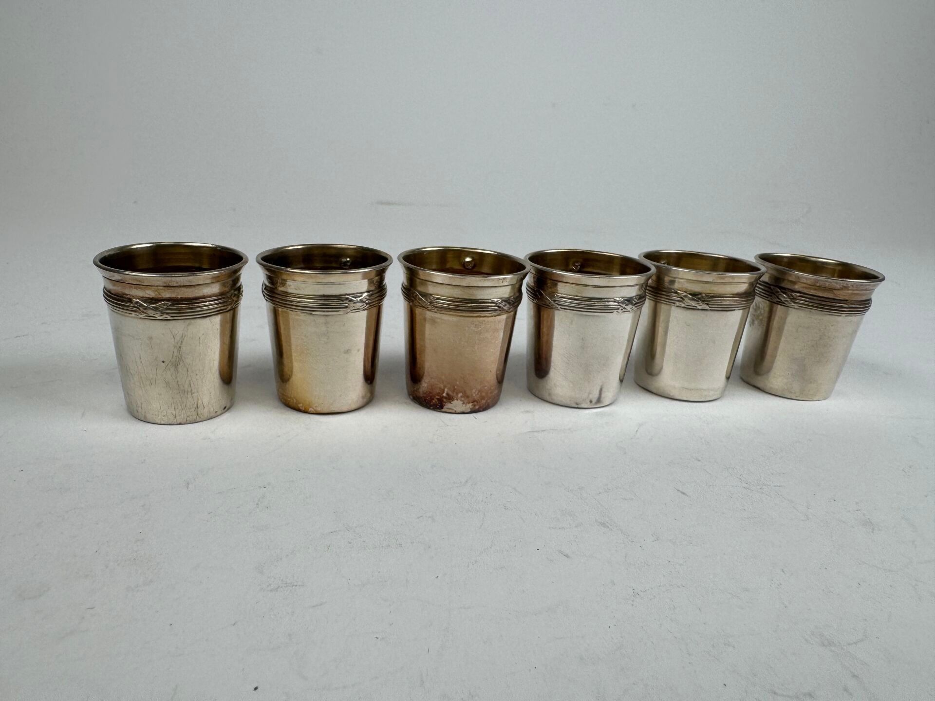 Six 950/1000 silver liqueur glasses, decorated with ribboned lines.