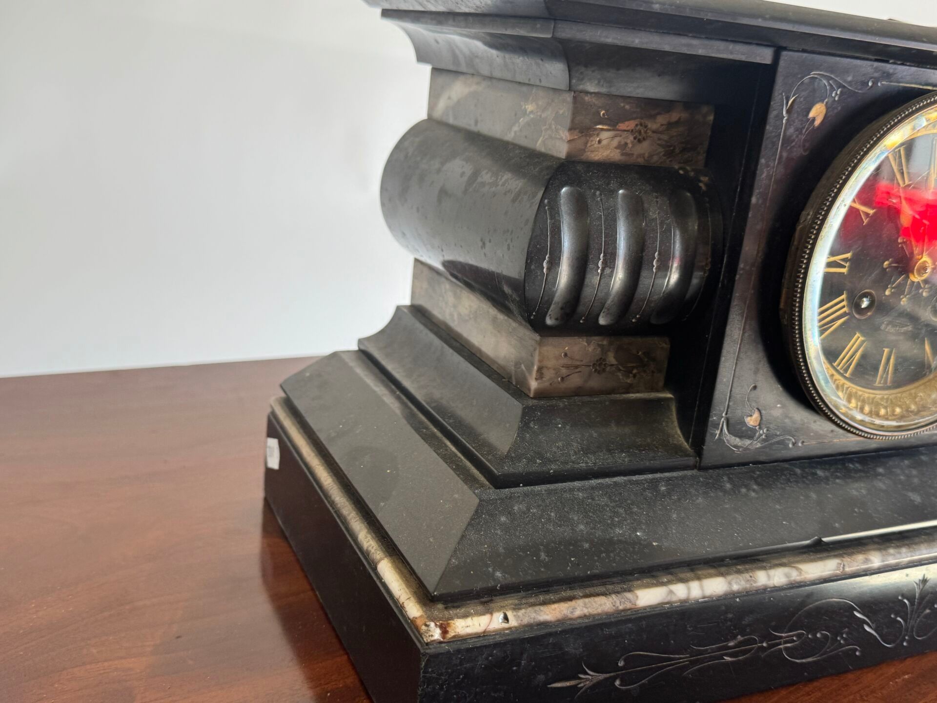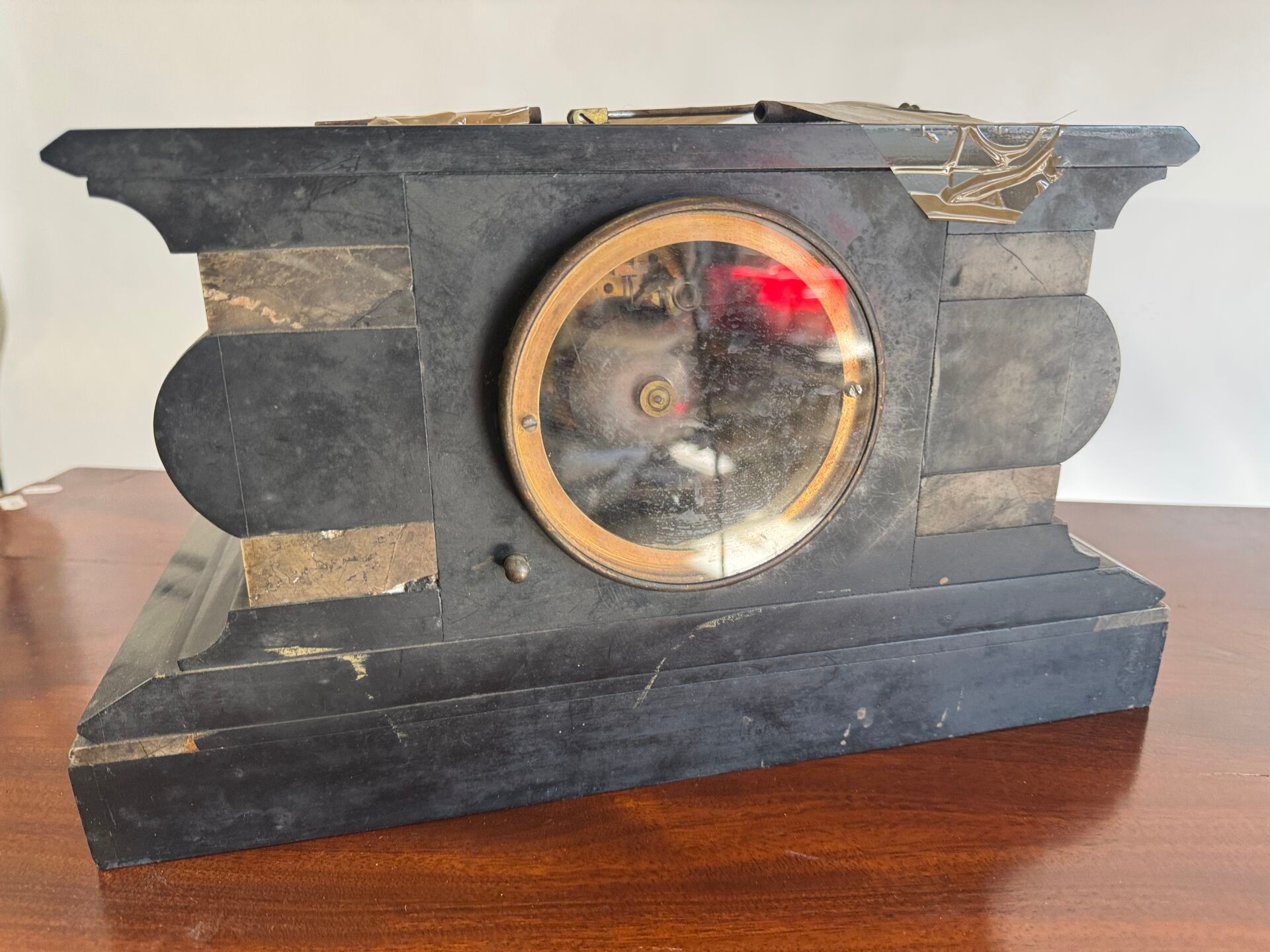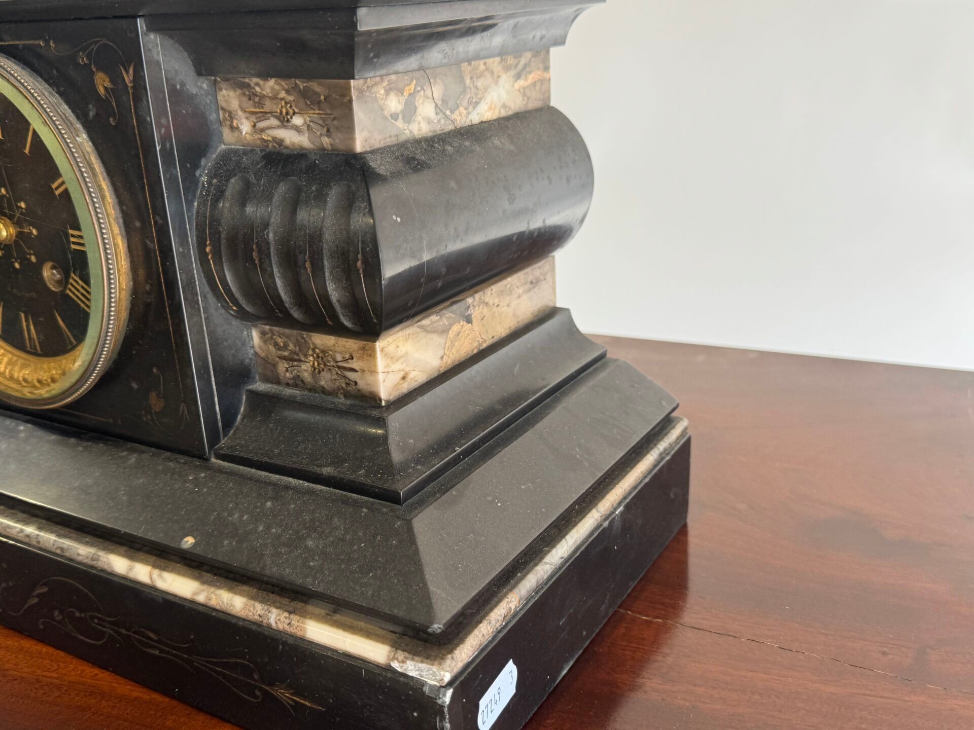 Black marble terminal clock, the black and gilt enamelled dial with Roman numerals, with two winding squares, signed. Openwork star wheel mechanism, blade suspension and signed JAPPY Frères.