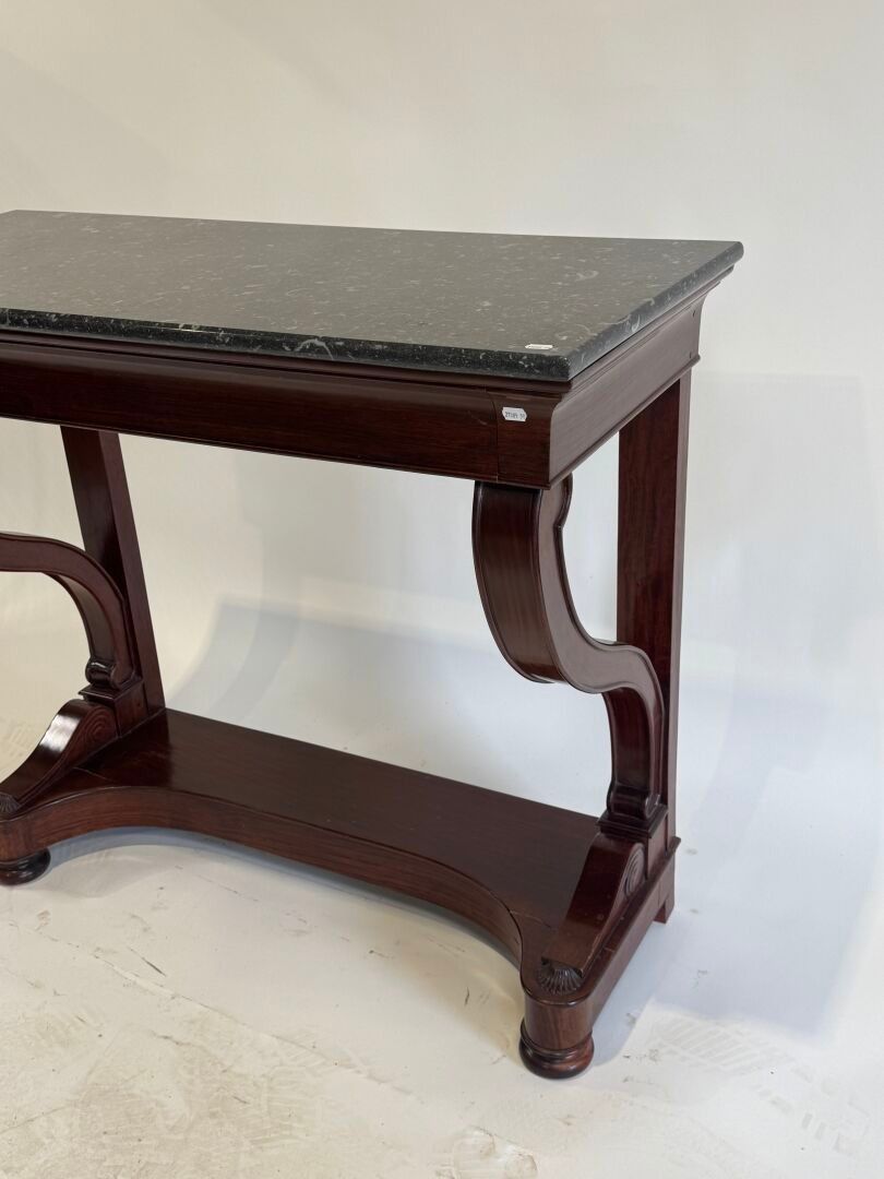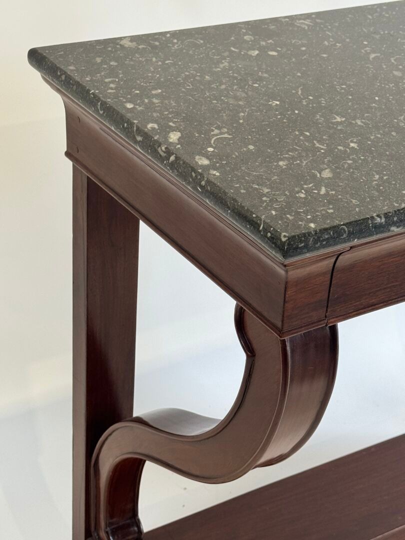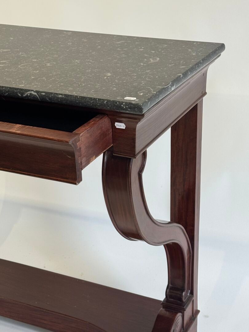 A moulded and carved mahogany console table opening with a drawer in the waist, grey marble top, the uprights ending in a console on a plinth.
