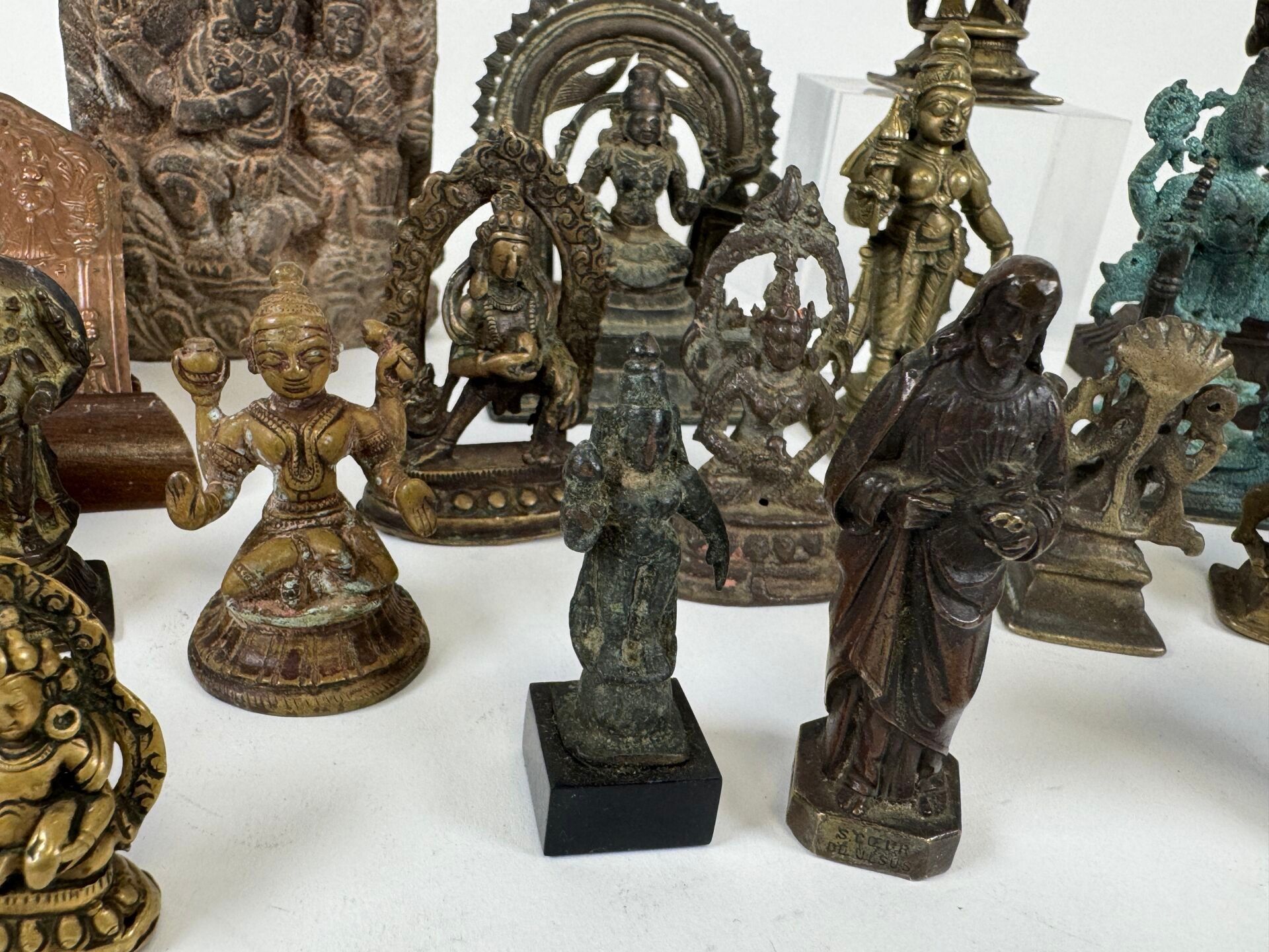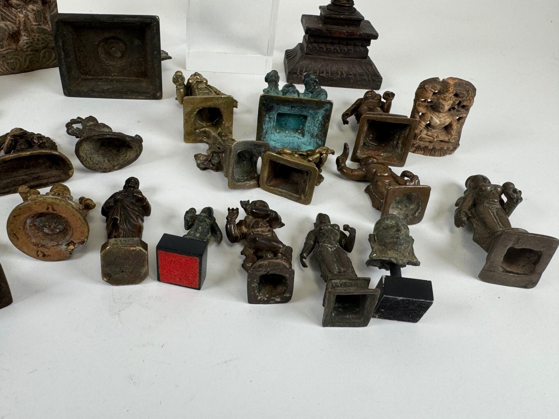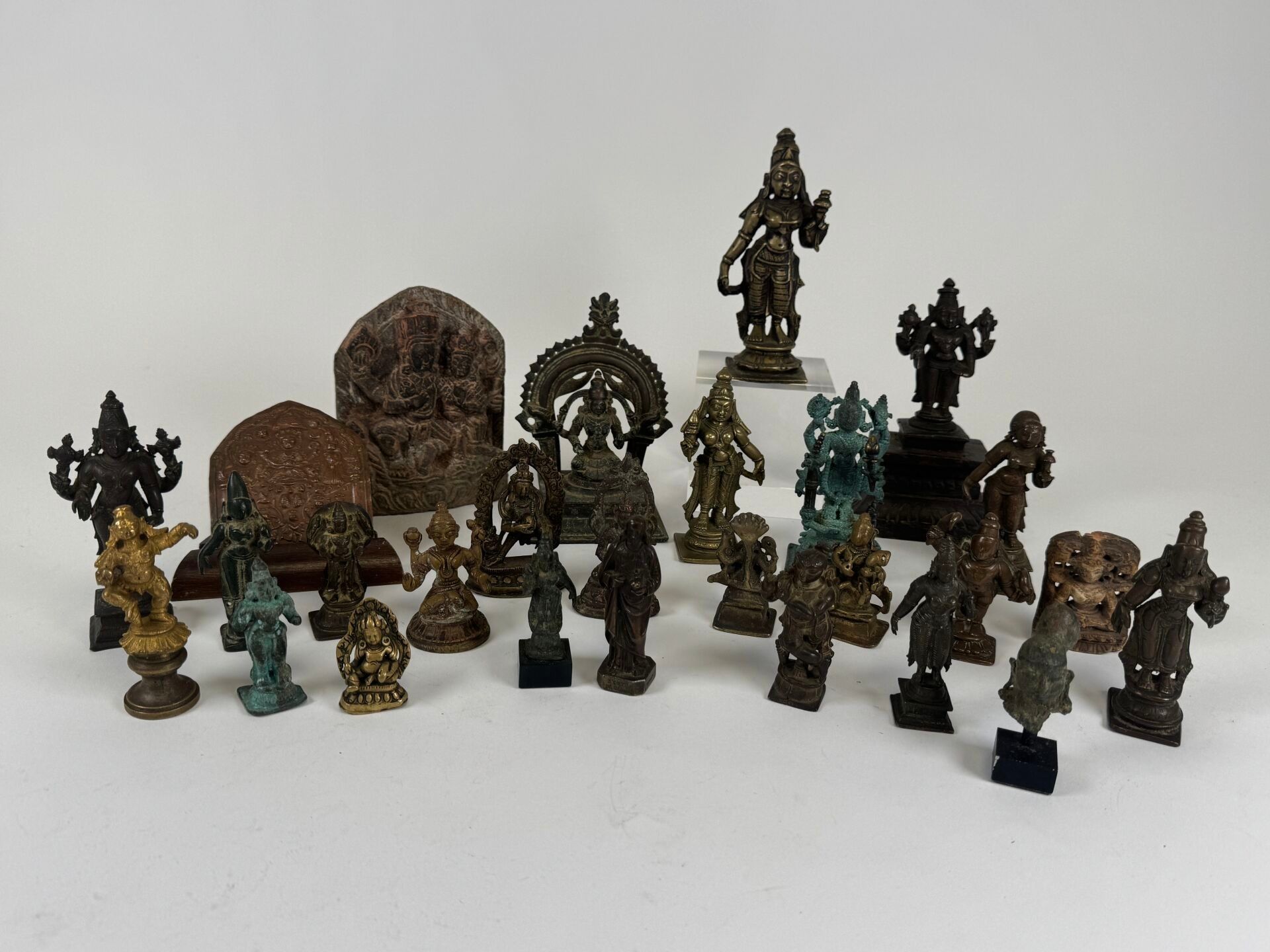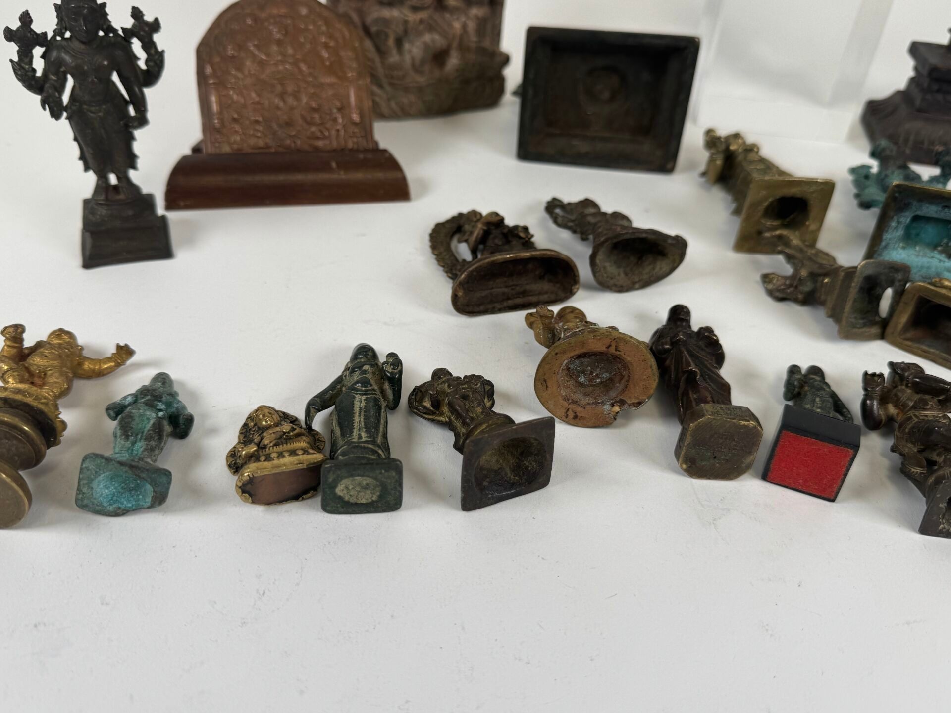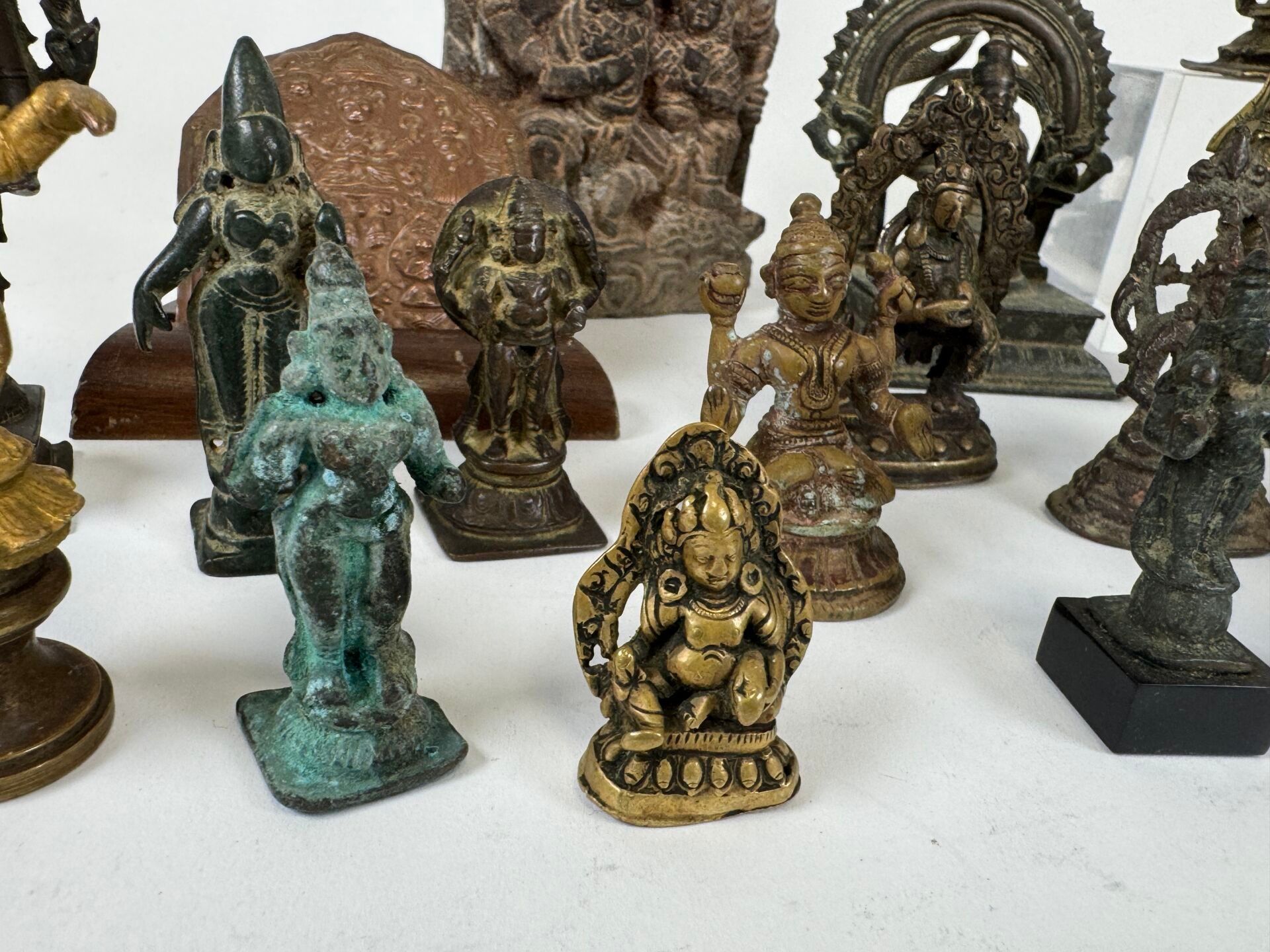 Collection of 26 statuettes or decorative travel items, various materials including bronze, copper alloy, etc...