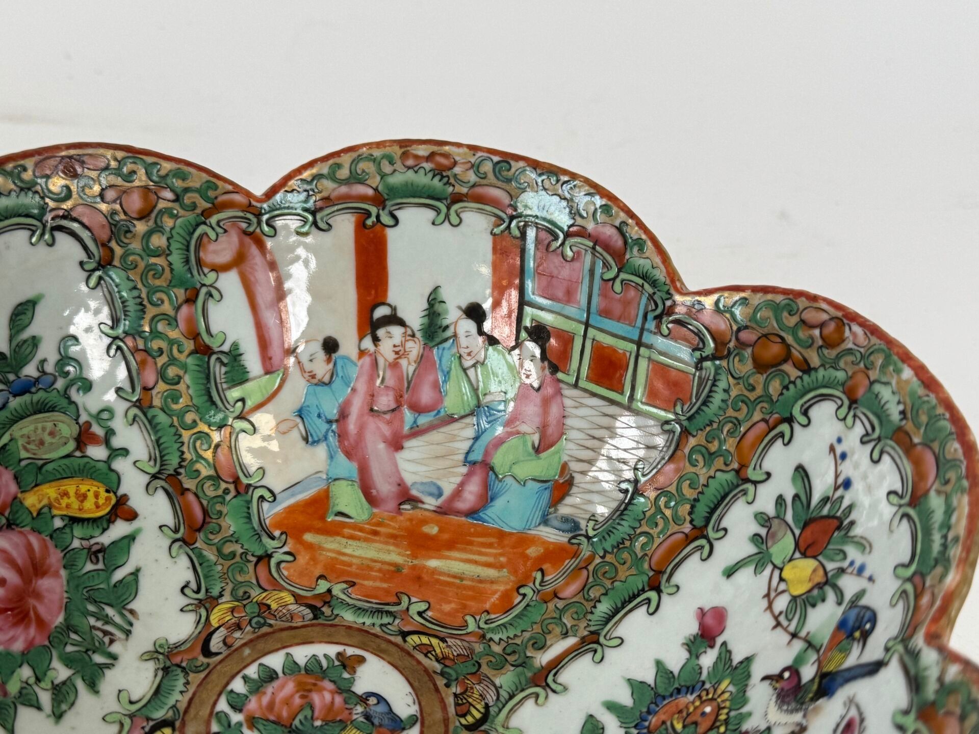 A polychrome porcelain salad bowl decorated with cartouches of animated scenes.