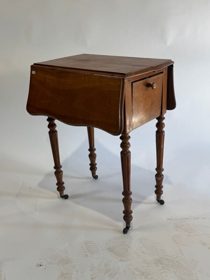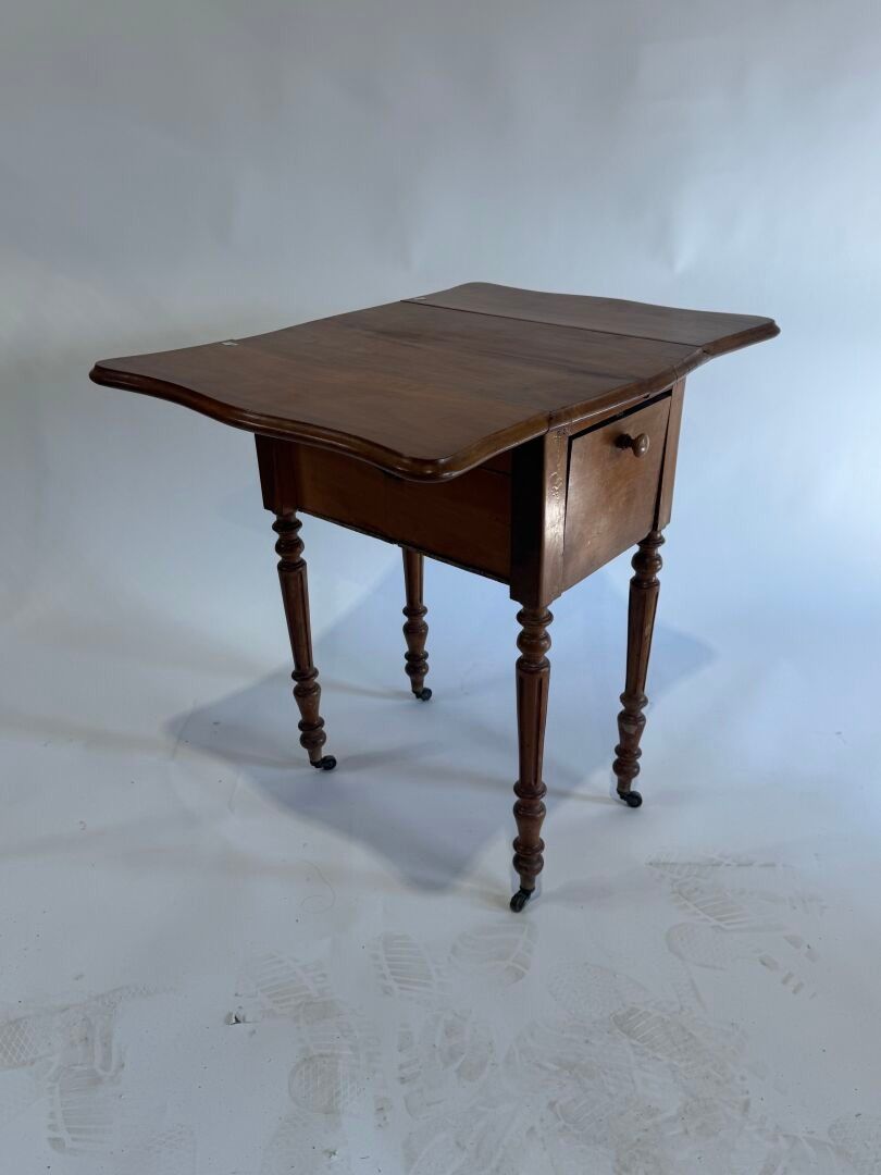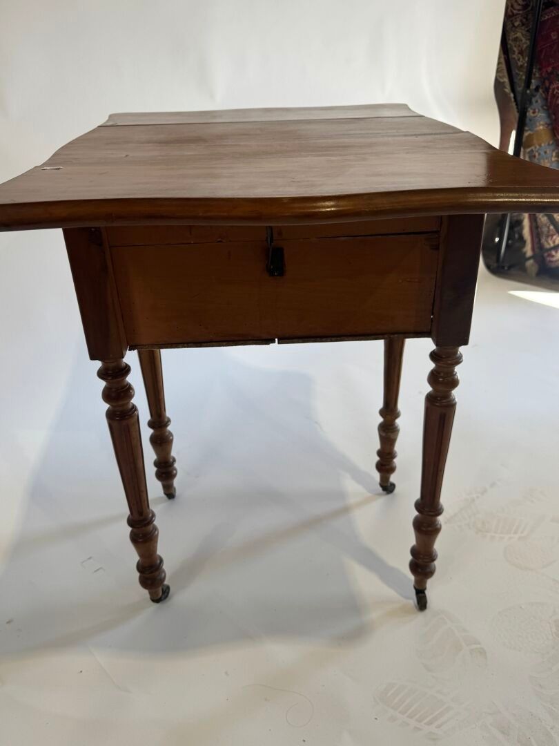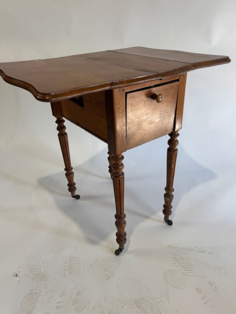Small flap bedside cabinet on castors in moulded wood opening with a flap.