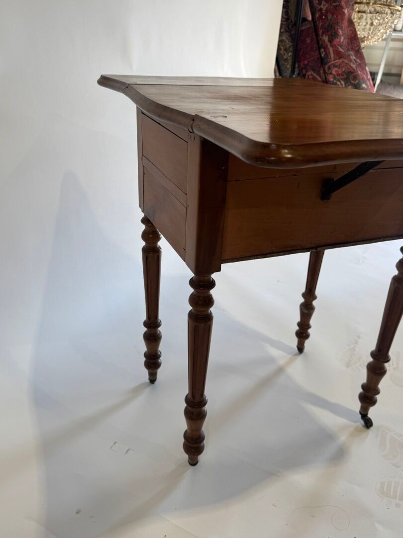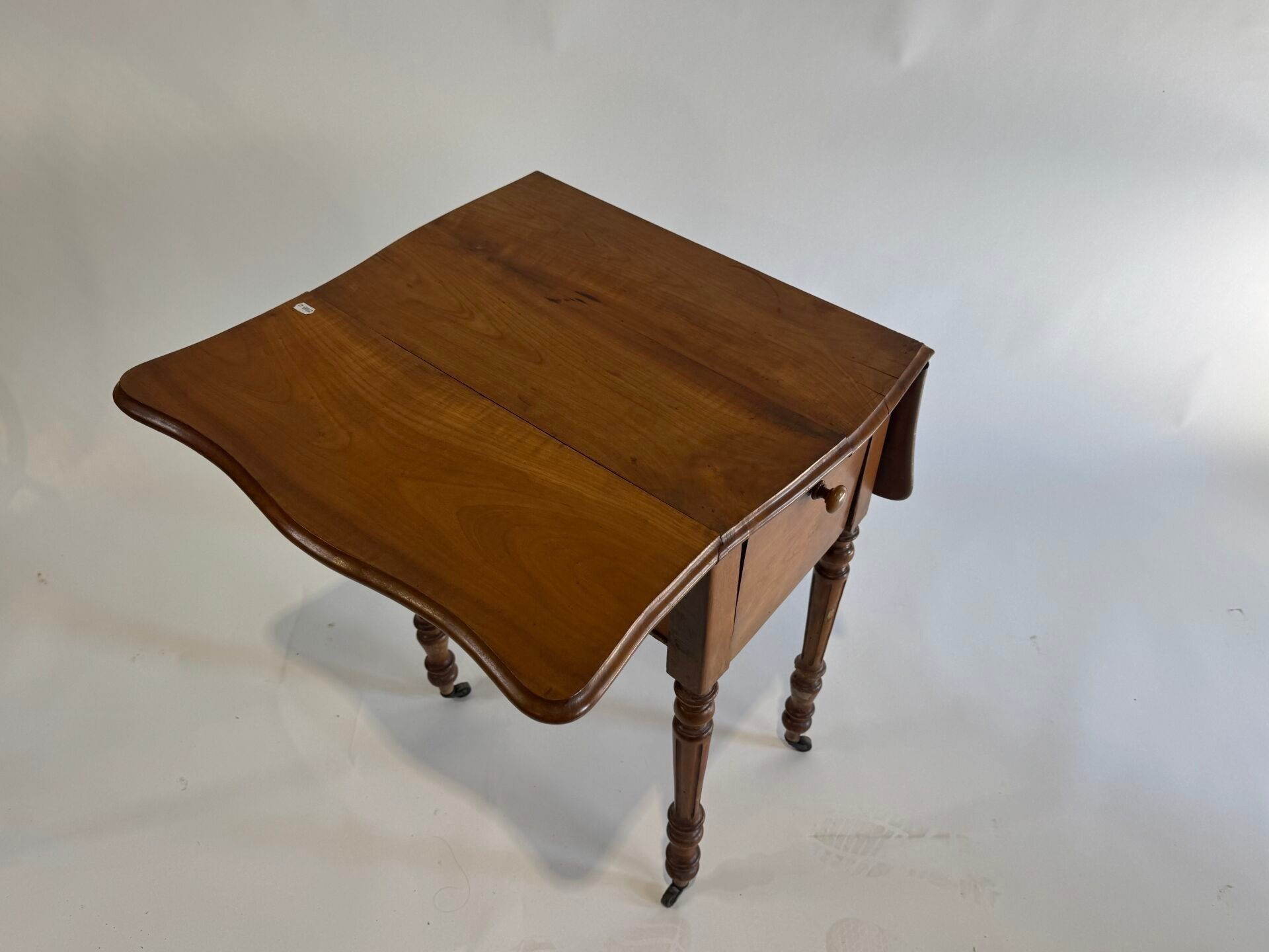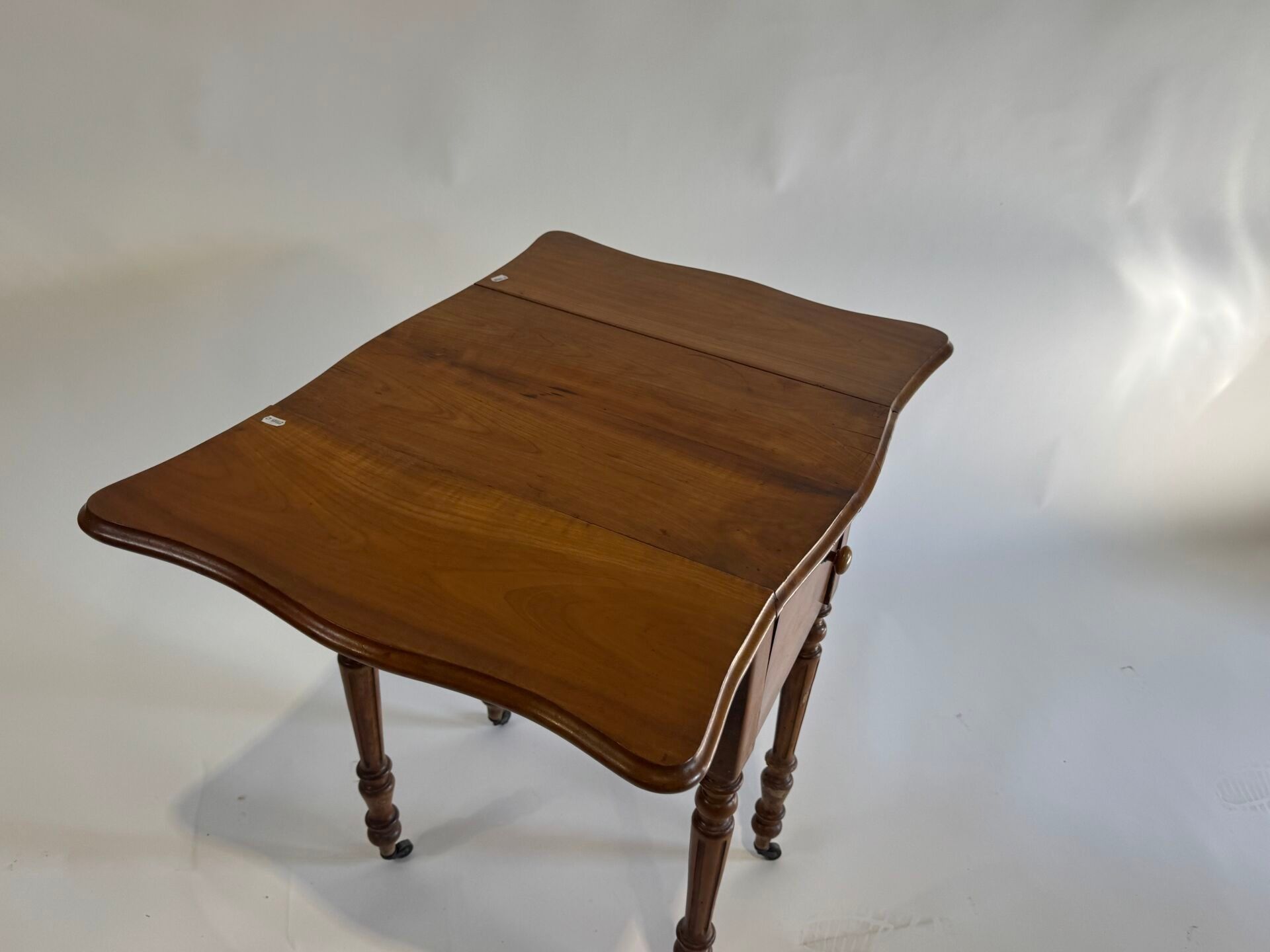 Small flap bedside cabinet on castors in moulded wood opening with a flap.