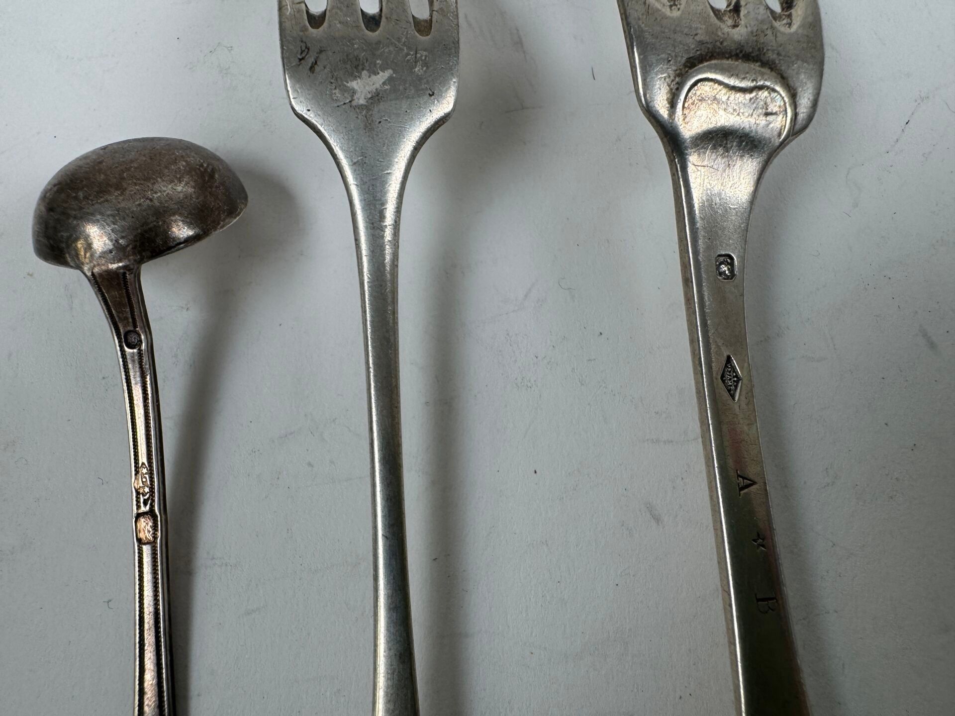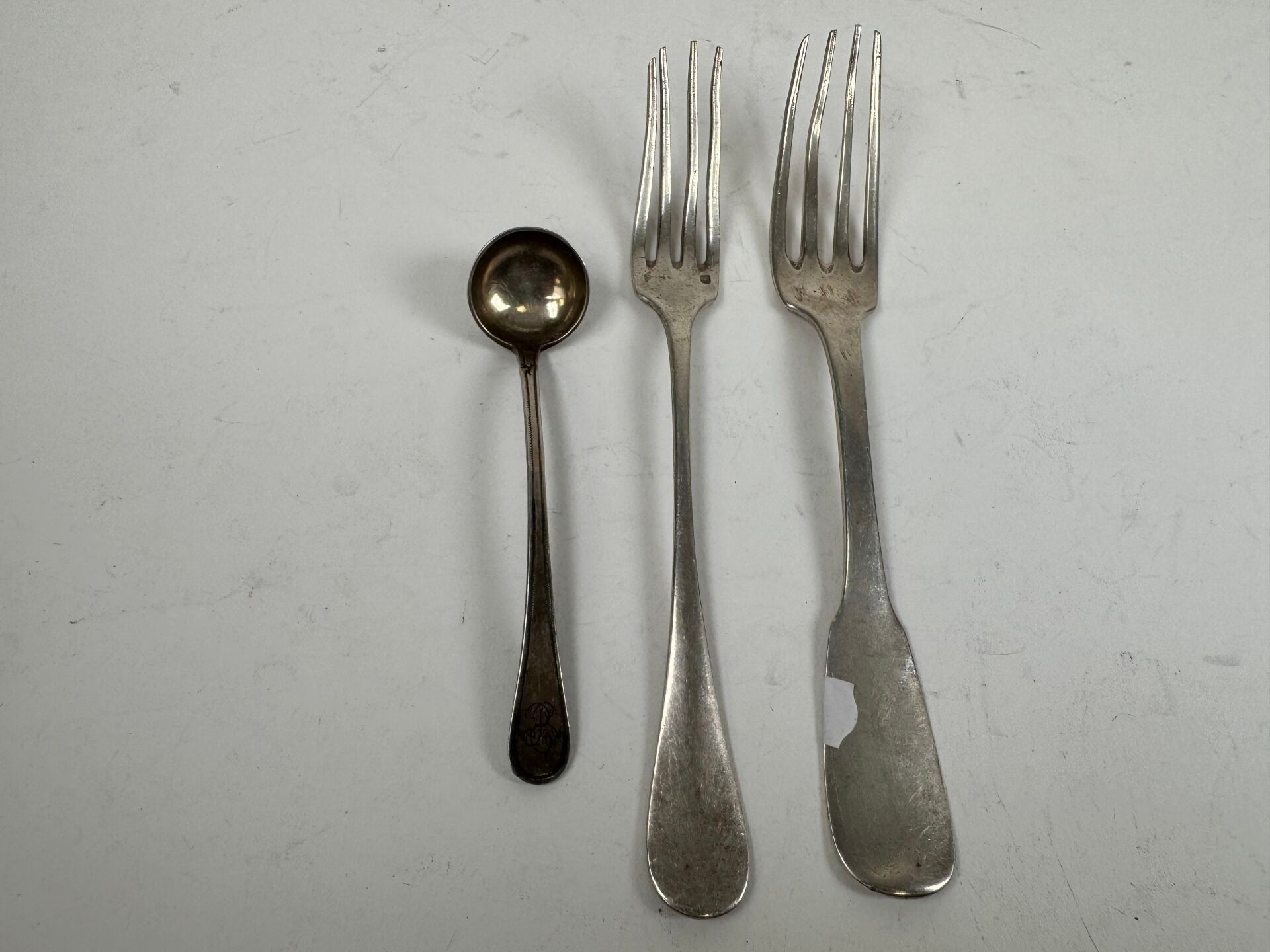 A silver lot, hallmarked Old Man and Minerve, including two forks and a salt spoon.