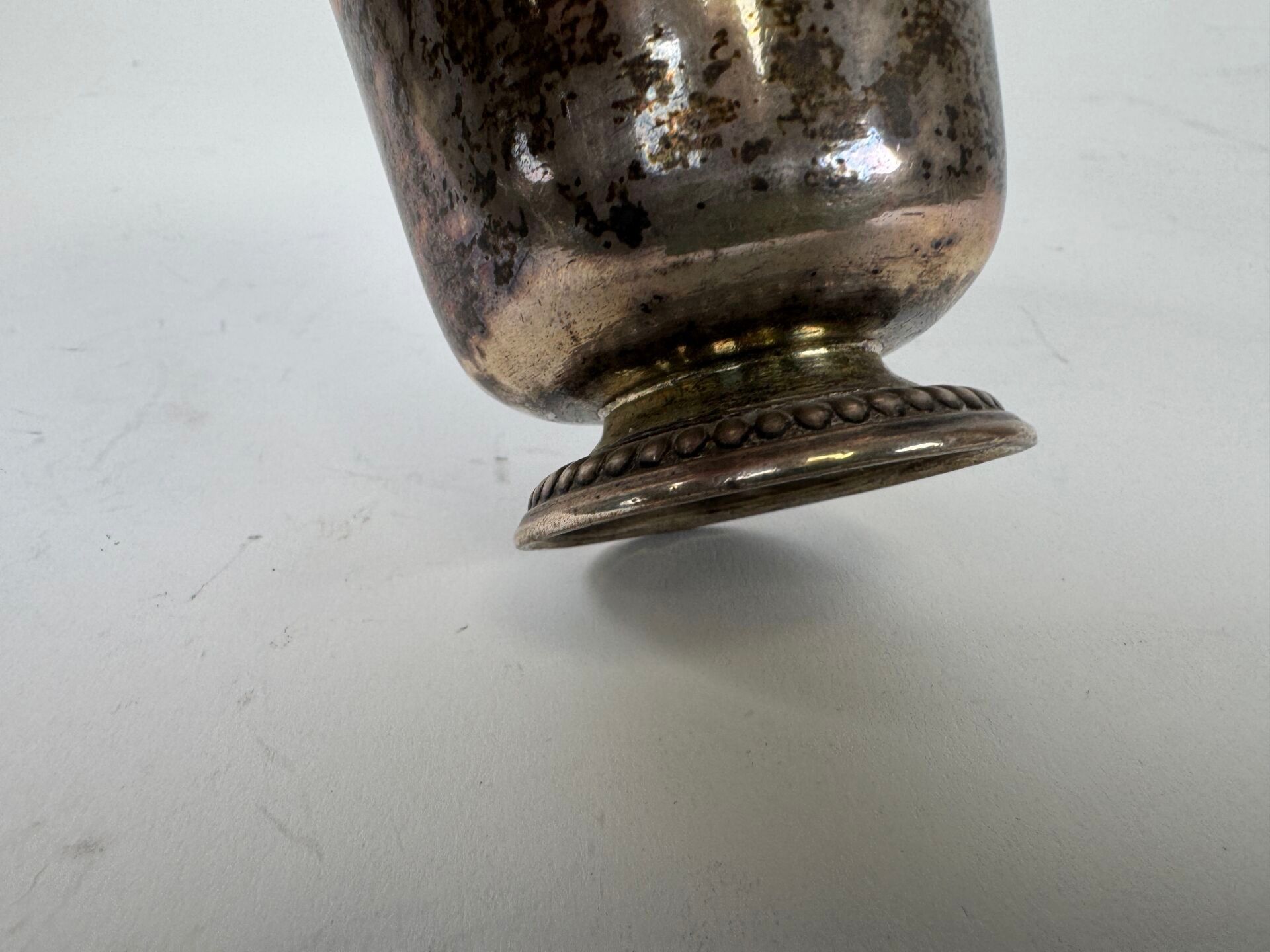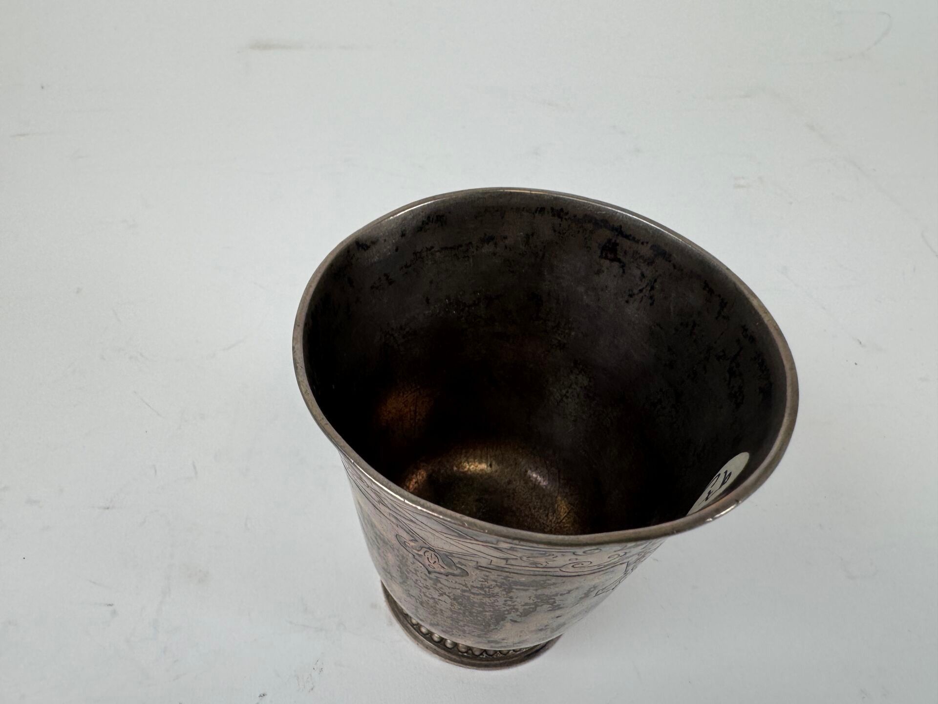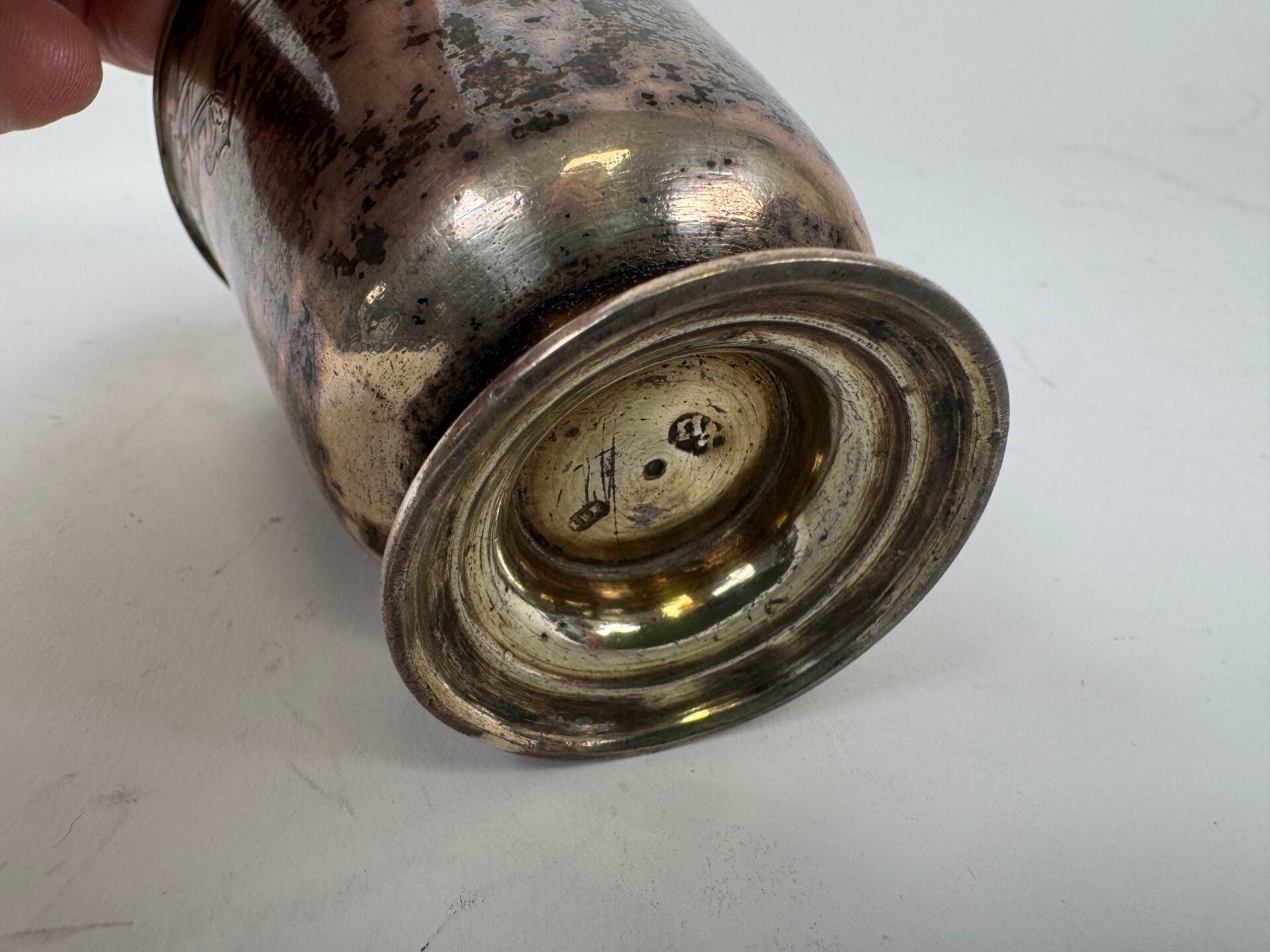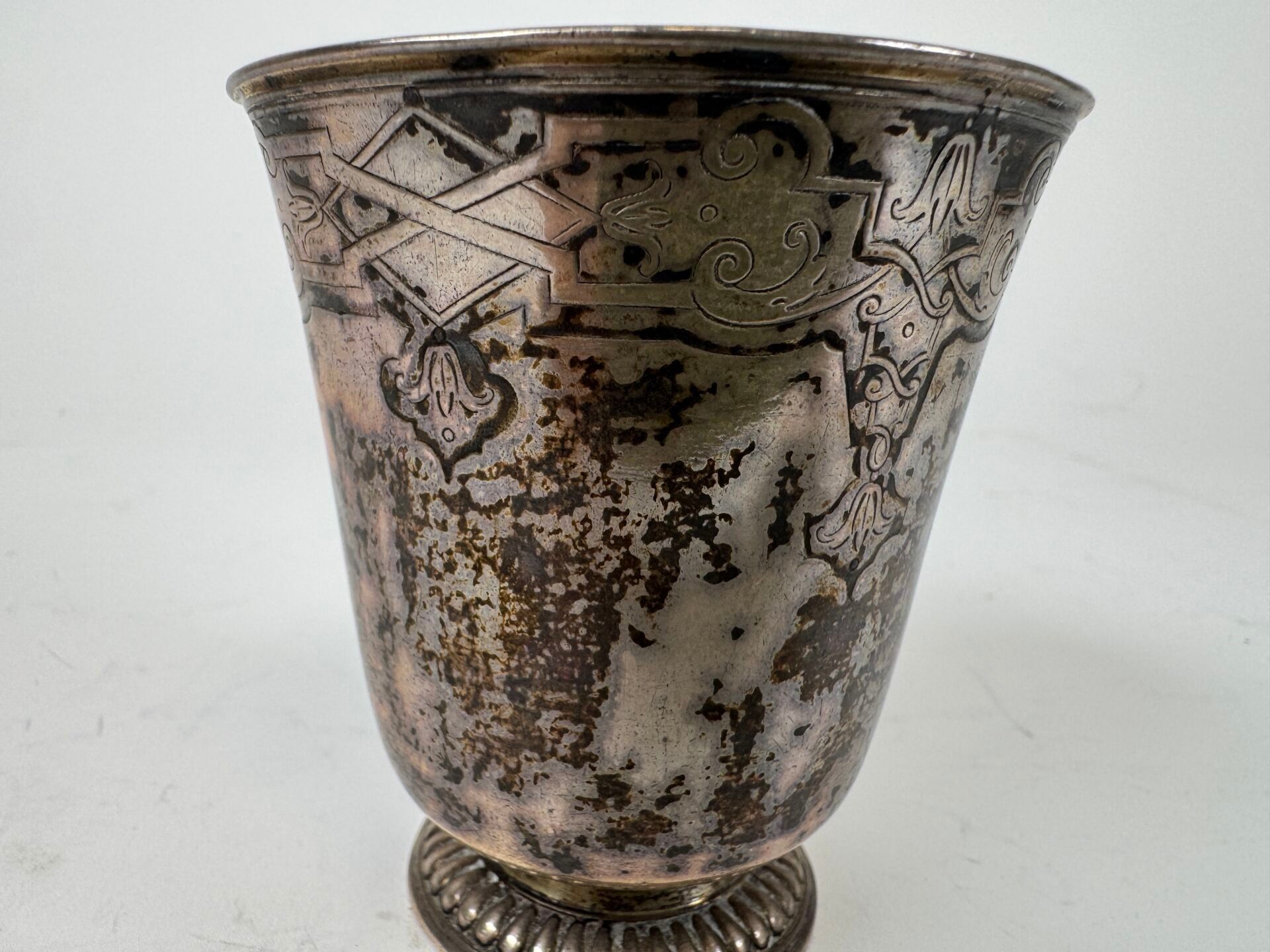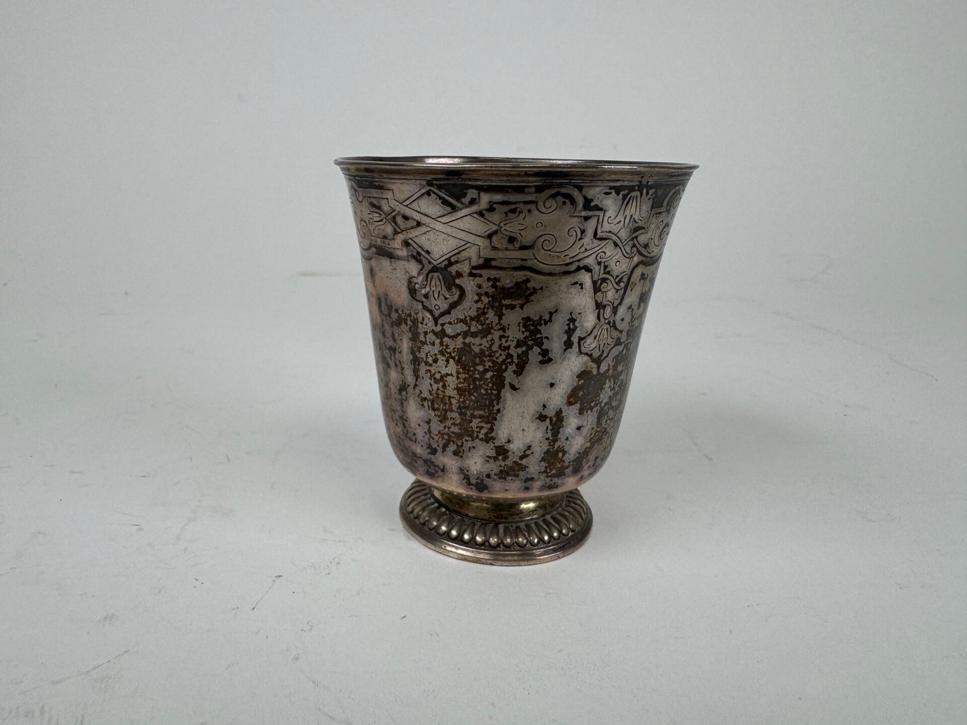 A silver tulip tumbler decorated with stylised motifs.