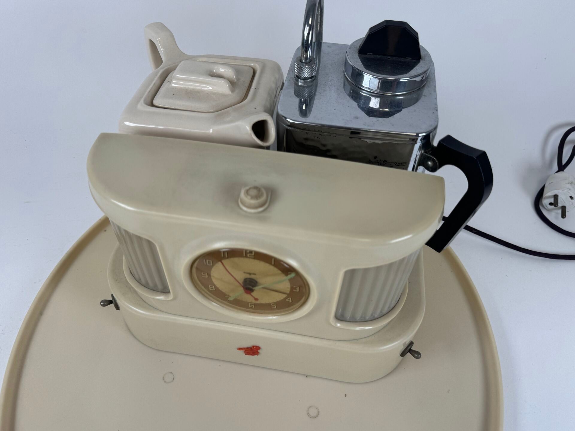 Programmable plastic and metal tea machine with earthenware pot.