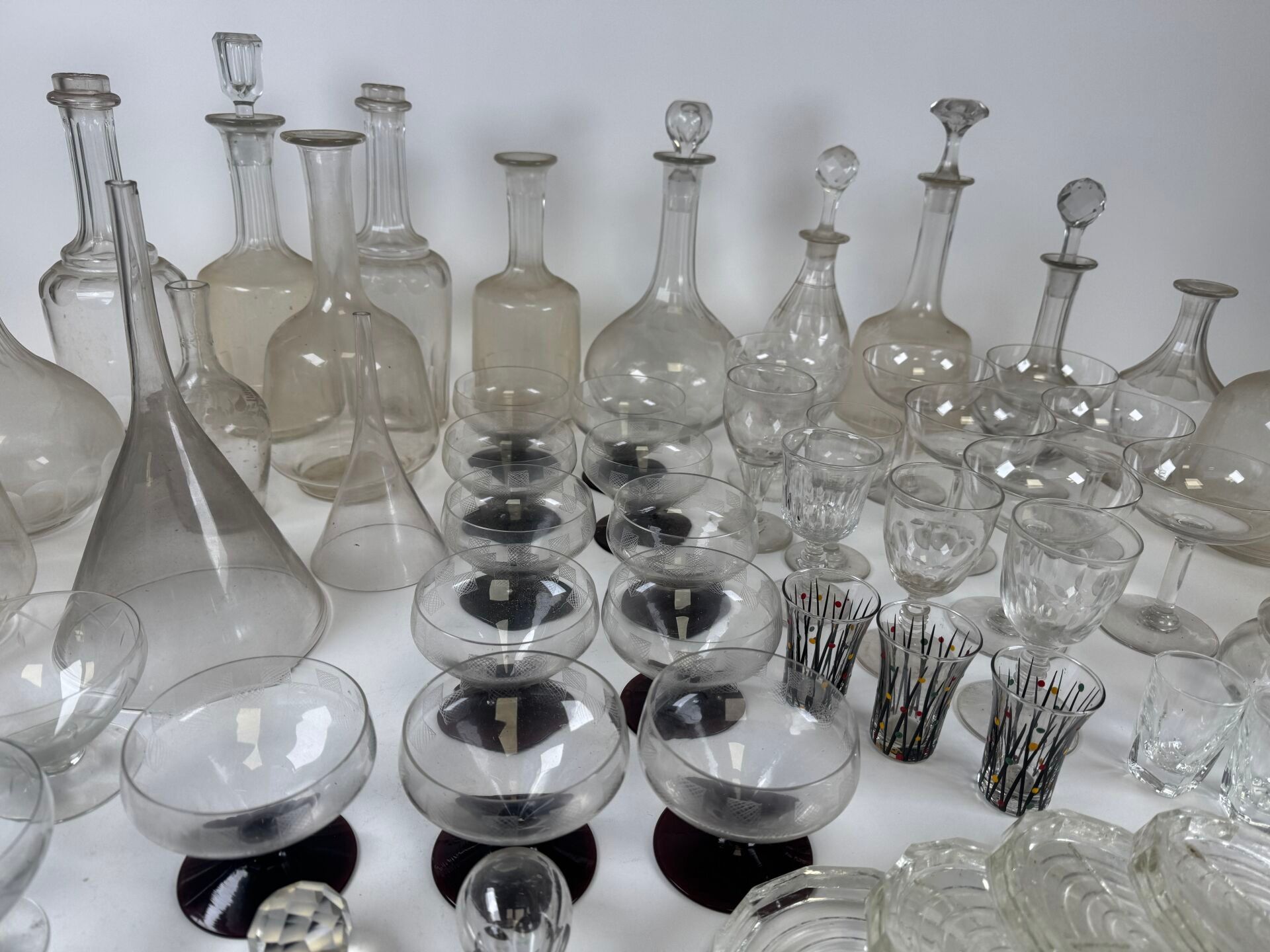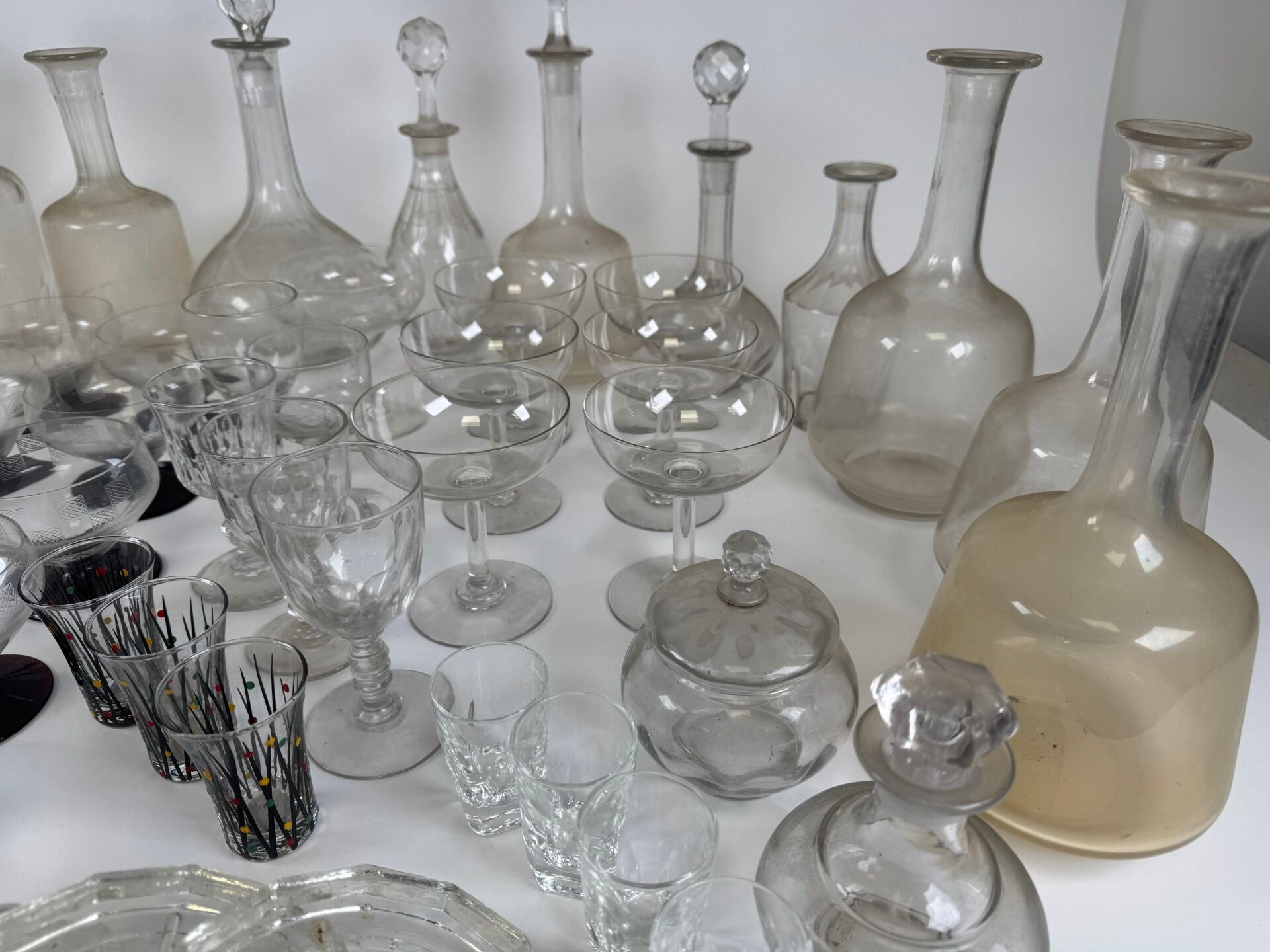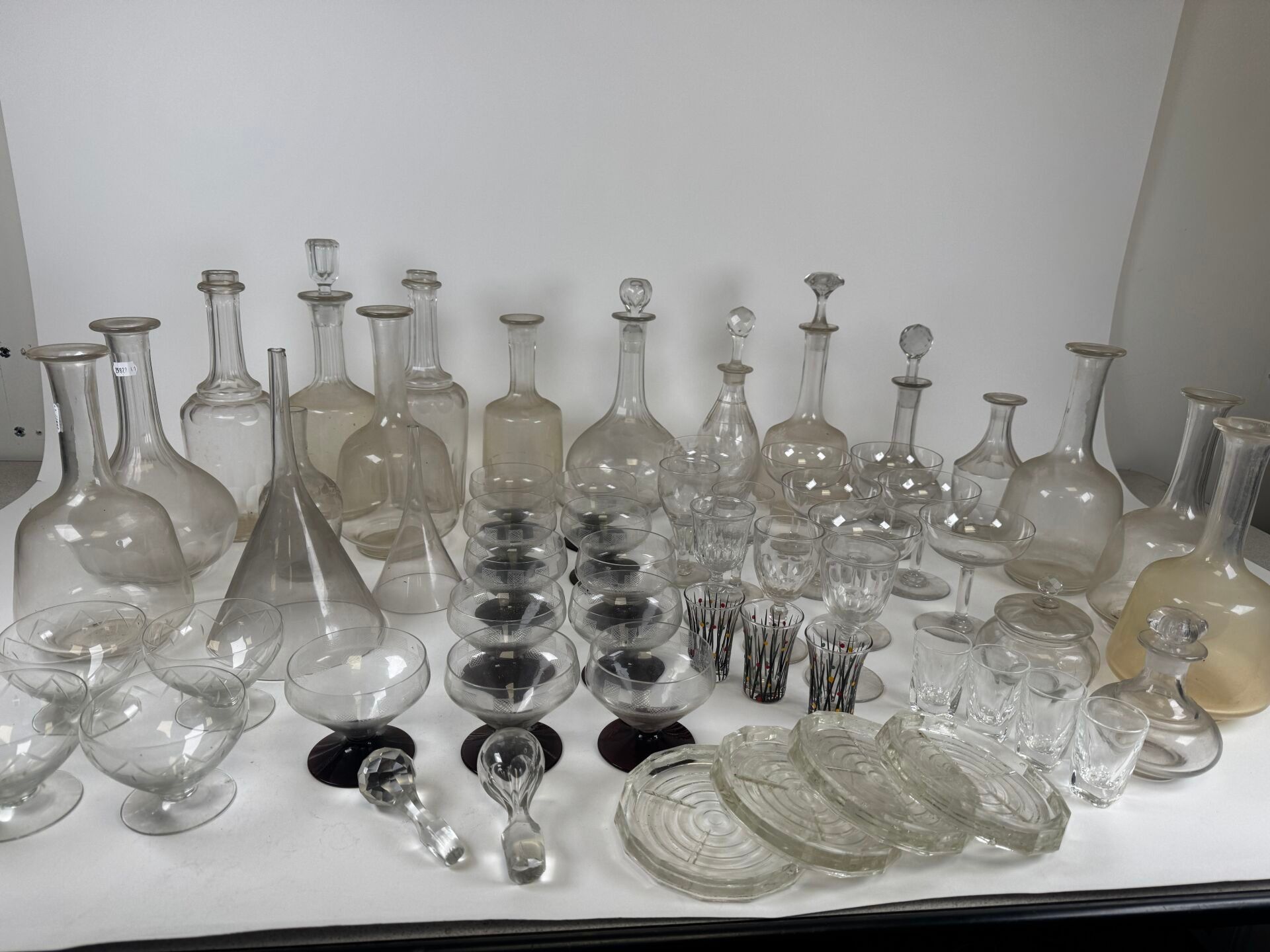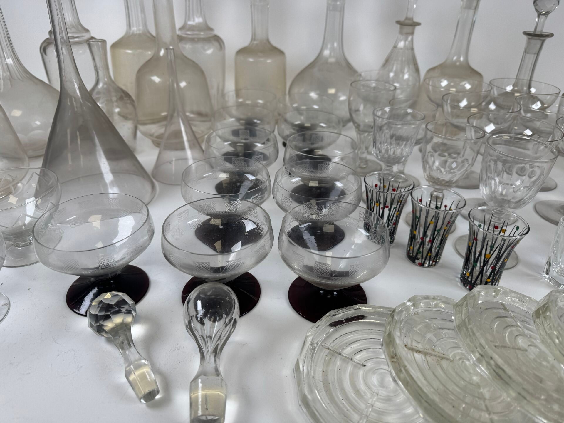 Large glass and crystal lot including numerous decanters, glasses, champagne glasses, coasters, carafons, covered sugar bowl, stoppers, etc....