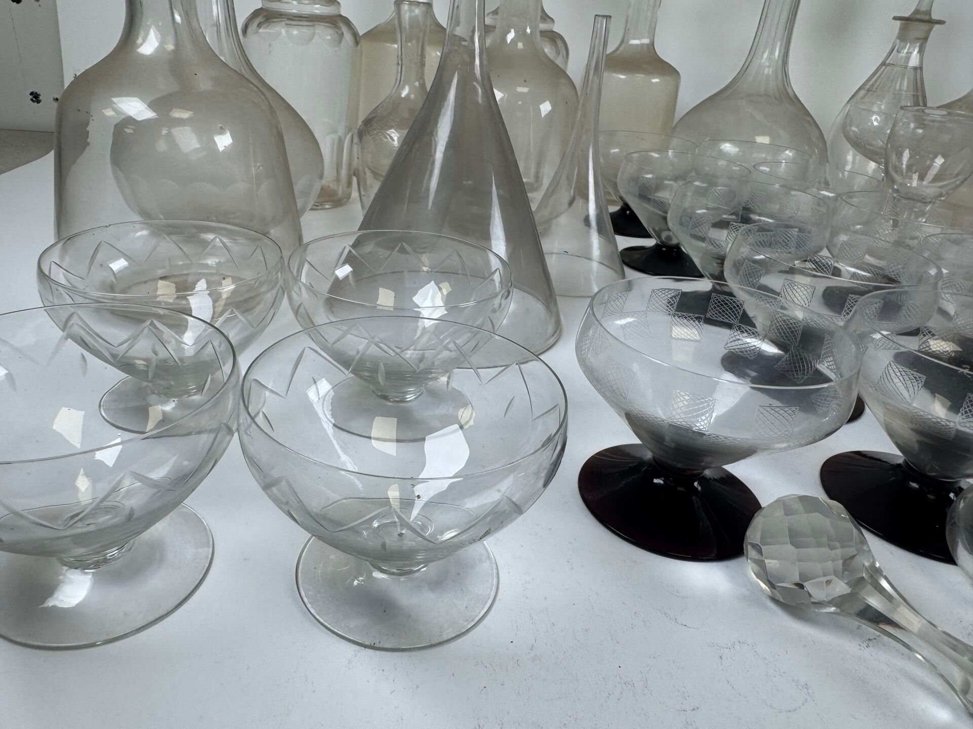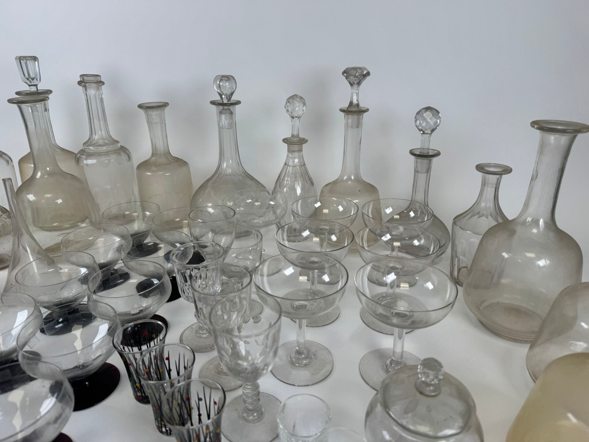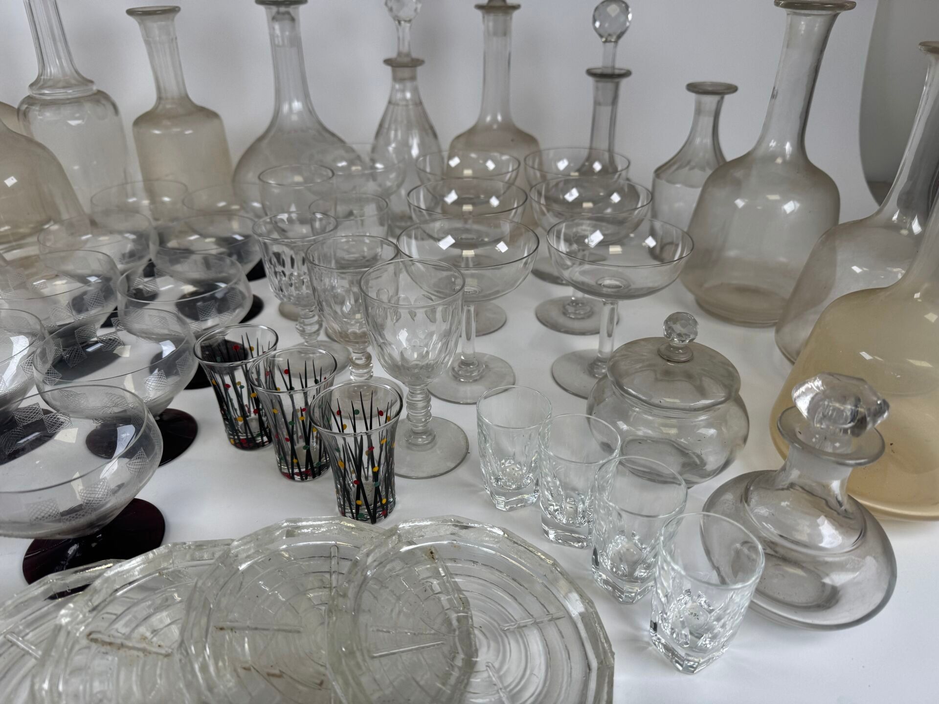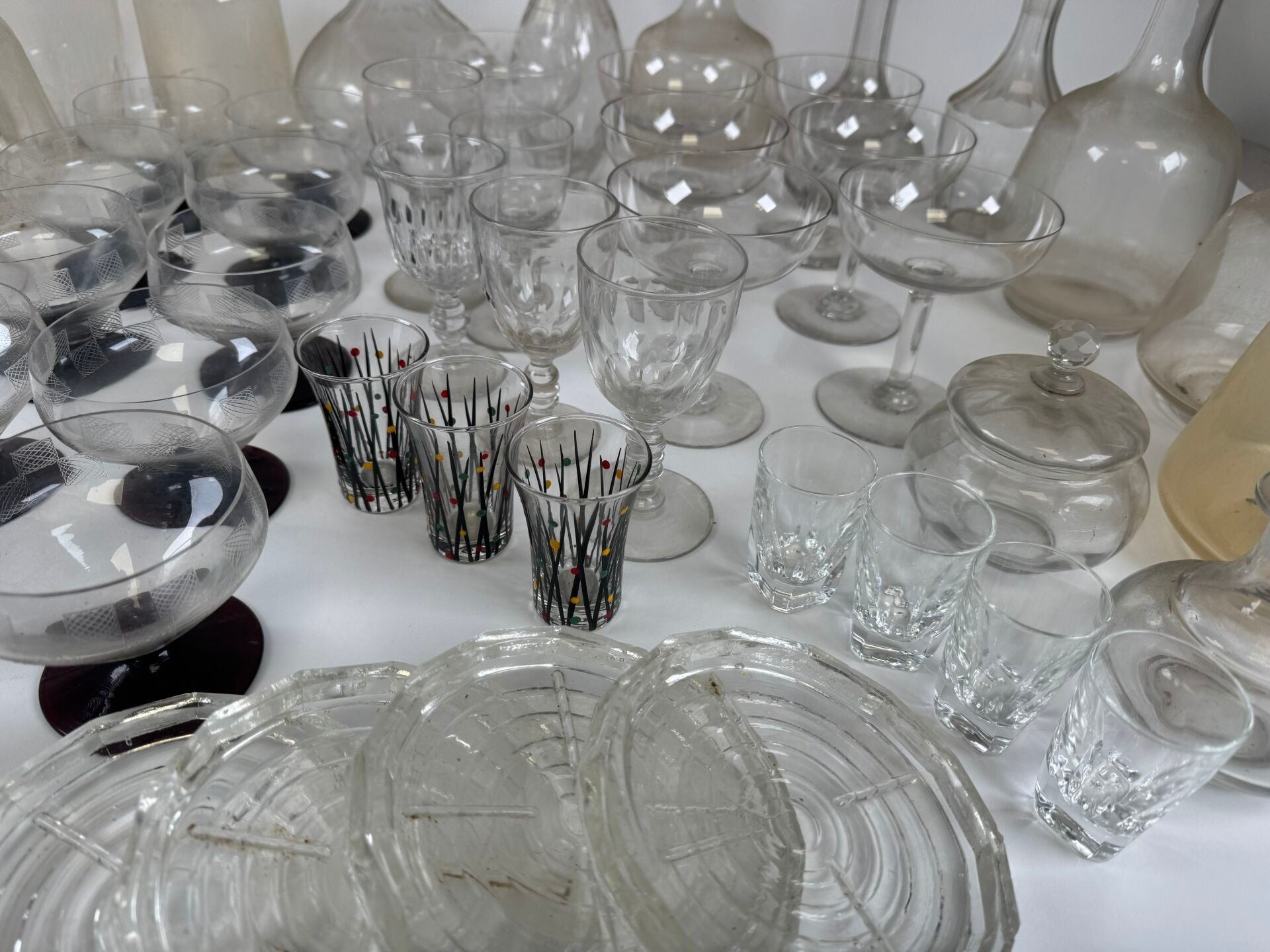 Large glass and crystal lot including numerous decanters, glasses, champagne glasses, coasters, carafons, covered sugar bowl, stoppers, etc....