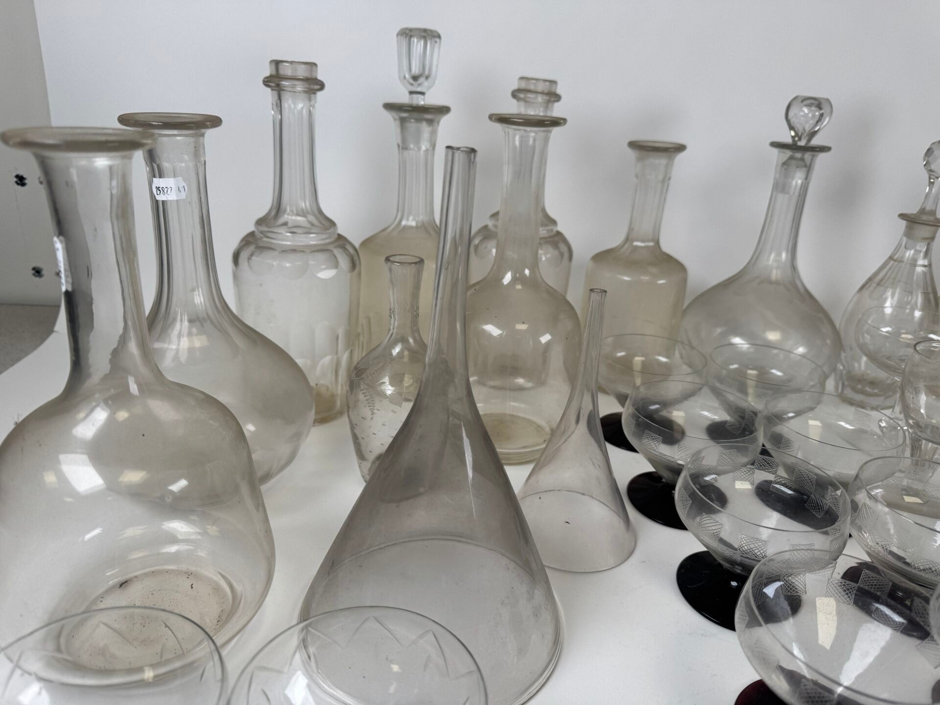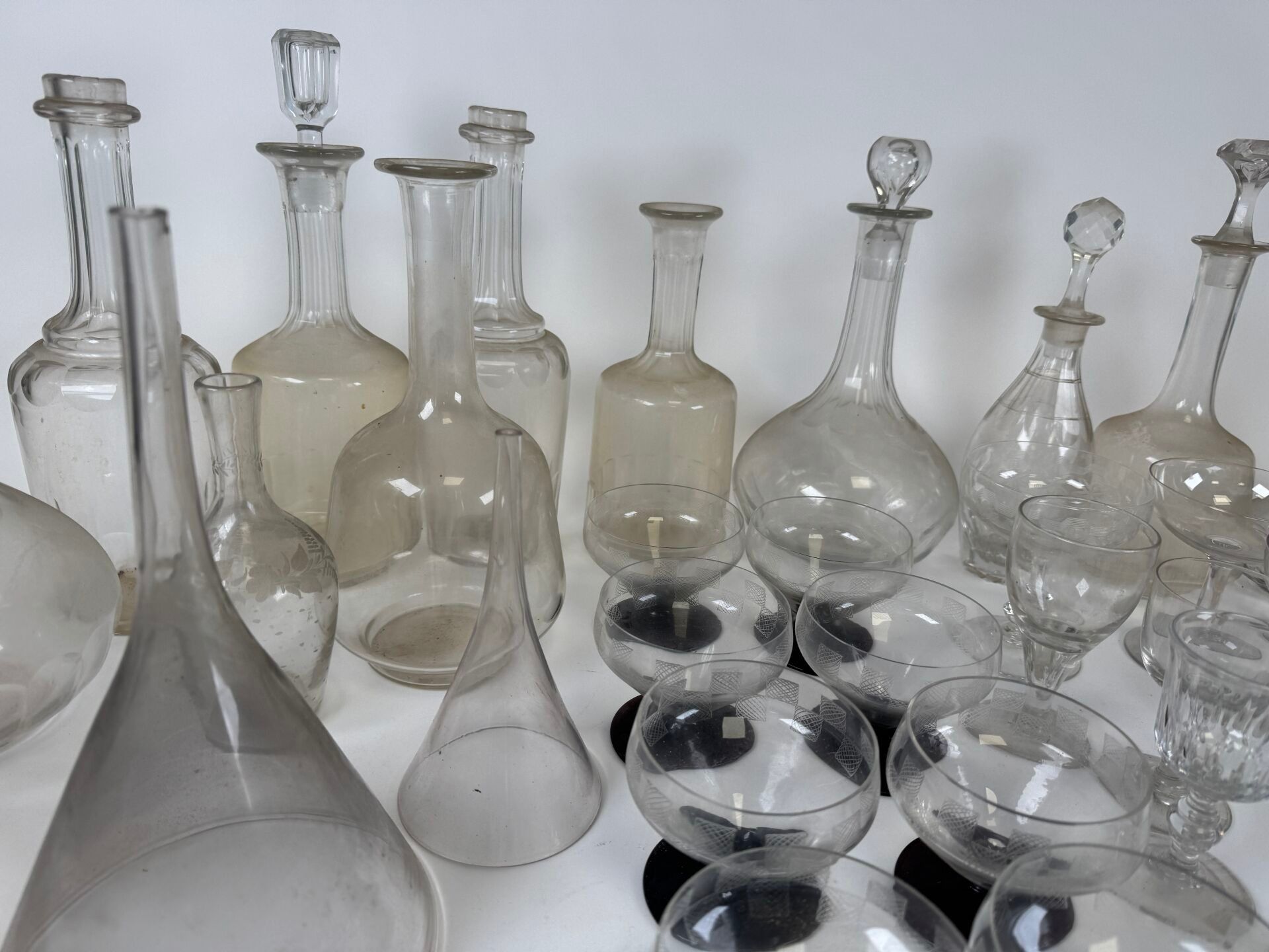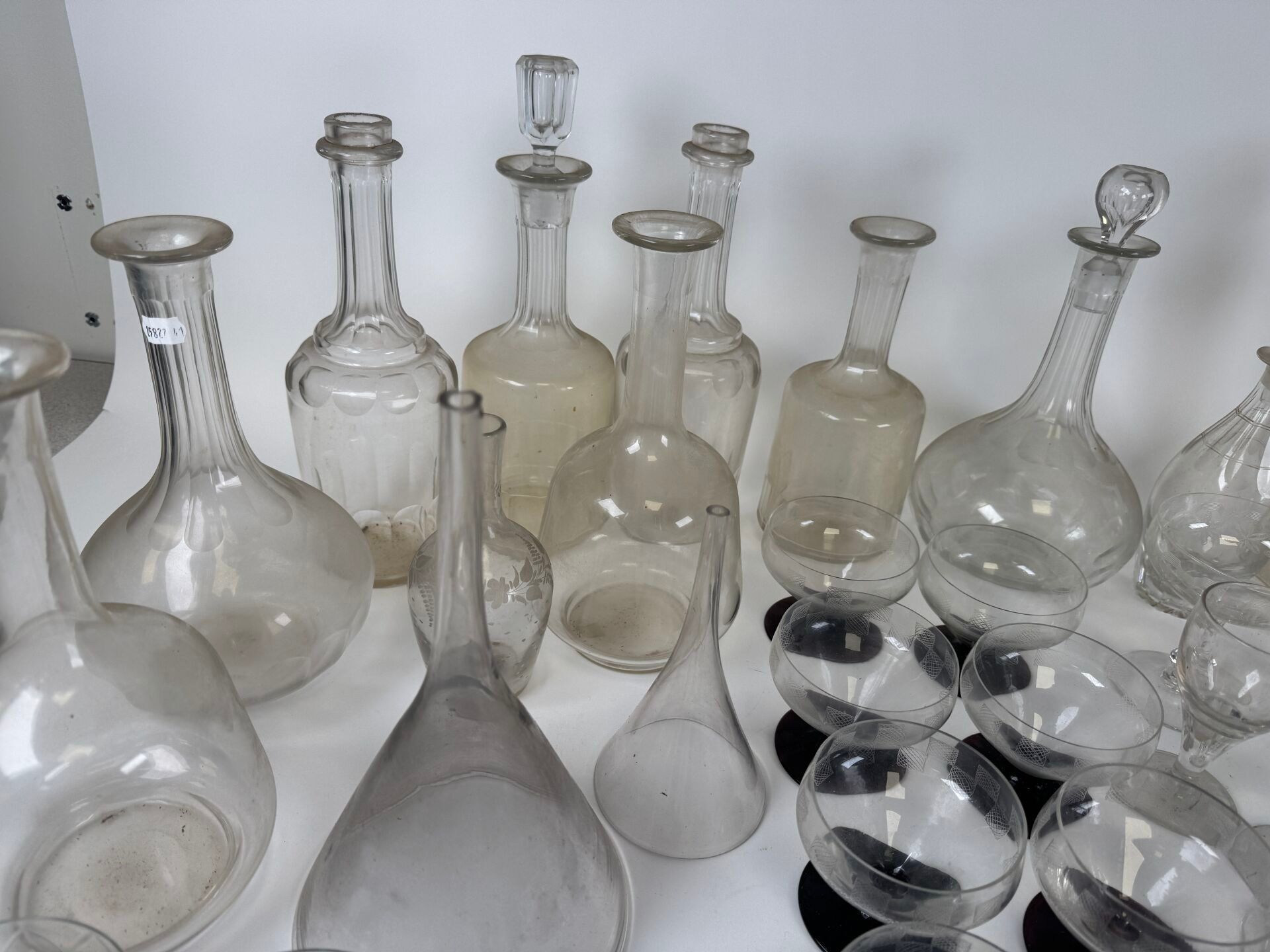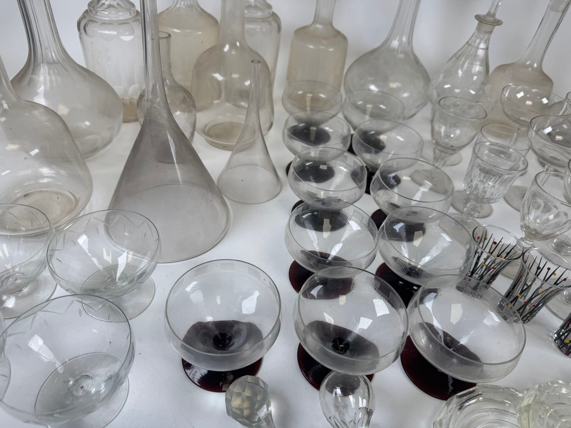 Large glass and crystal lot including numerous decanters, glasses, champagne glasses, coasters, carafons, covered sugar bowl, stoppers, etc....