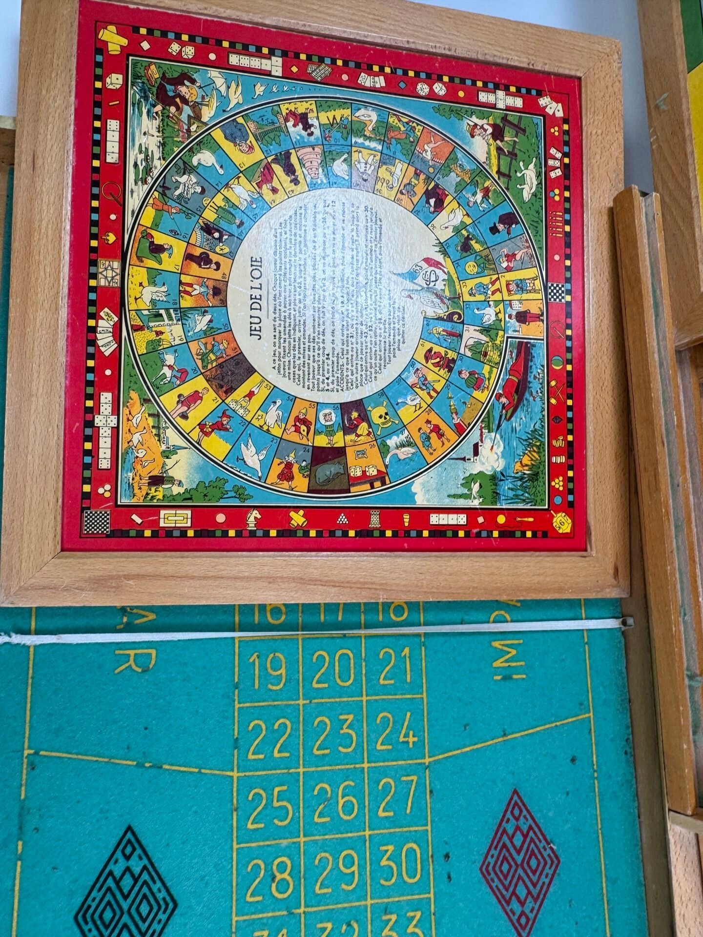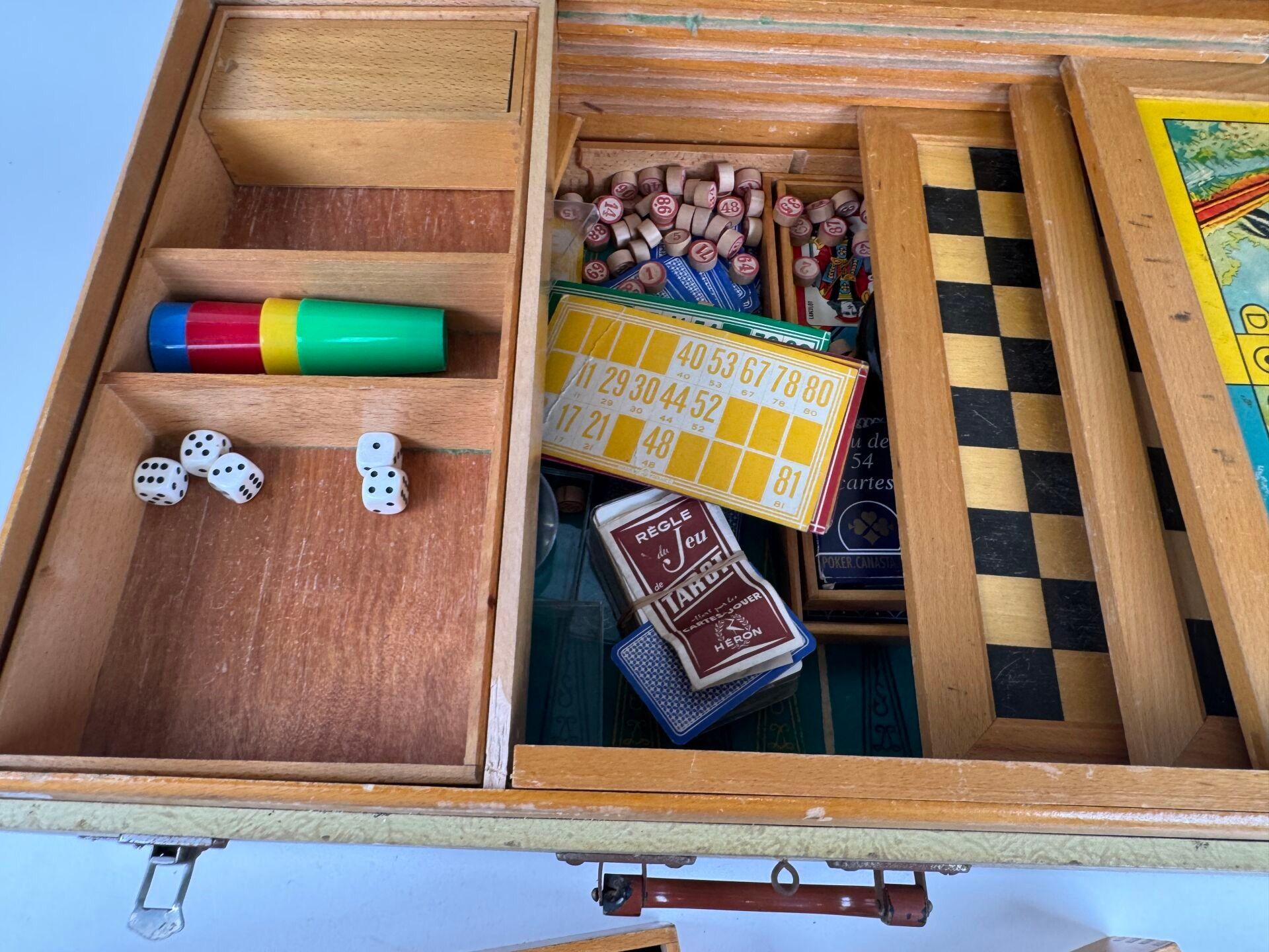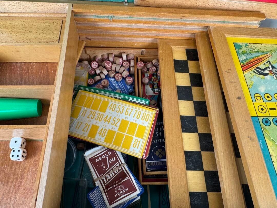 Trunk containing a range of games, including Goose, Dominoes, Lotto, Parcheesi, Draughts, Chess, Roulette, Cards, Yellow Dwarf, etc.