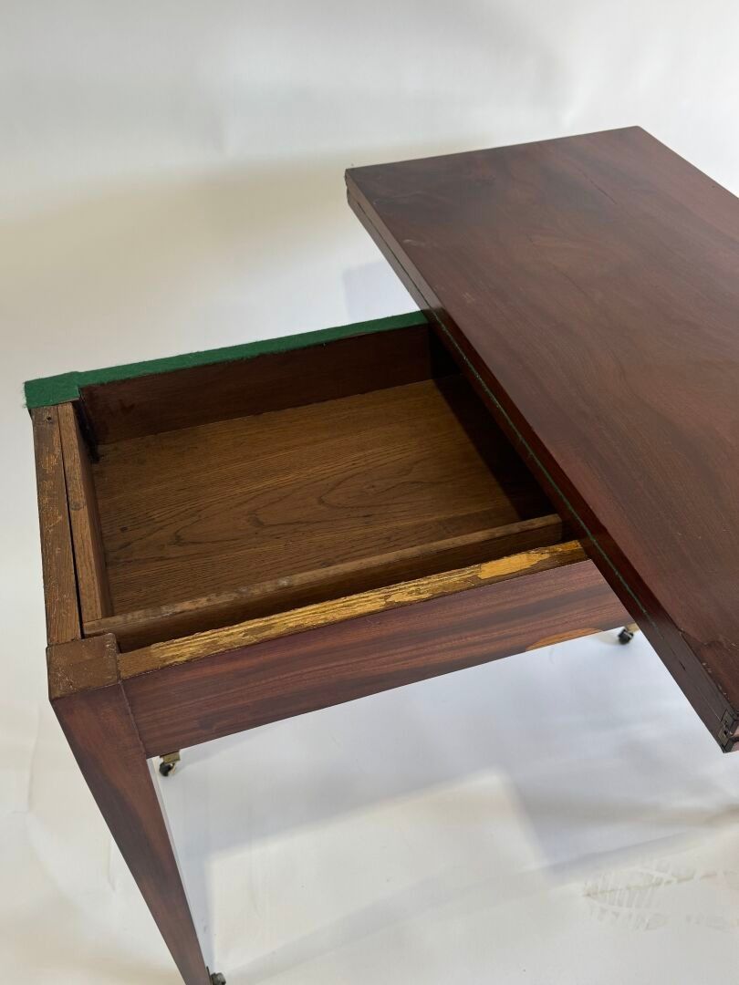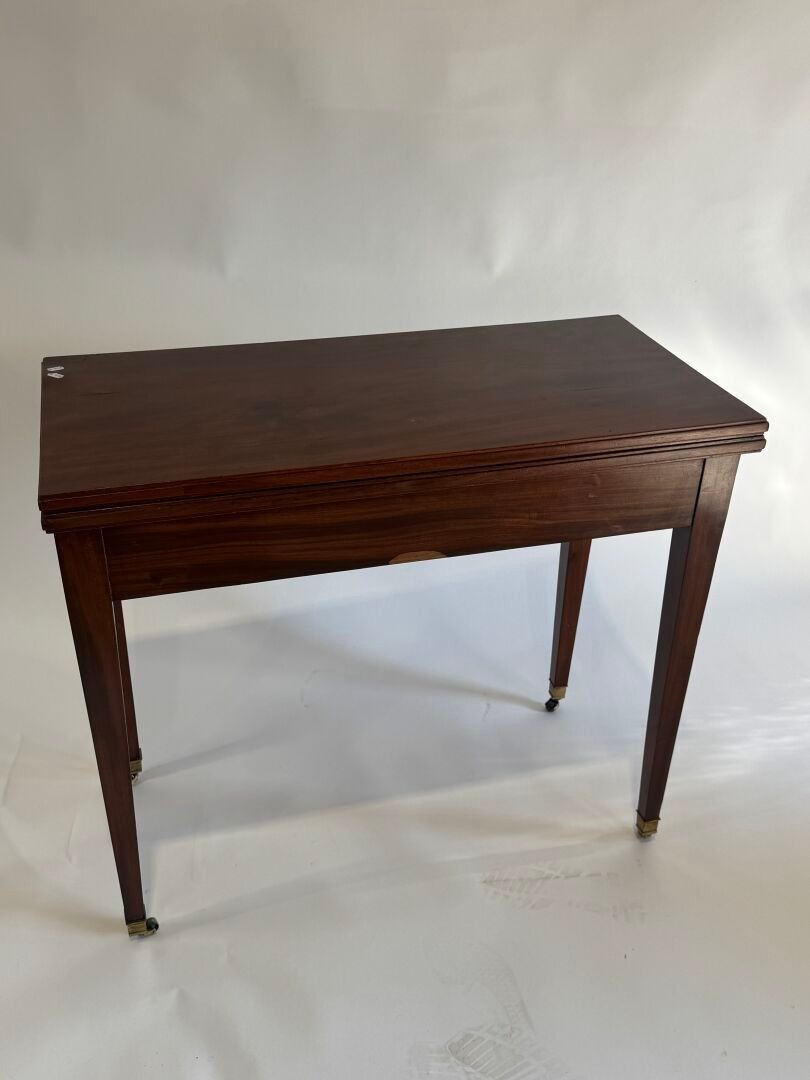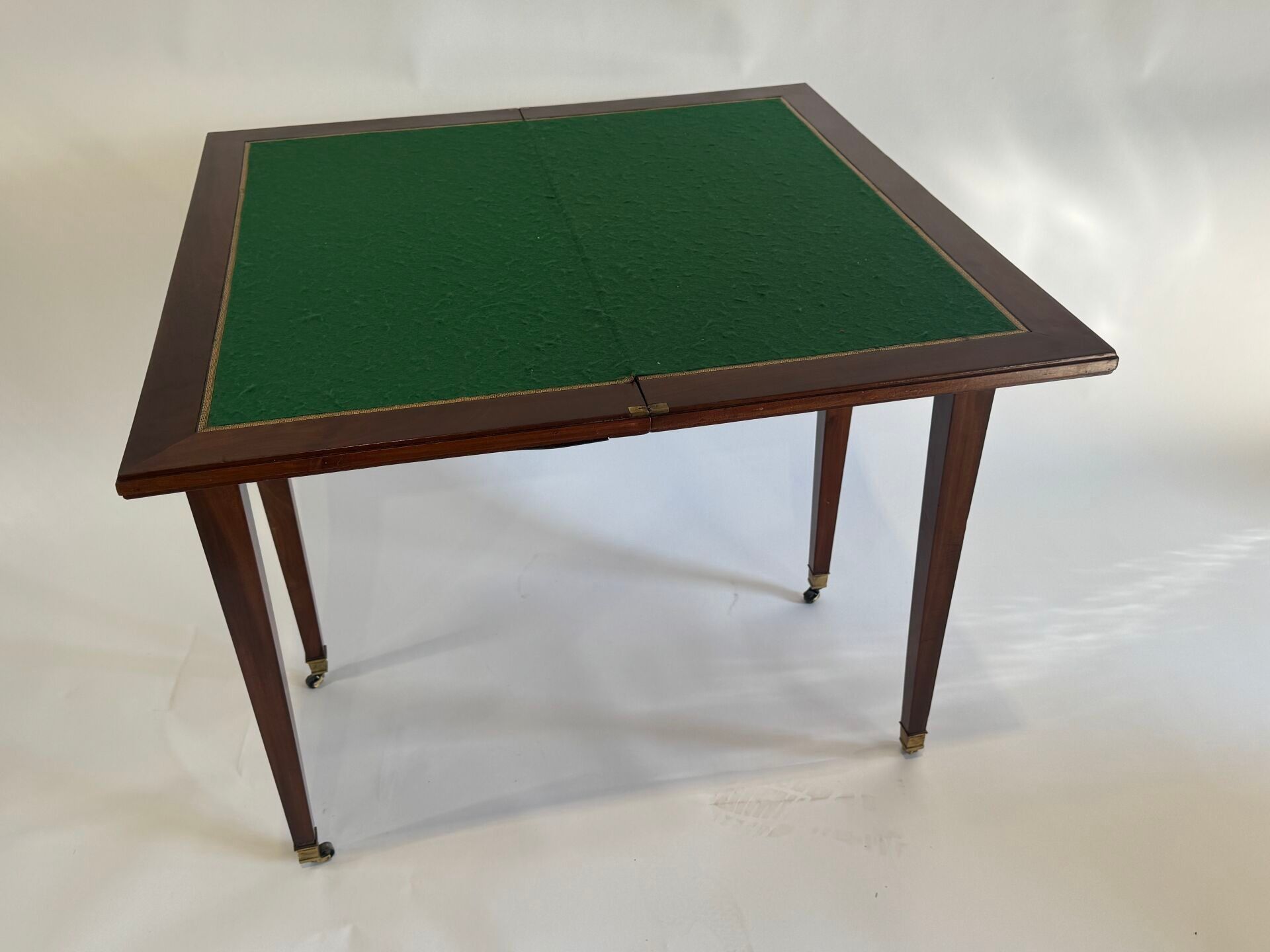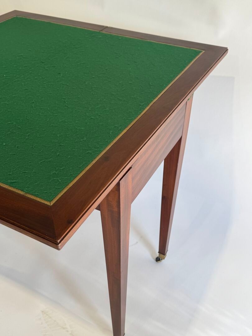 Wooden and mahogany veneered game table, the top revealing green felt, the legs ending in sabots and castors.