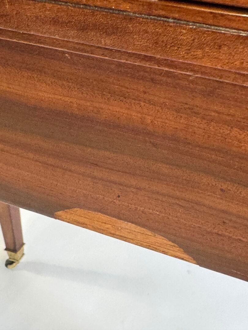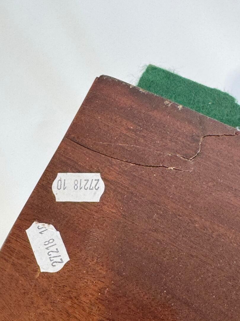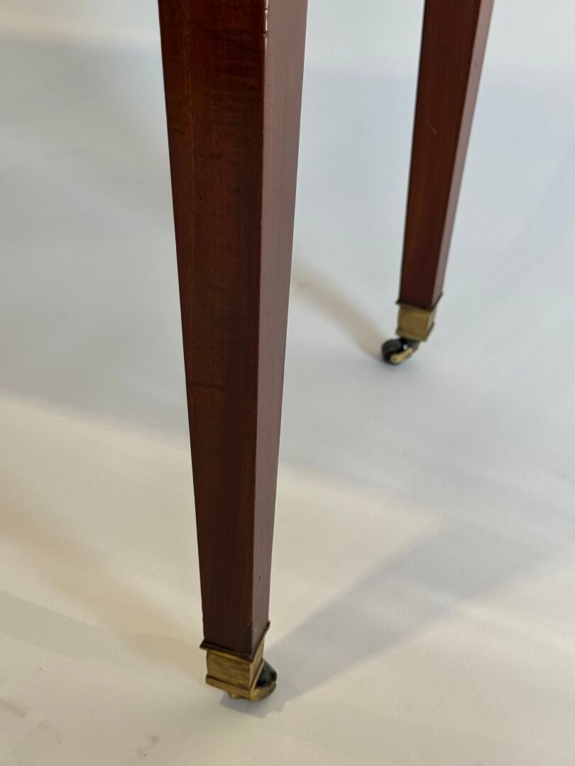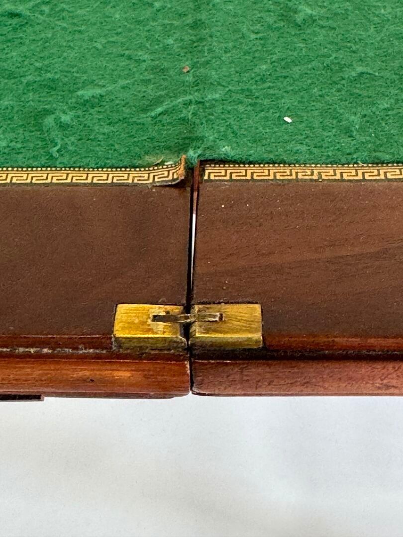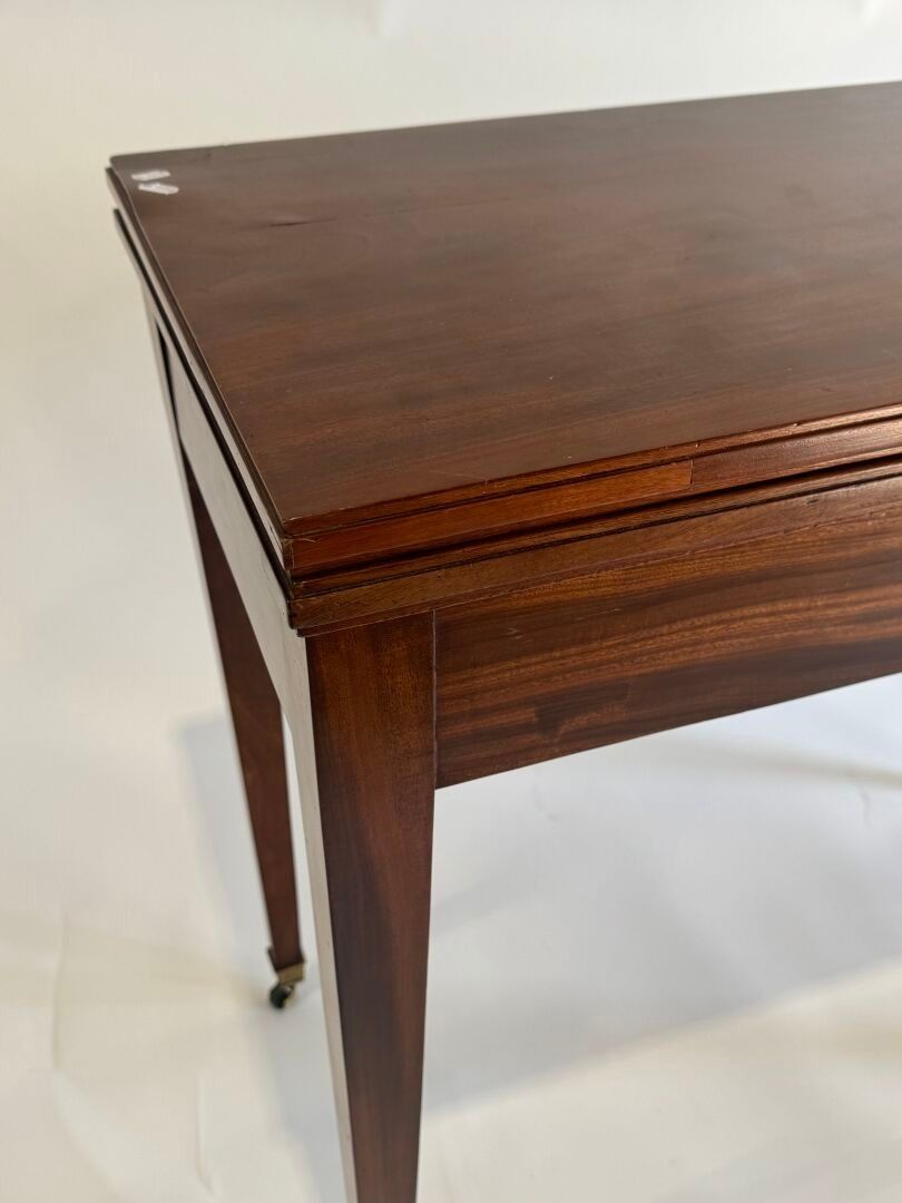 Wooden and mahogany veneered game table, the top revealing green felt, the legs ending in sabots and castors.