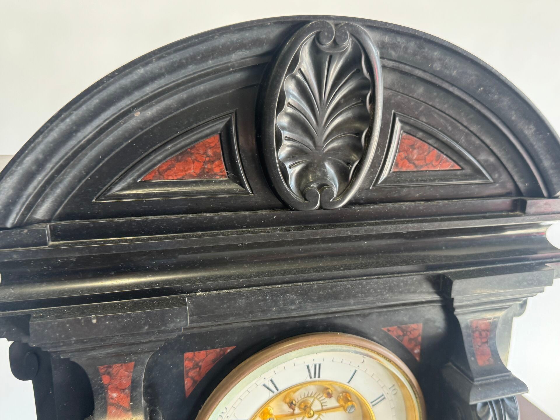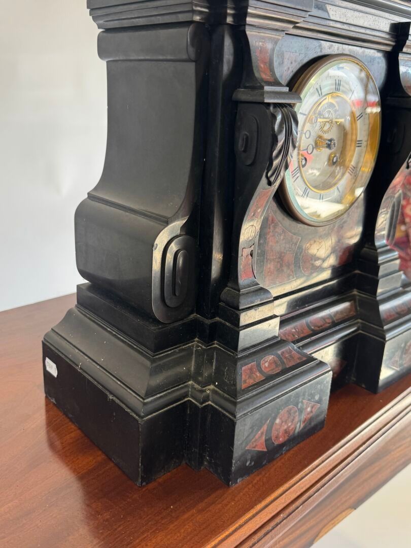 Black and cherry marble clock. The white enamelled annular dial with Roman numerals and railway. The white enamelled central dial with two winding squares and visible gilt brass escapement. The mechanism signed JUVENAUX, blade suspension.