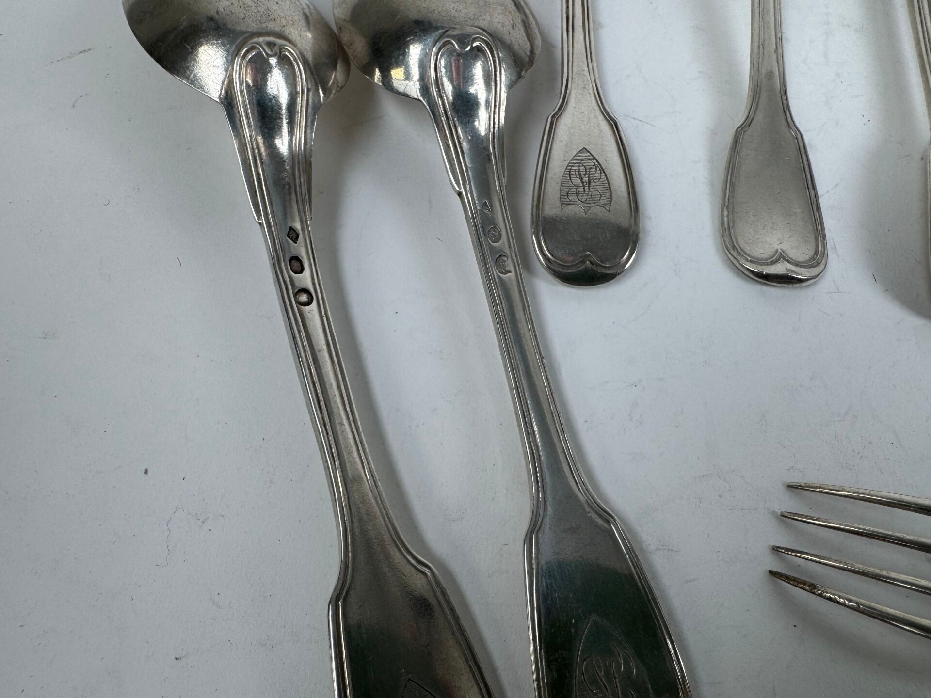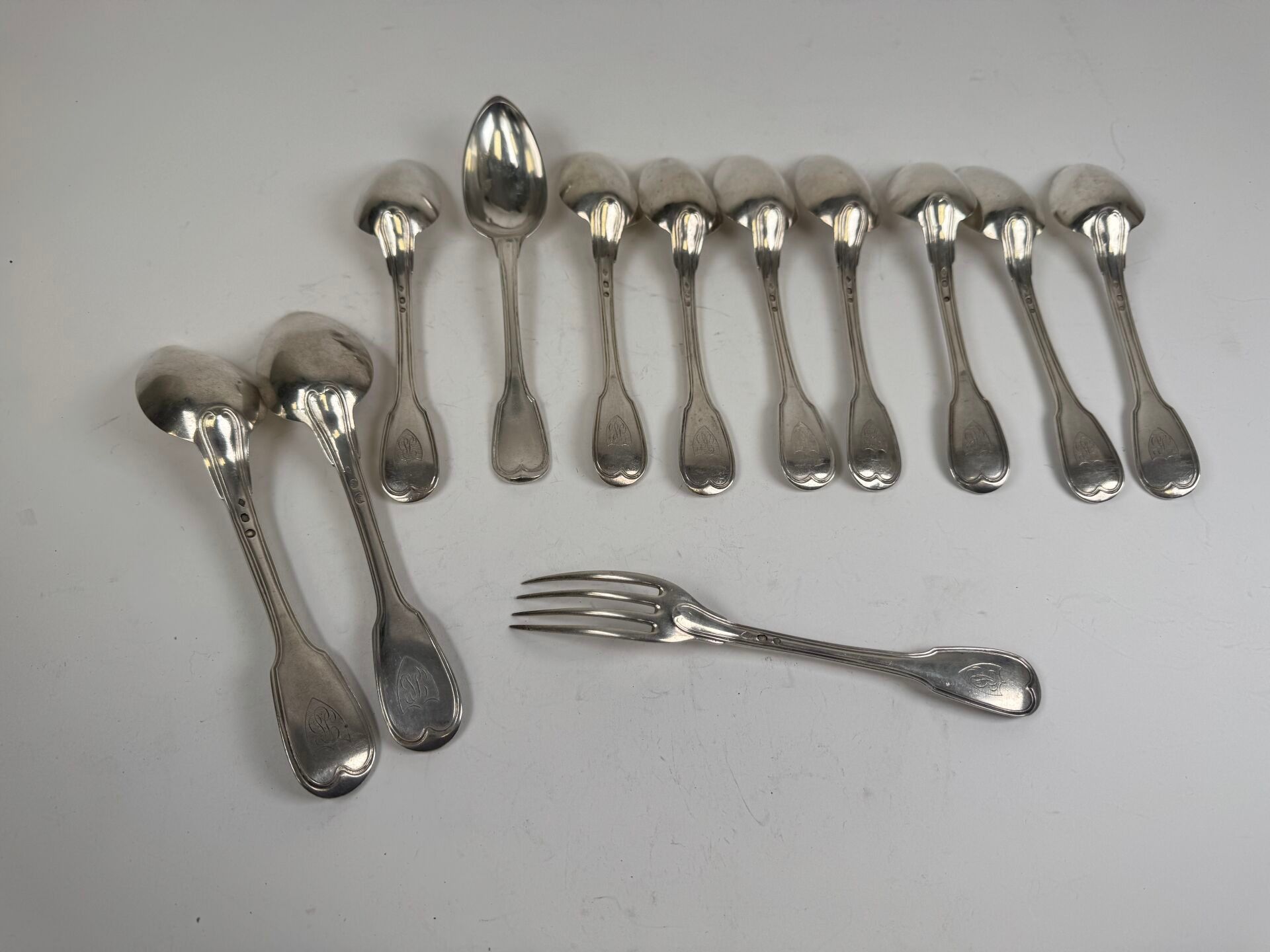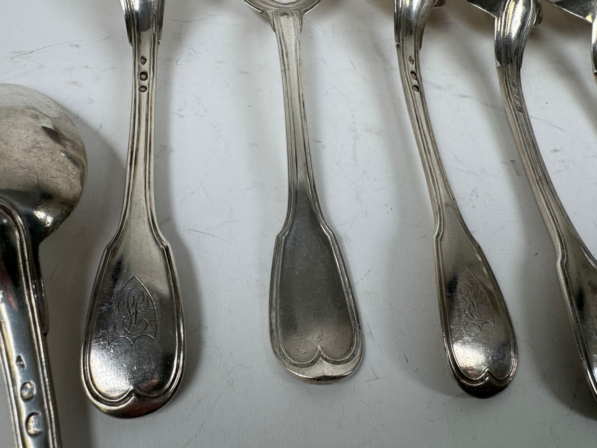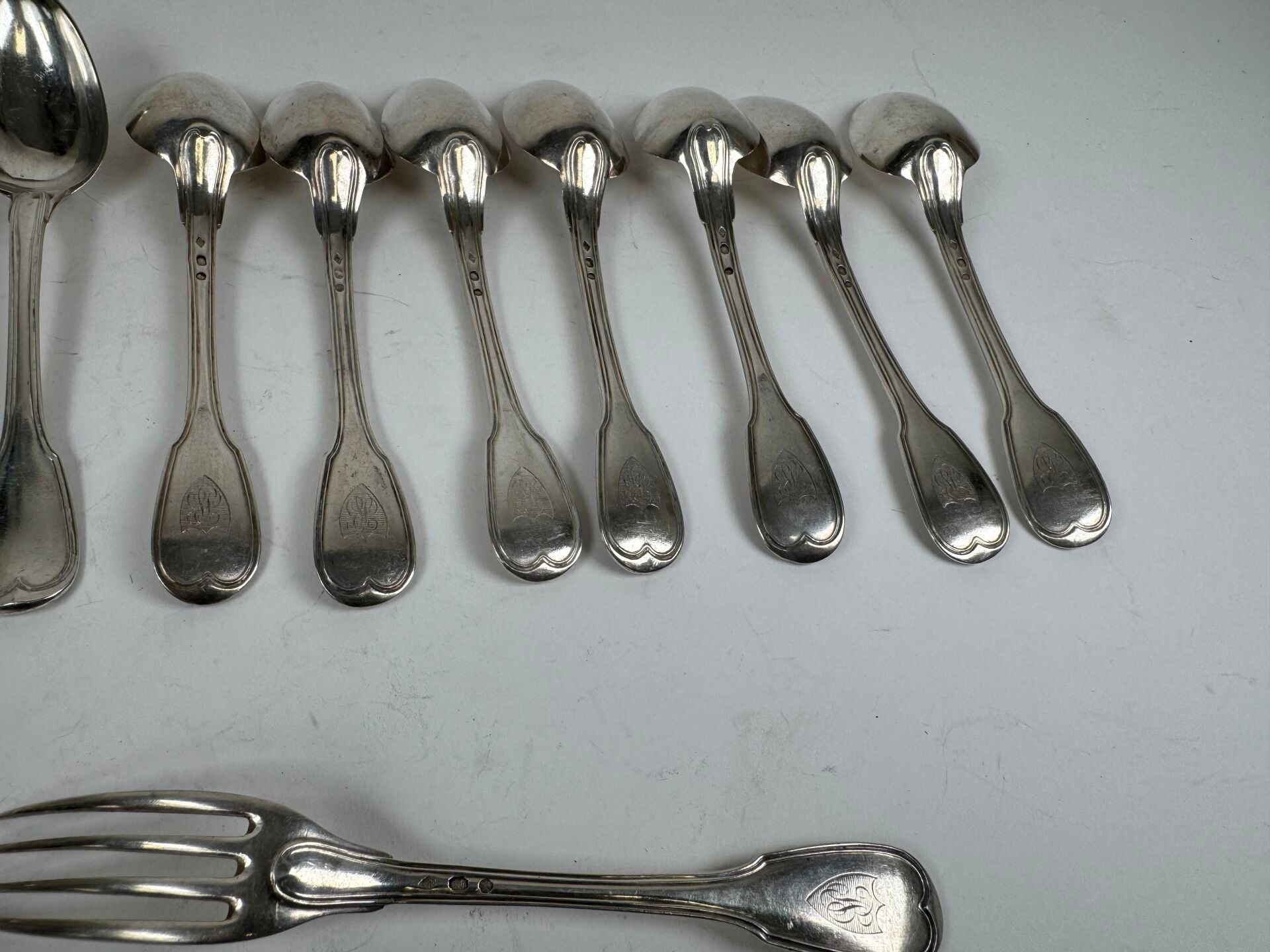 A silver lot with the Coq hallmark 1st and 2nd title comprising 2 table spoons, 9 dessert spoons and 1 dessert fork.