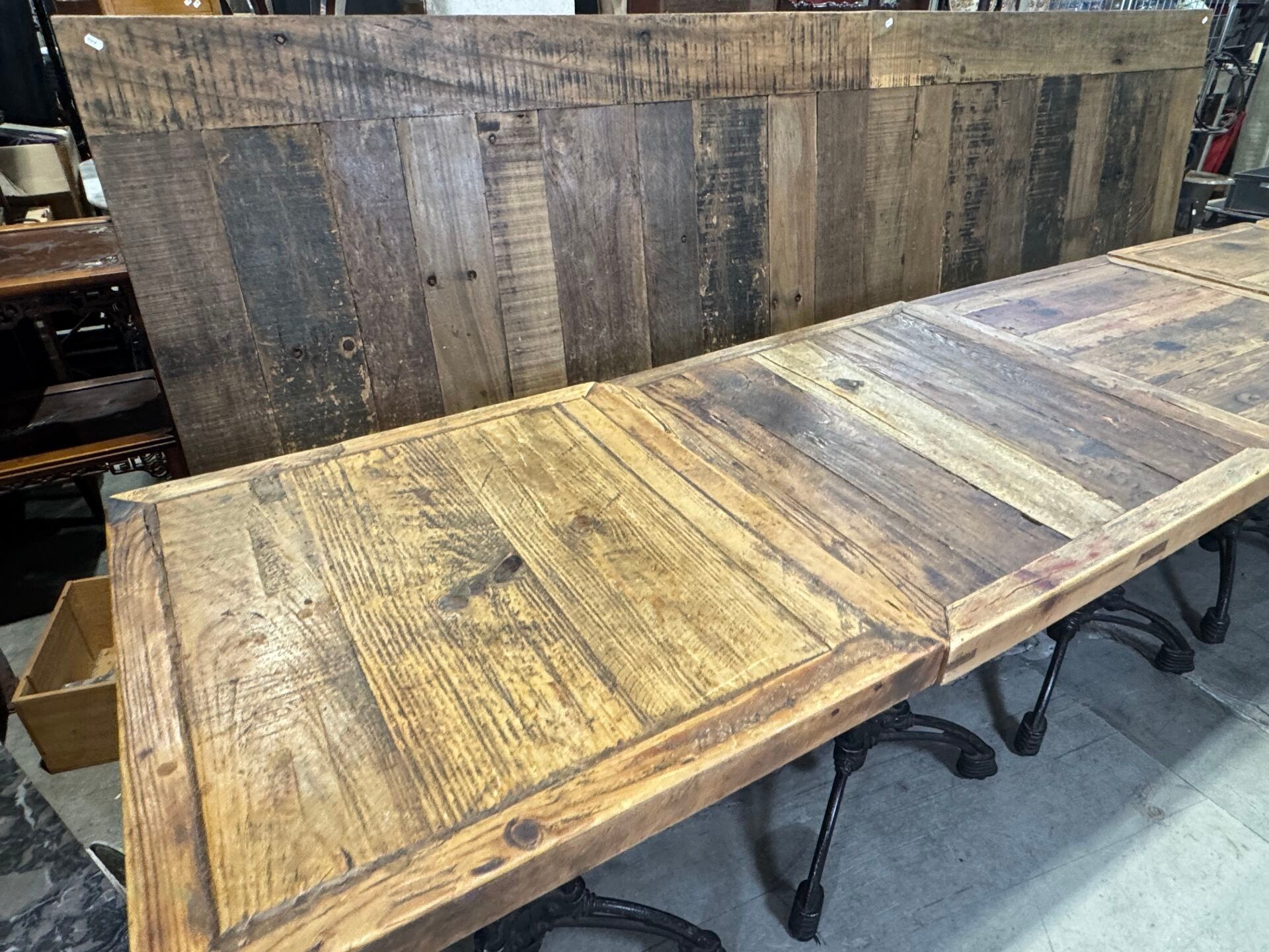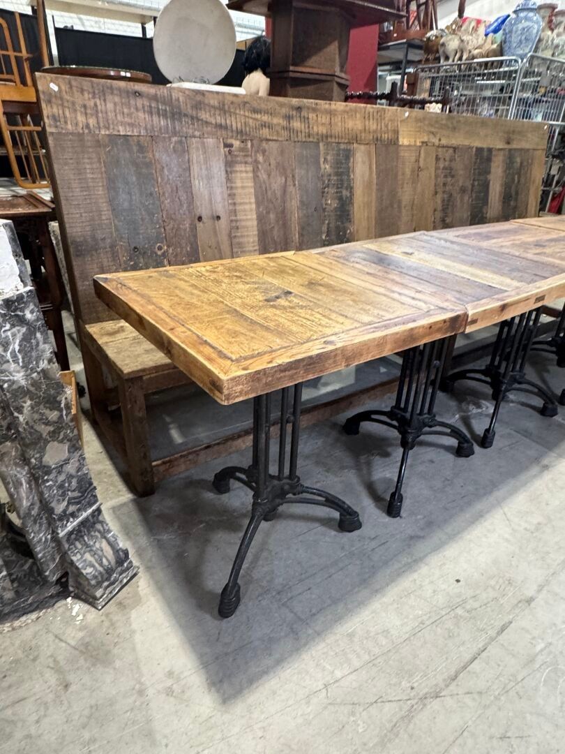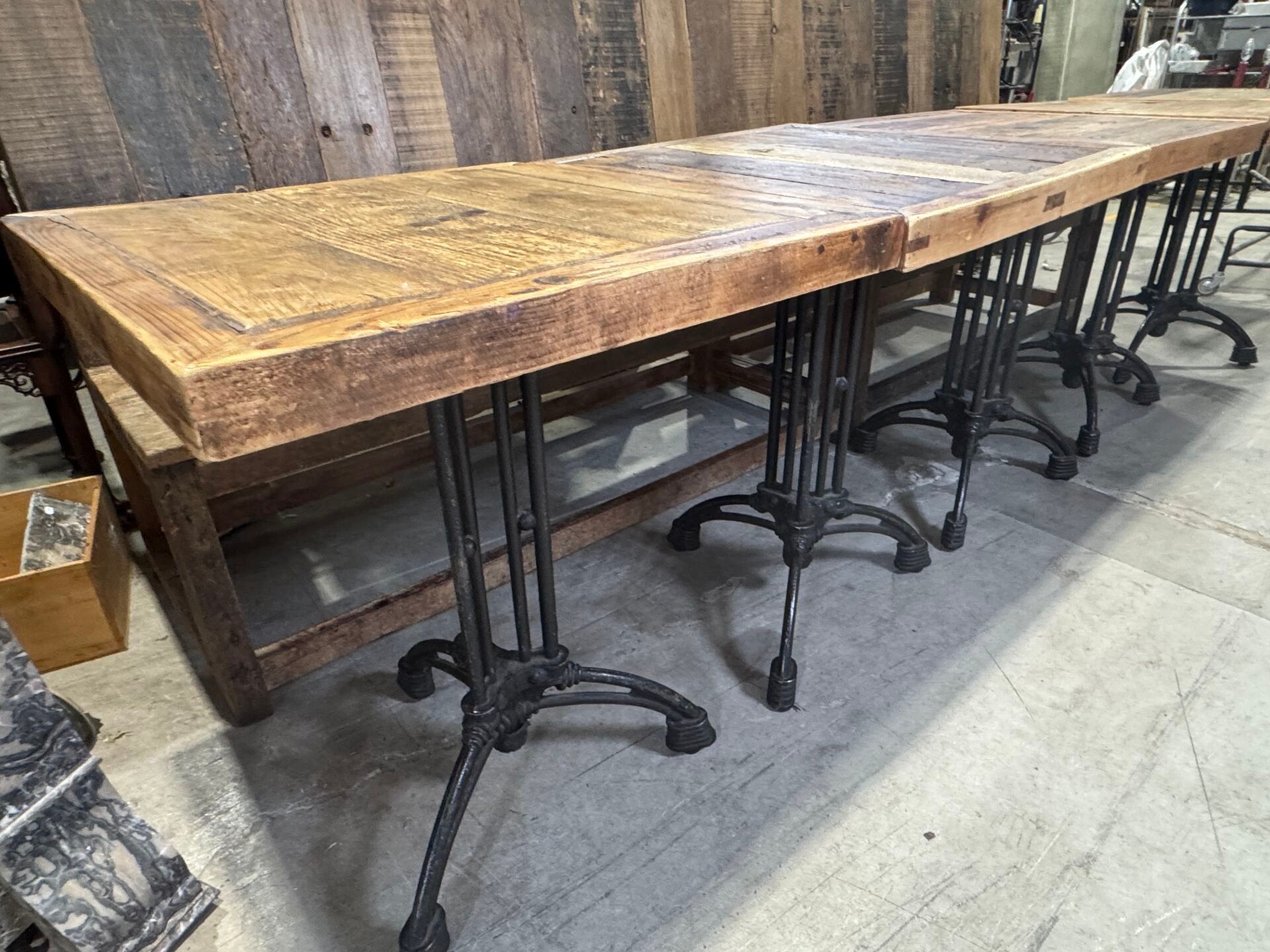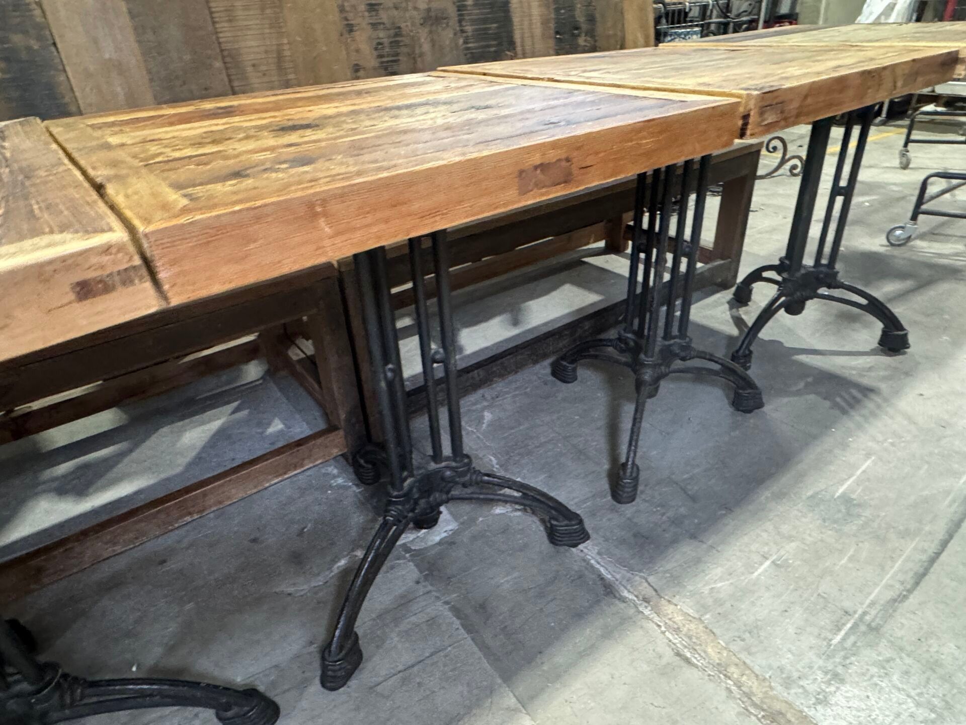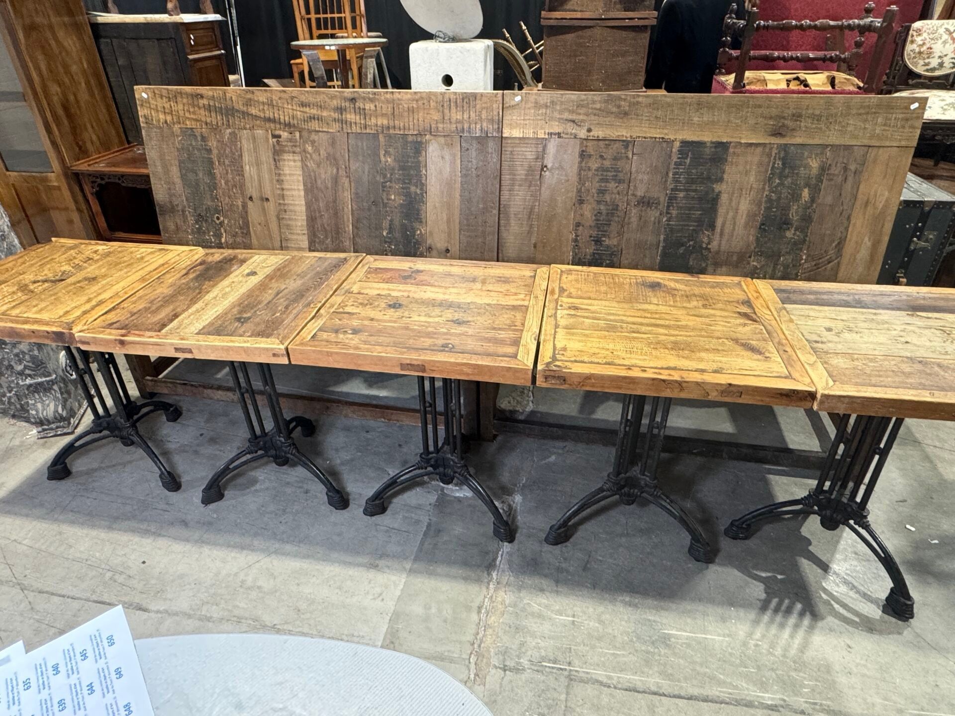 Set of bistro bar furniture in natural wood with cast iron legs comprising two benches and five square-top tables.