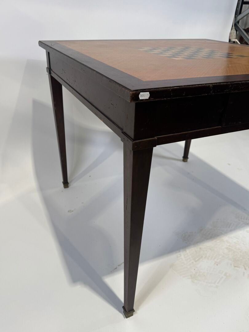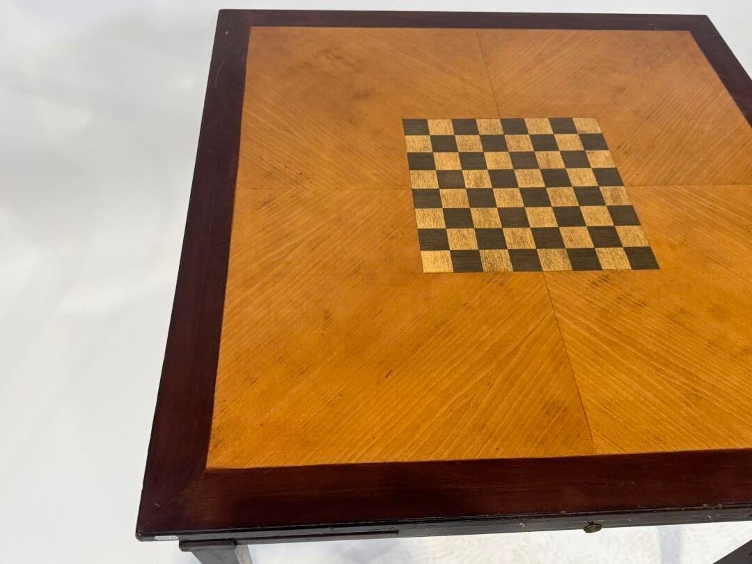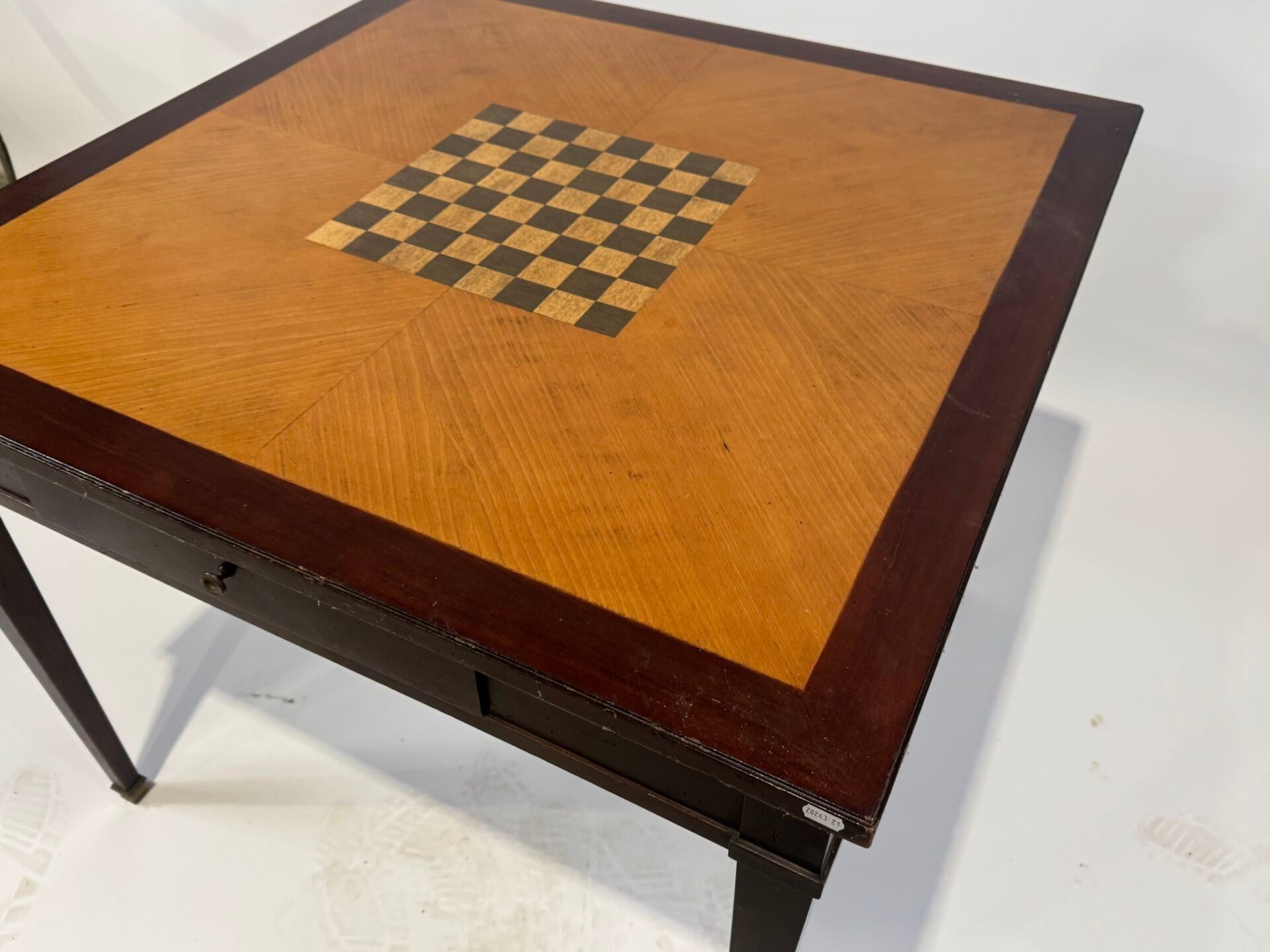 Game table with inlaid chess top opening with two drawers. The legs end in brass sabots. Marked HP.