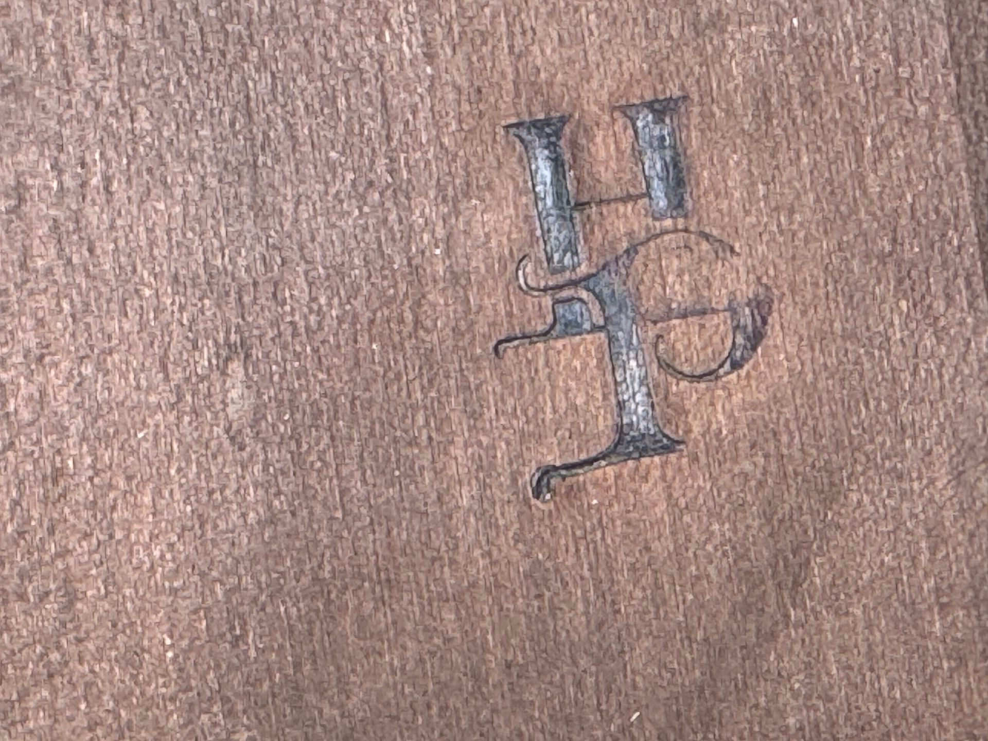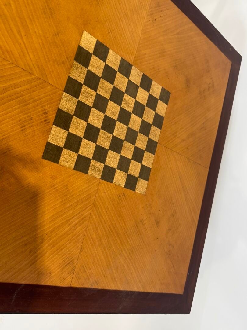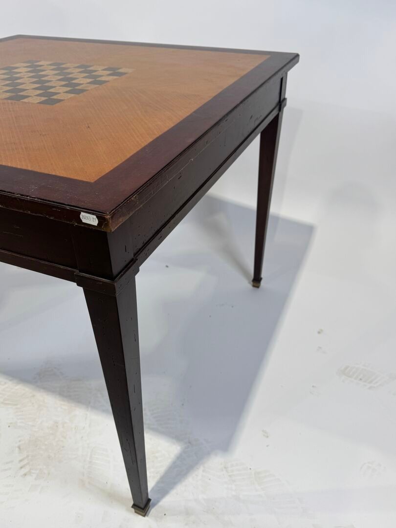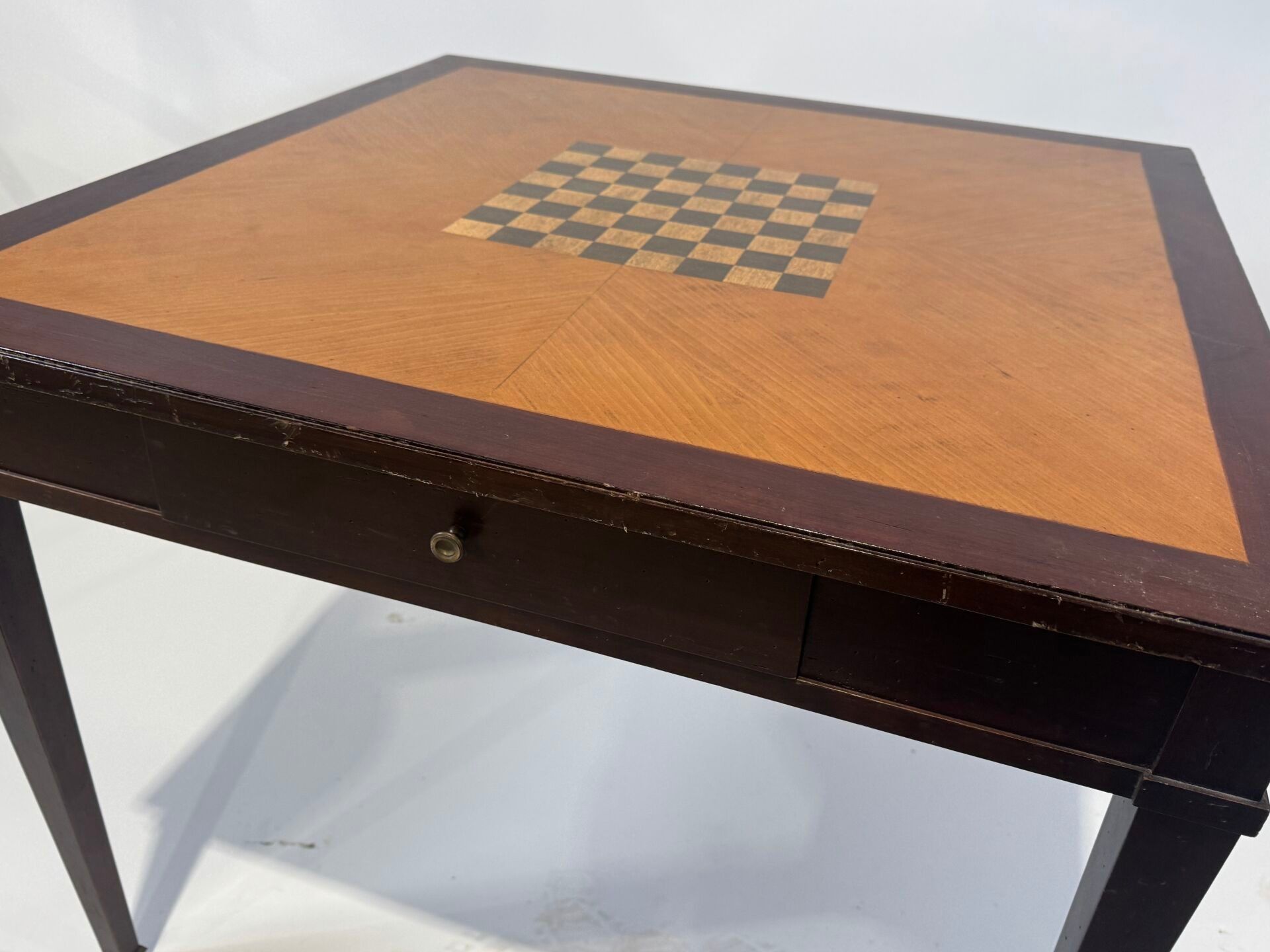 Game table with inlaid chess top opening with two drawers. The legs end in brass sabots. Marked HP.