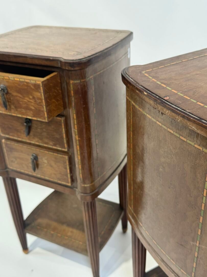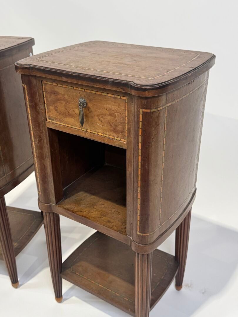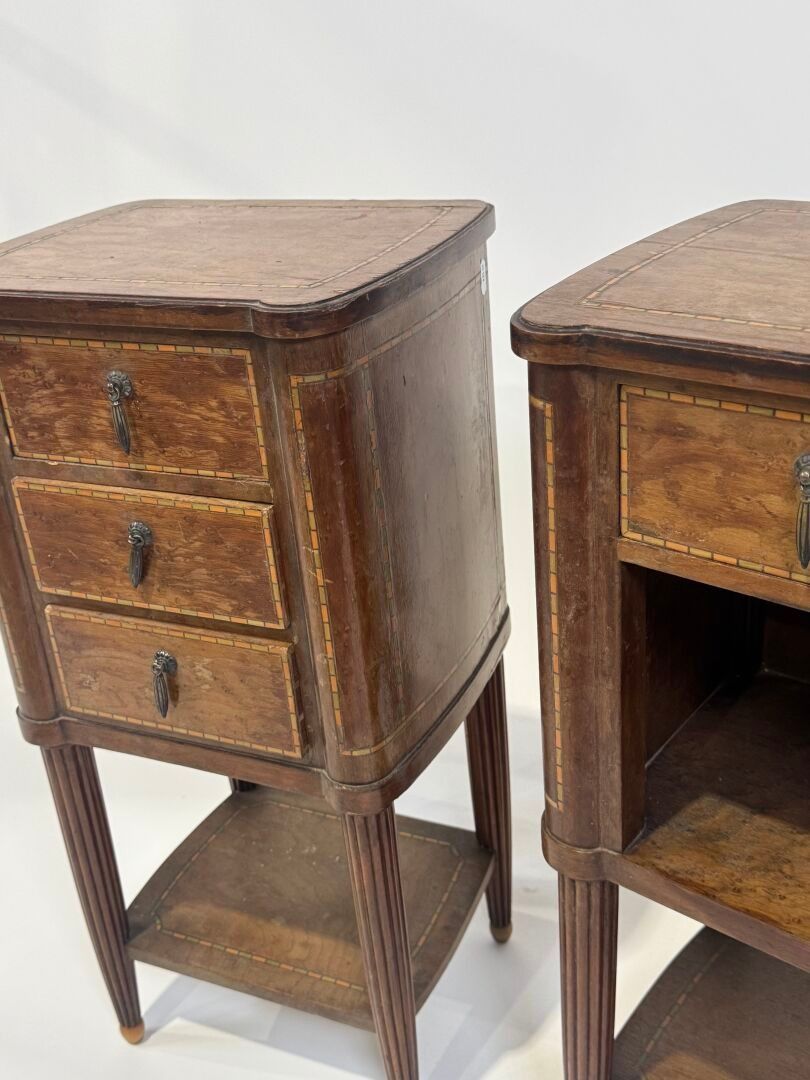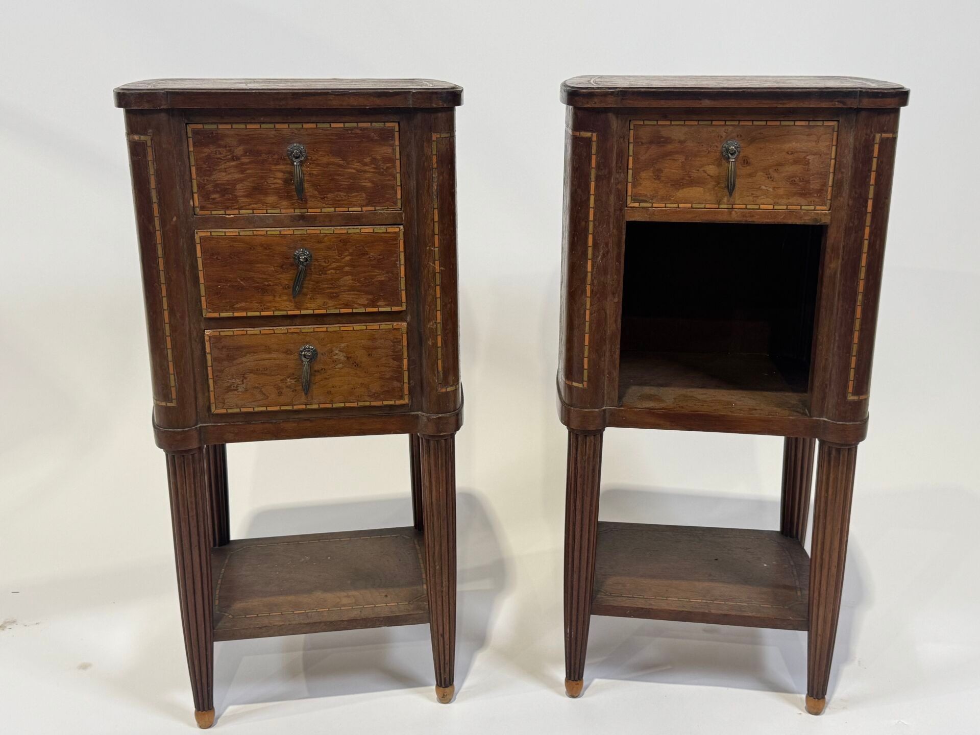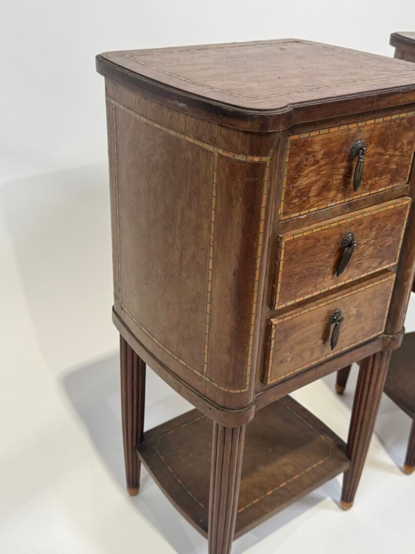 Pair of bedside tables in burl veneer and stained wood fillet marquetry, one opening with three drawers, the other with a drawer and a niche. The tapered fluted legs are joined by a brace. Small brass pull with pendant.
