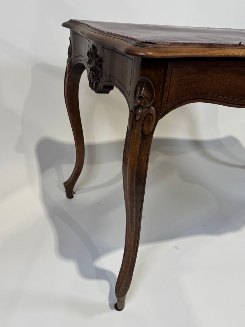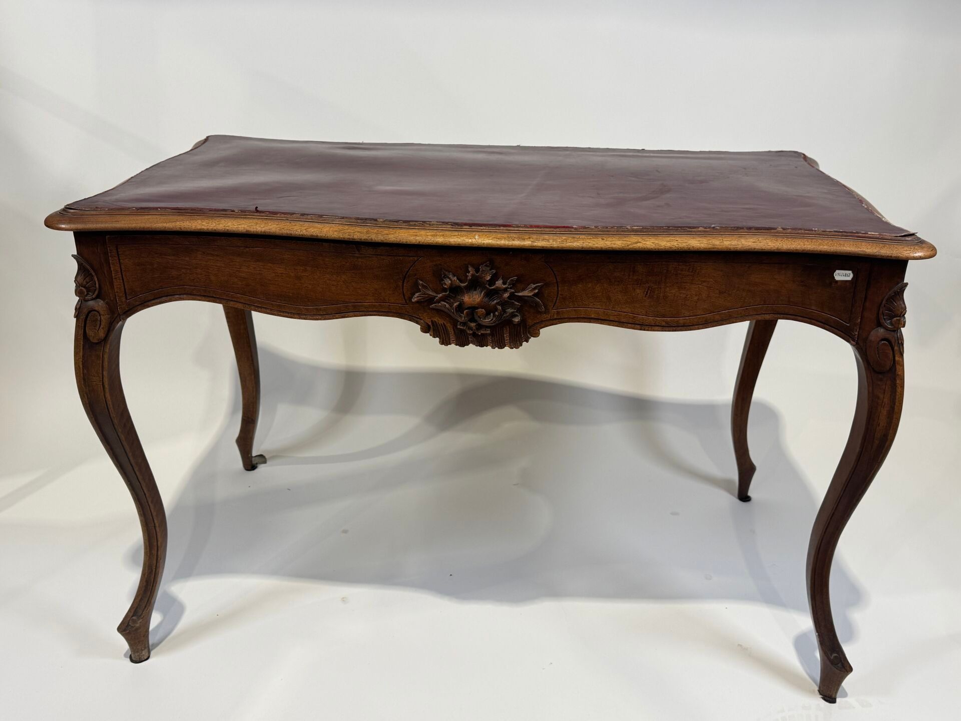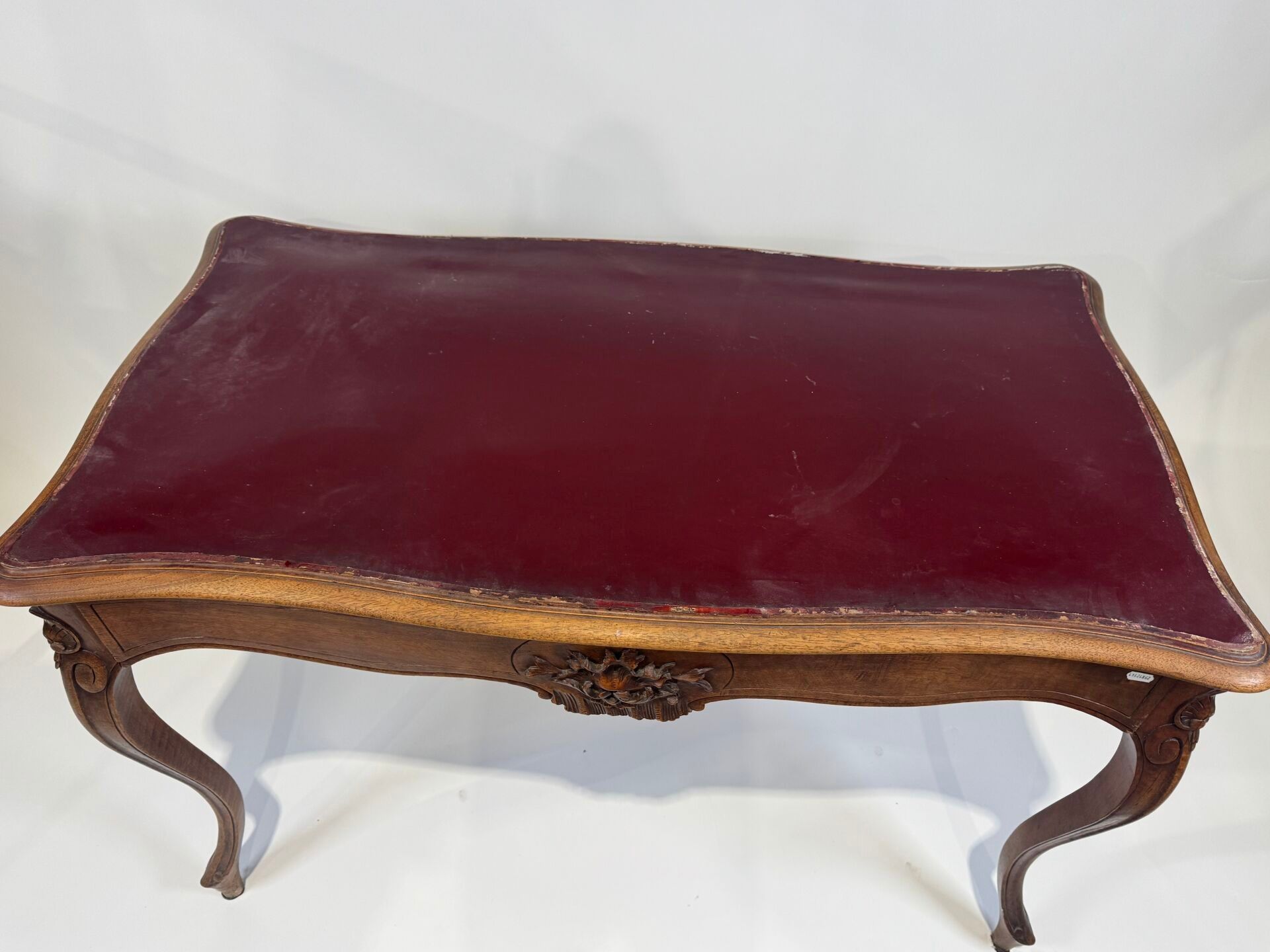 Moulded and carved walnut desk table, the top covered in burgundy leather, opening with a drawer in the waist, the legs slightly arched.