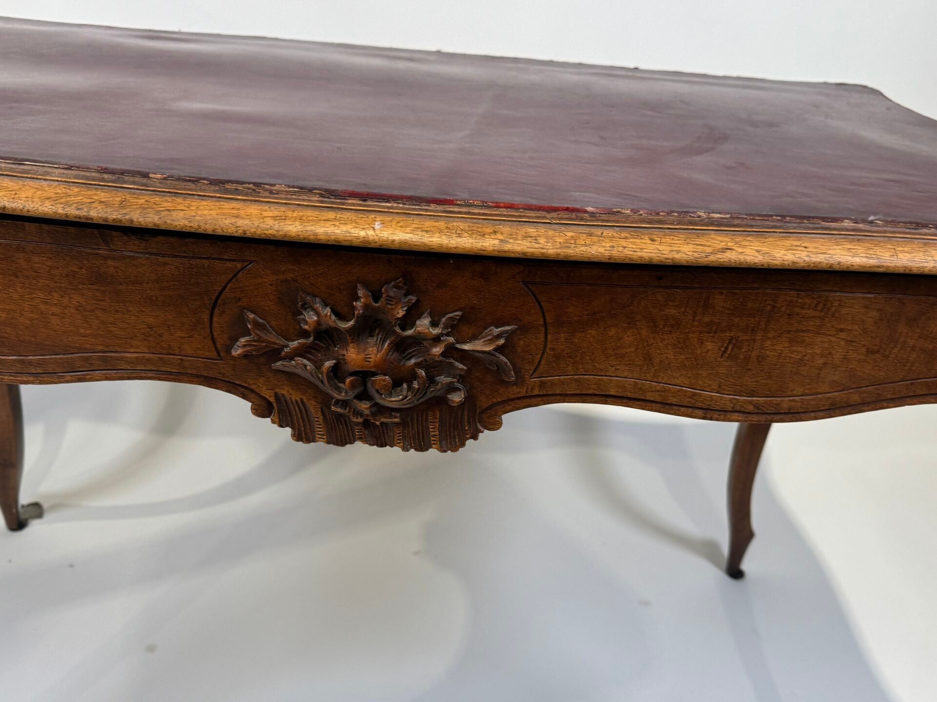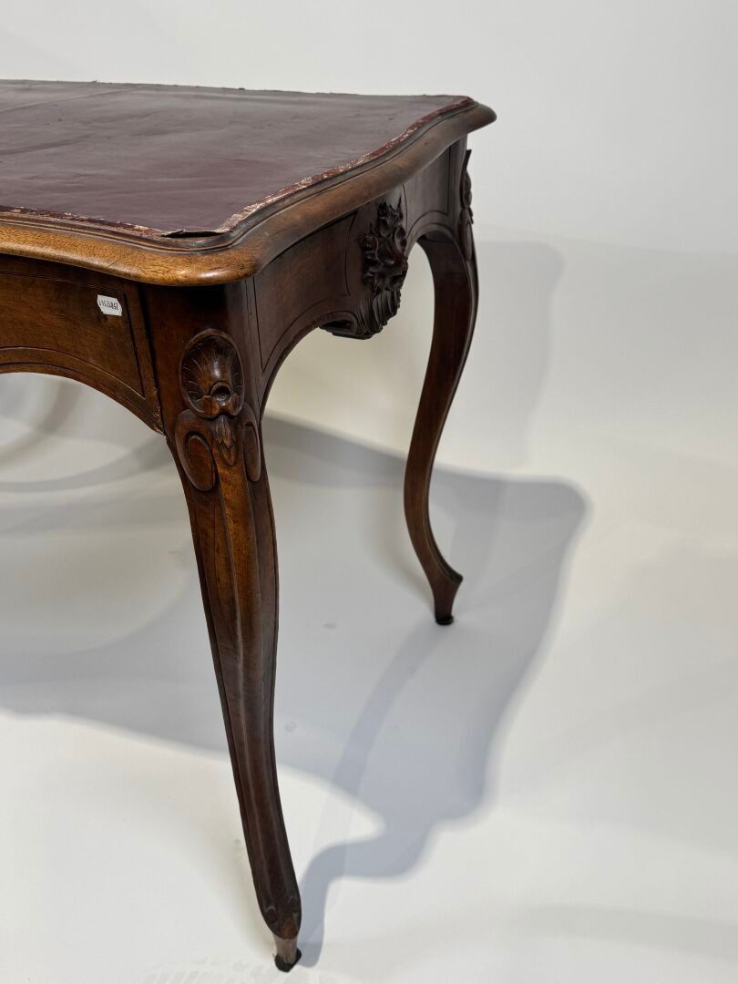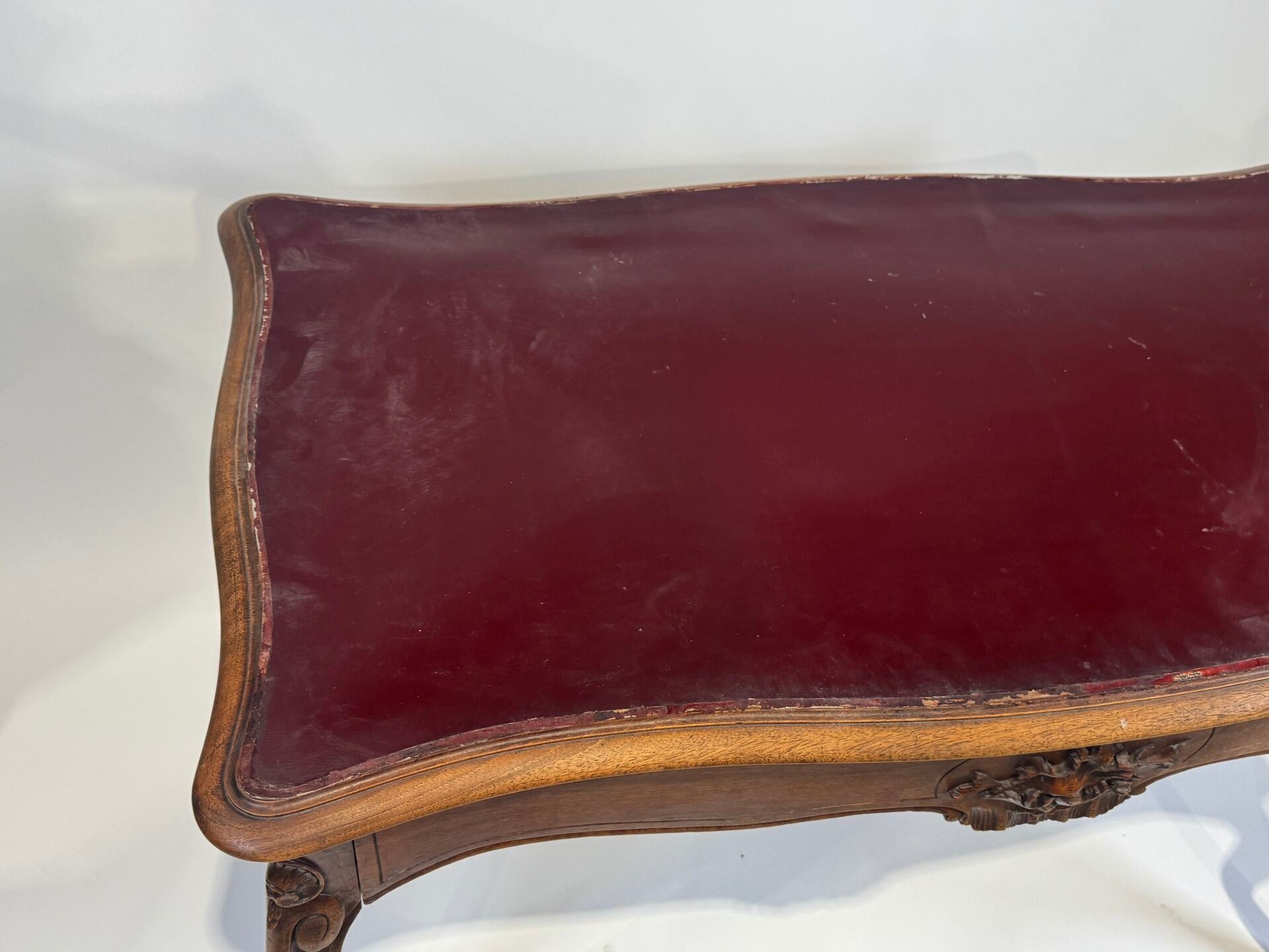 Moulded and carved walnut desk table, the top covered in burgundy leather, opening with a drawer in the waist, the legs slightly arched.