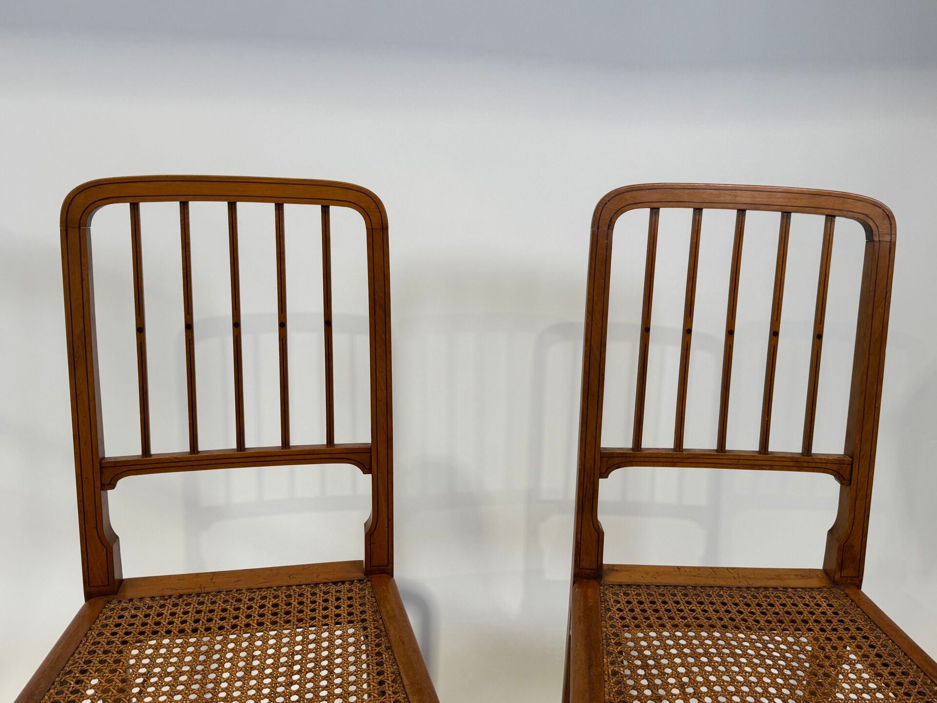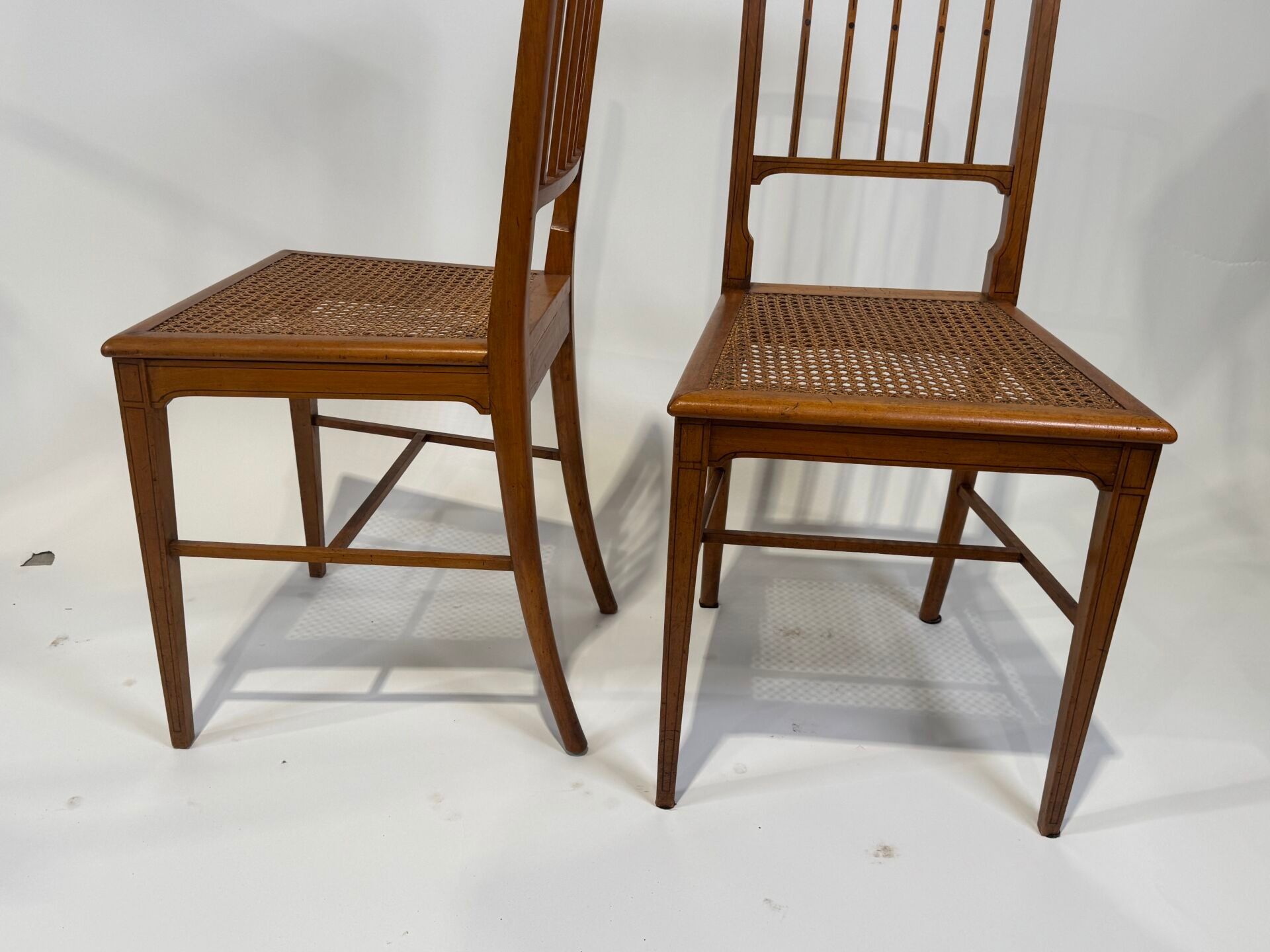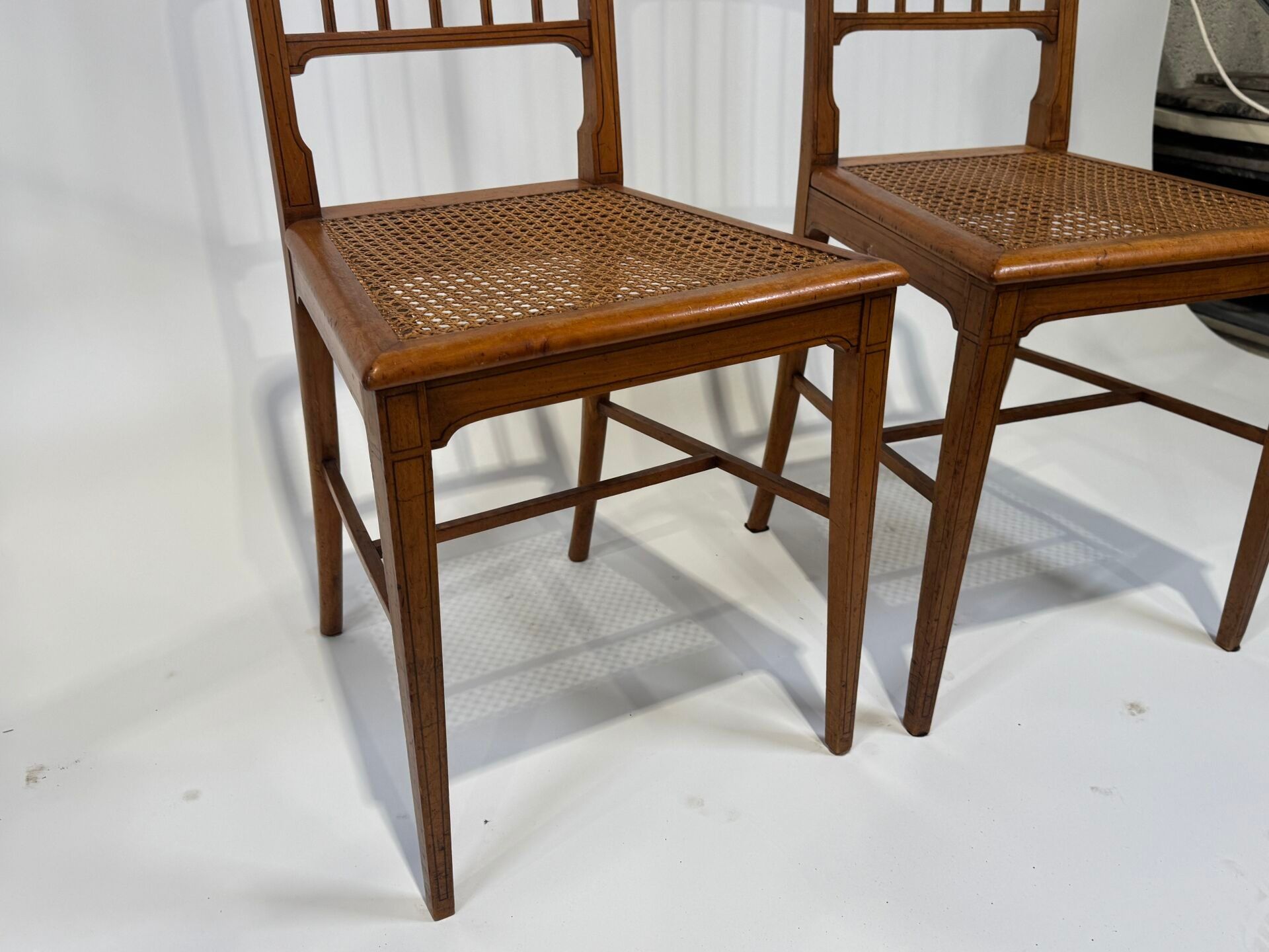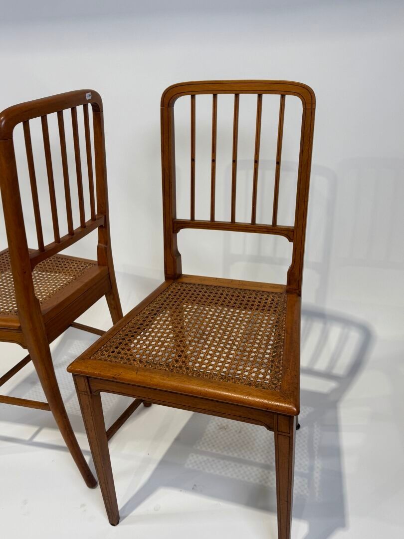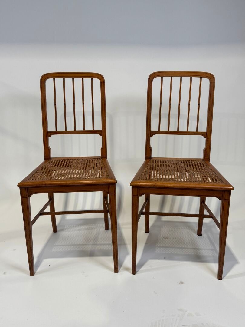 Pair of chairs in light wood with pyrographed fillets, the b…