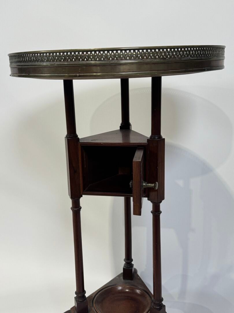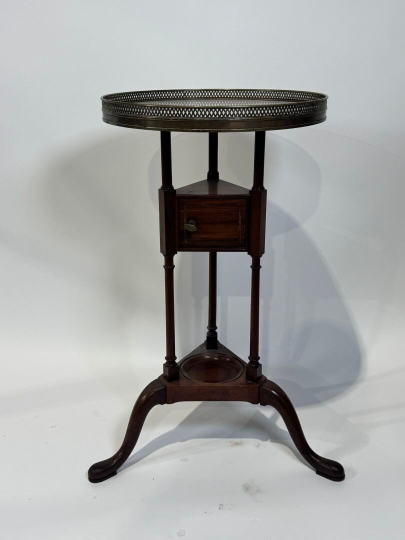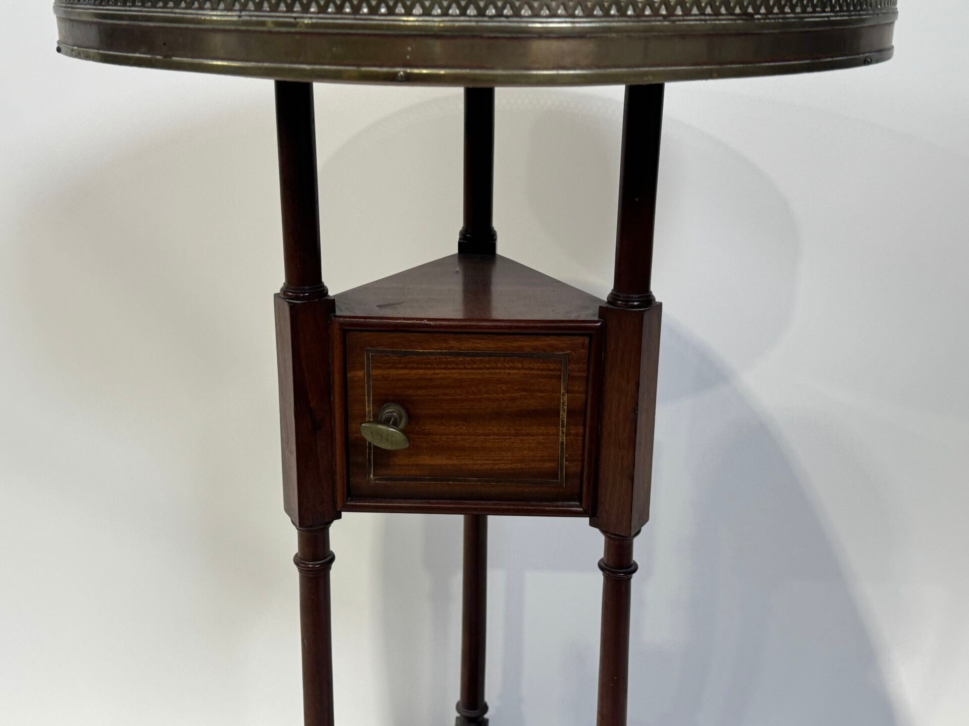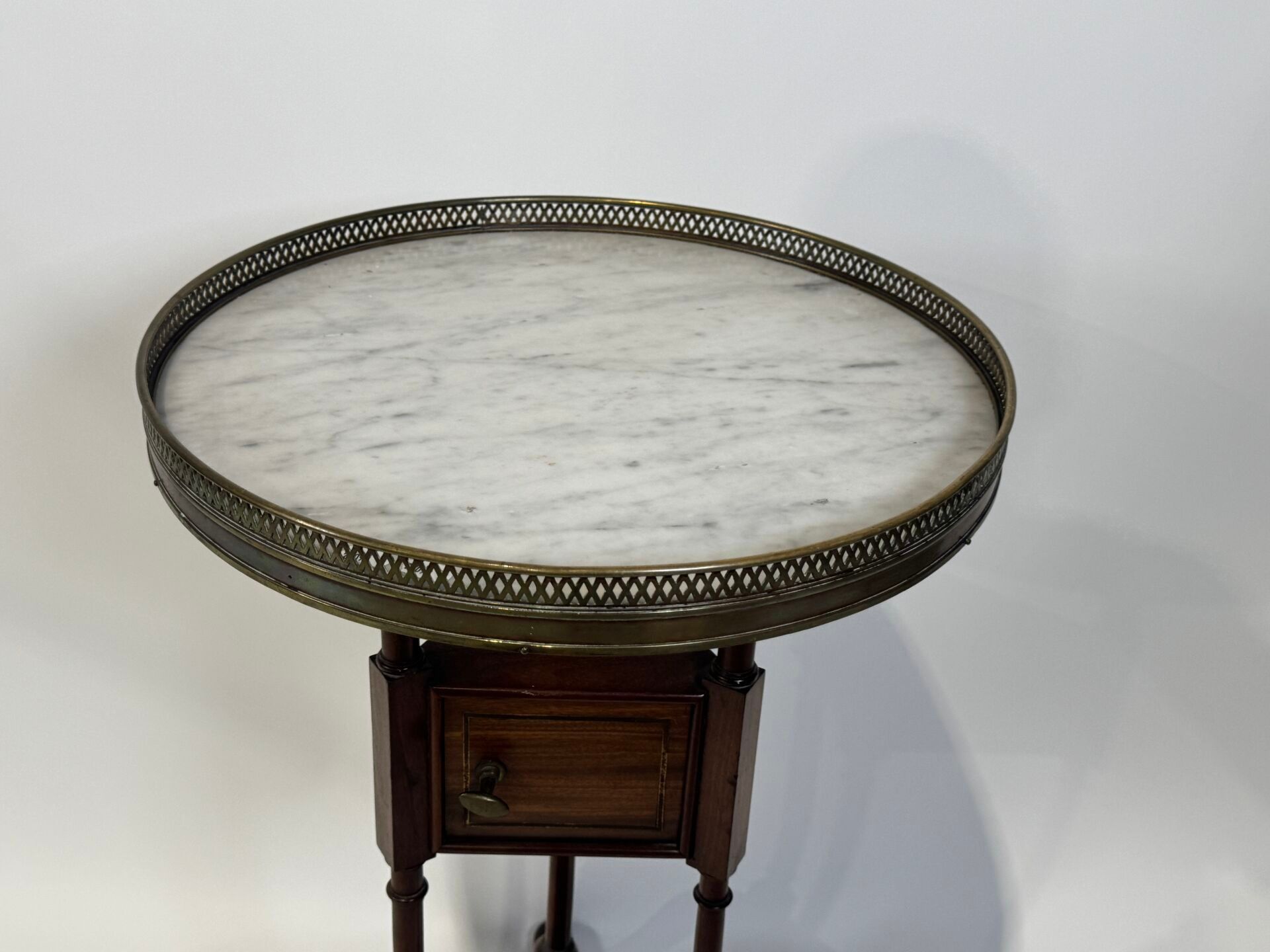 A small tripod pedestal table in moulded mahogany opening with a drawer, the circular top in veined white marble with an openwork brass gallery.
