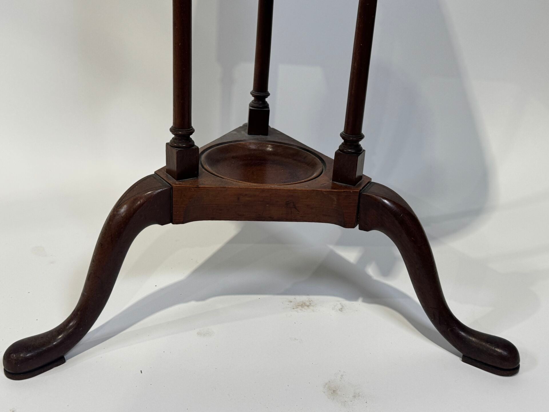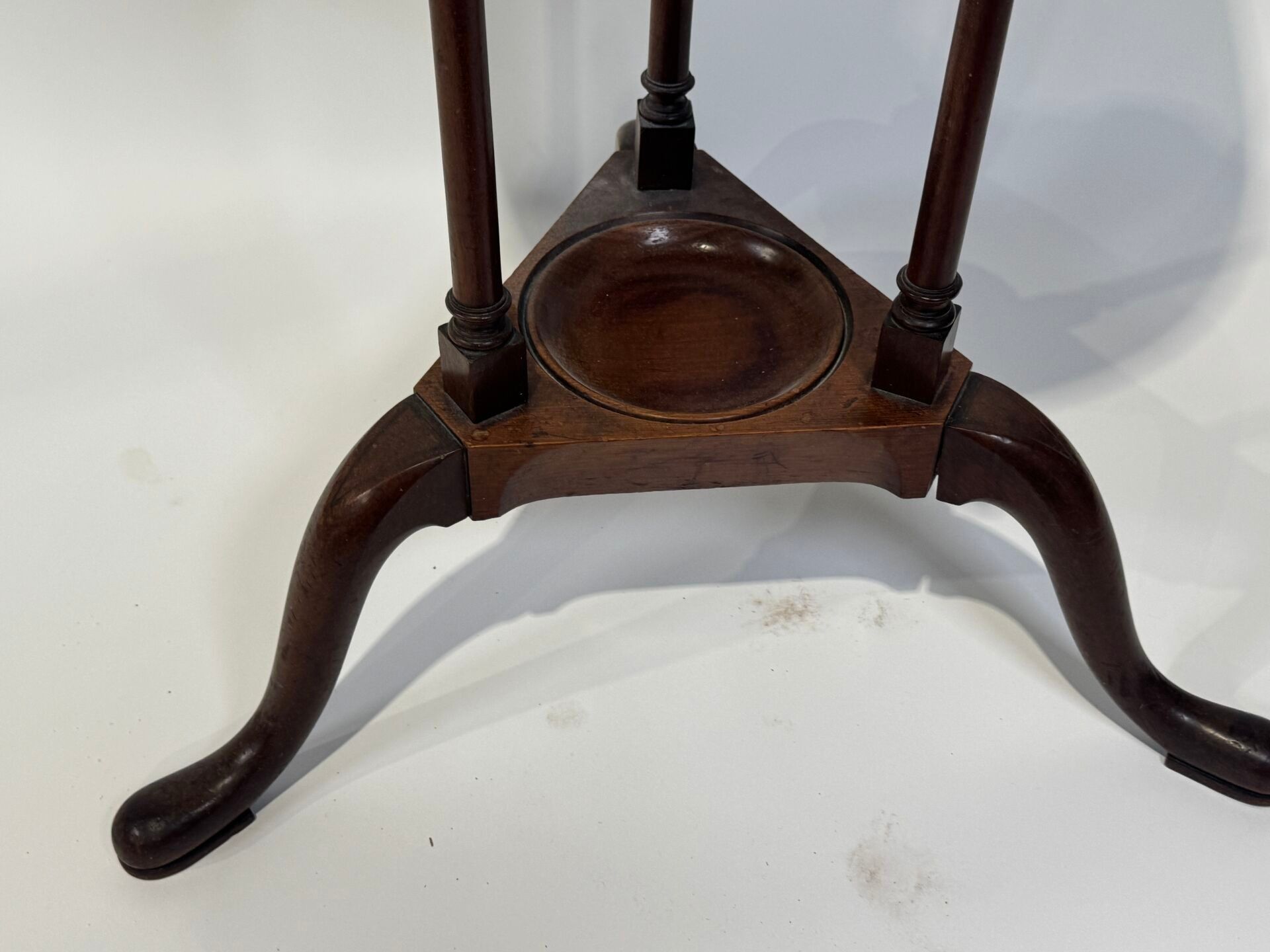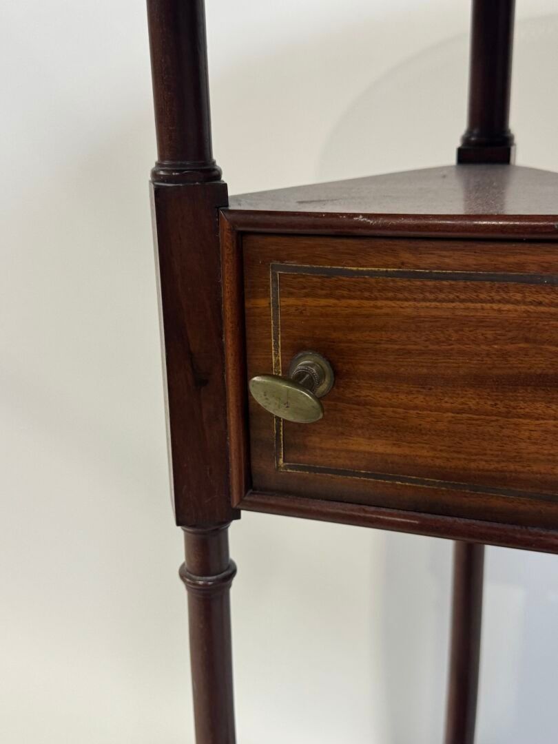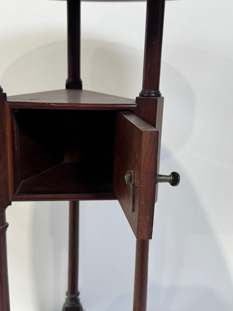 A small tripod pedestal table in moulded mahogany opening with a drawer, the circular top in veined white marble with an openwork brass gallery.