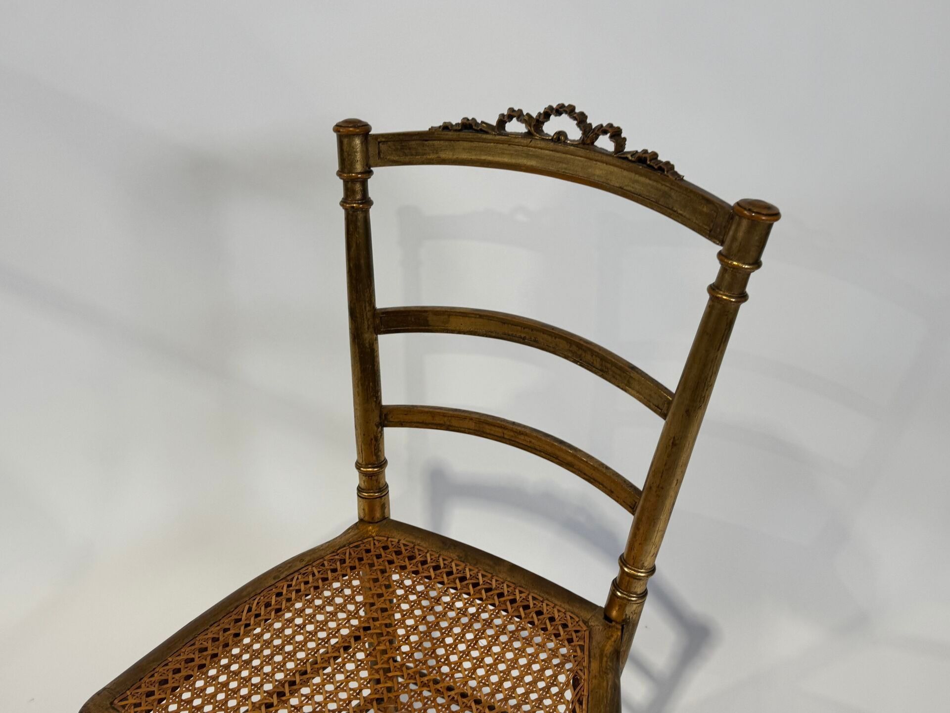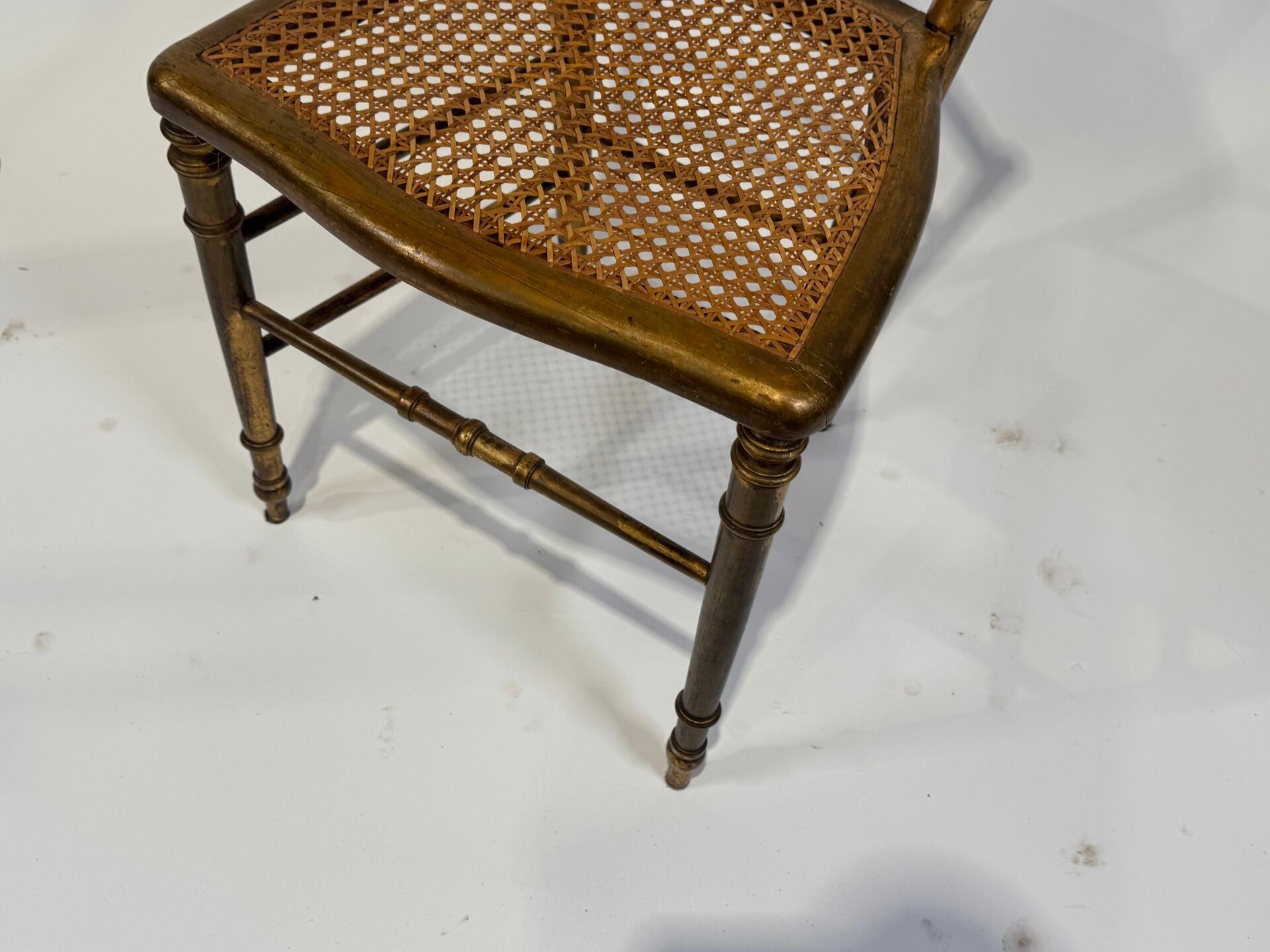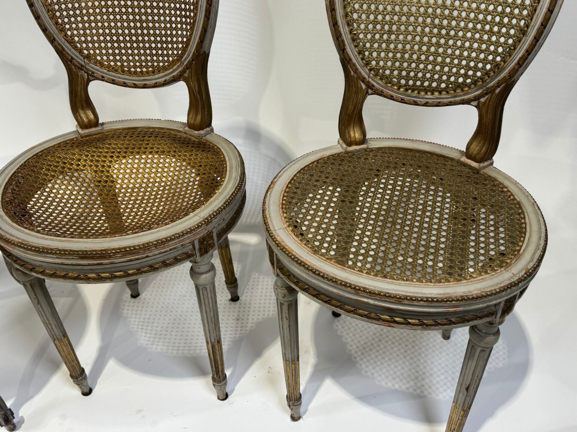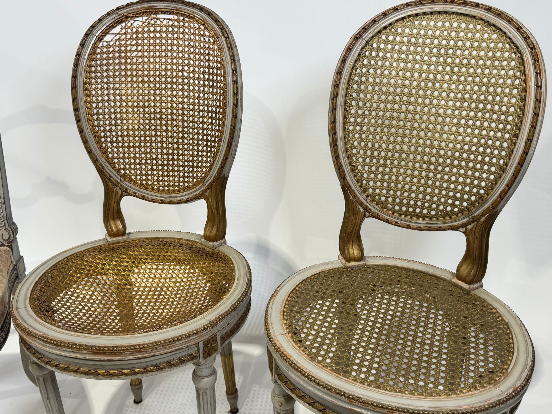 A pair of moulded and carved wooden cane chairs with a medallion back and circular seat. The legs are tapered, fluted and gilded.