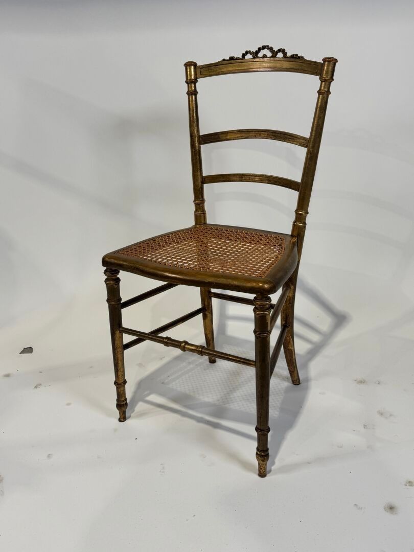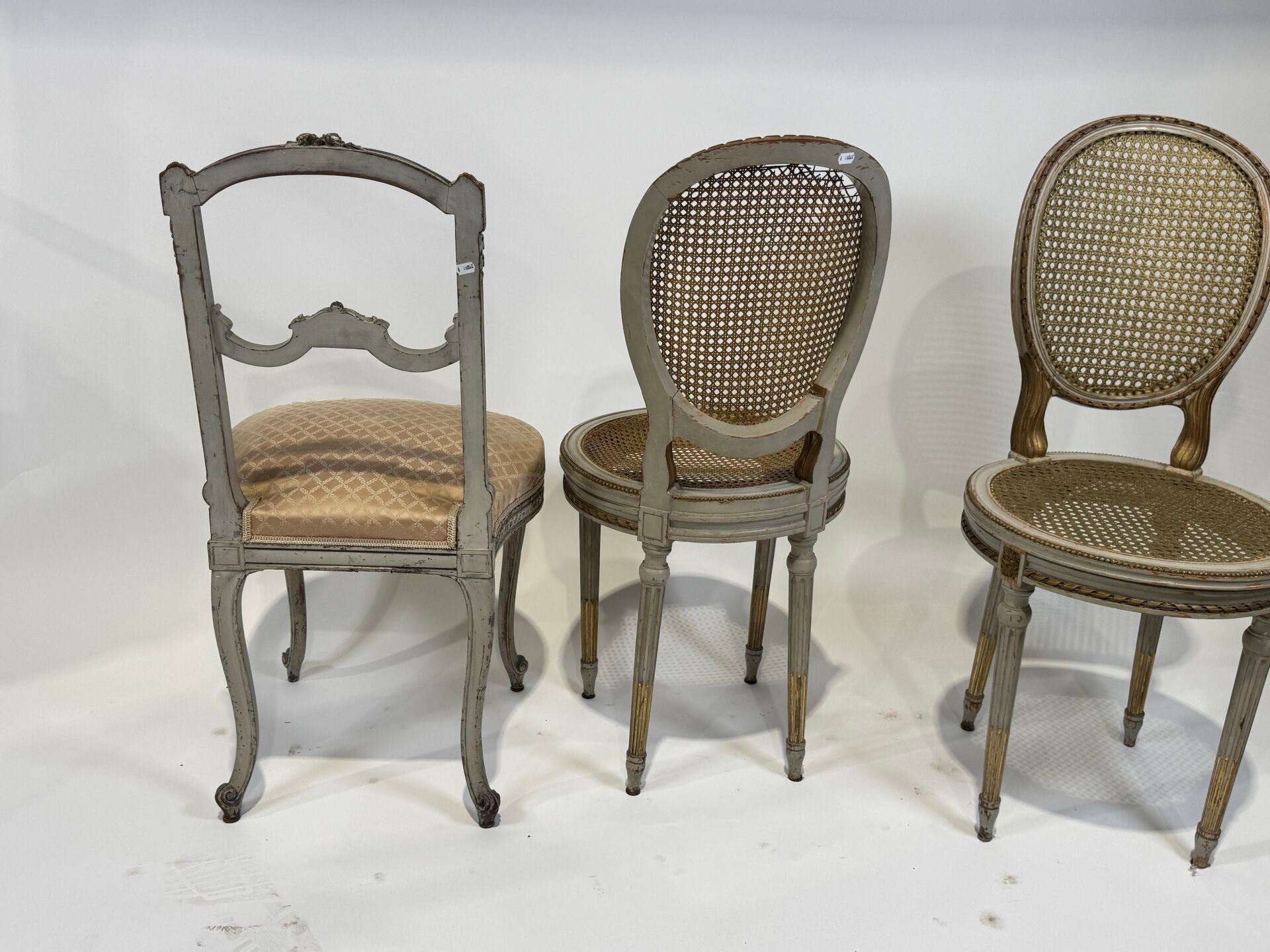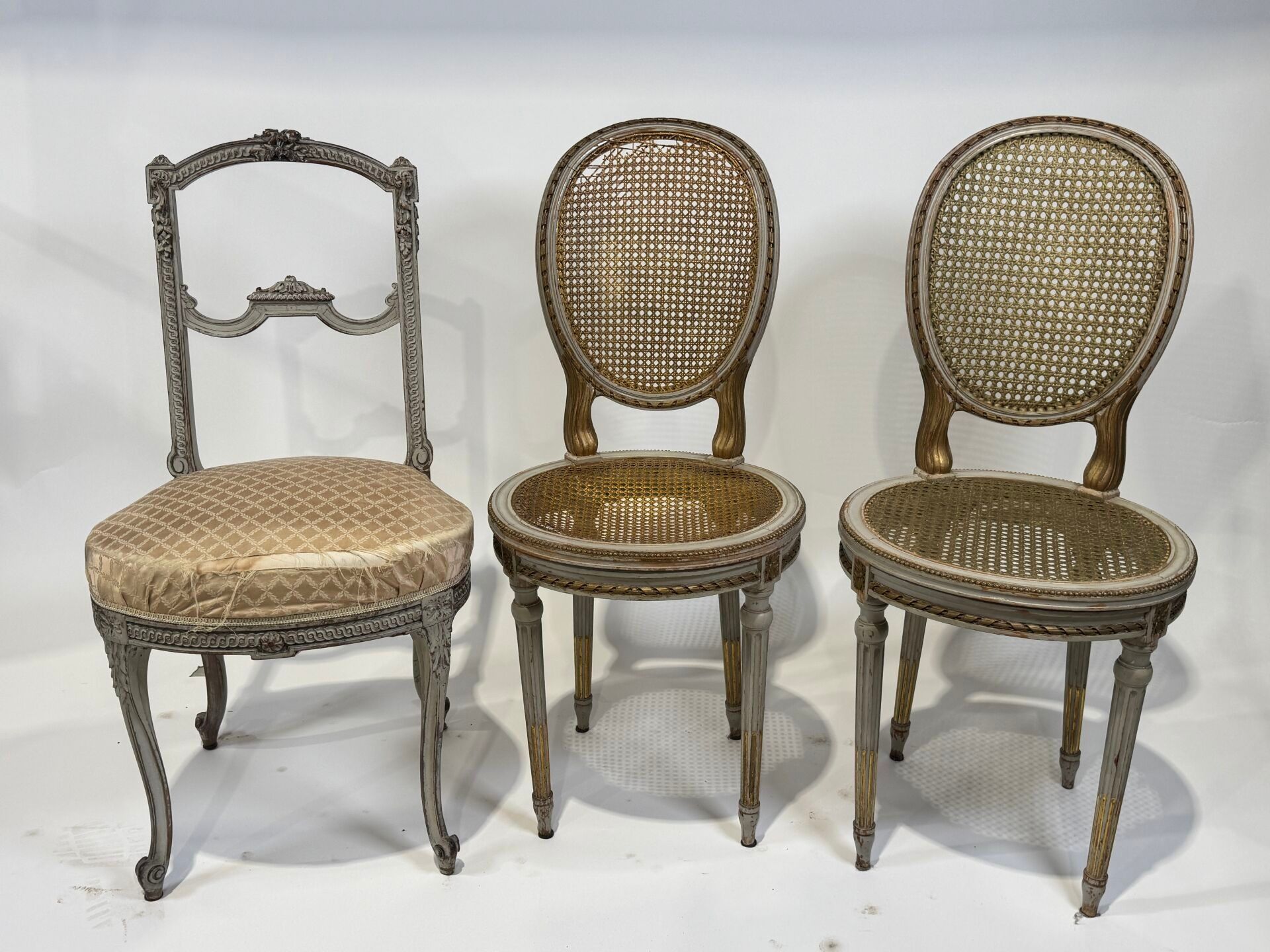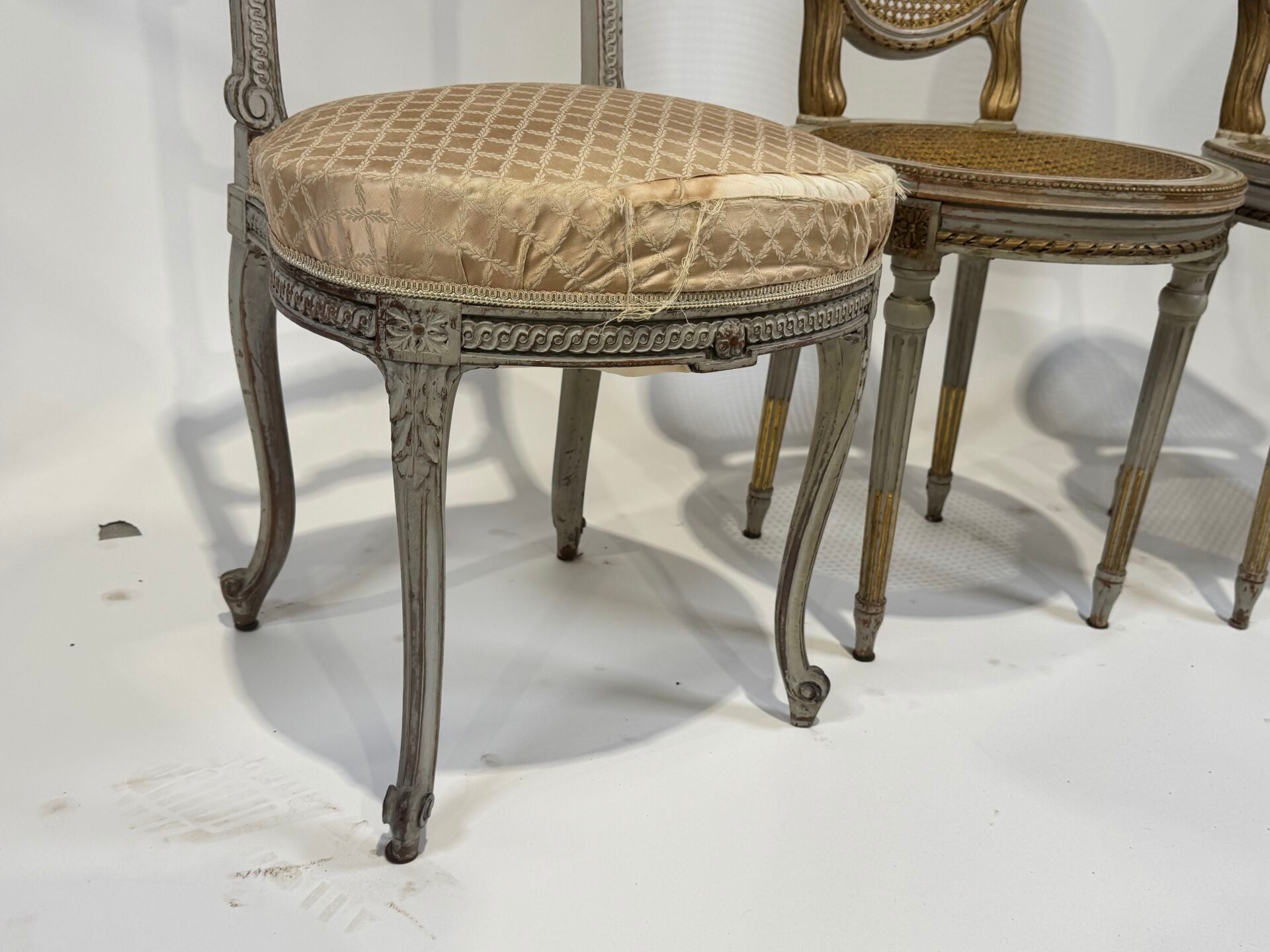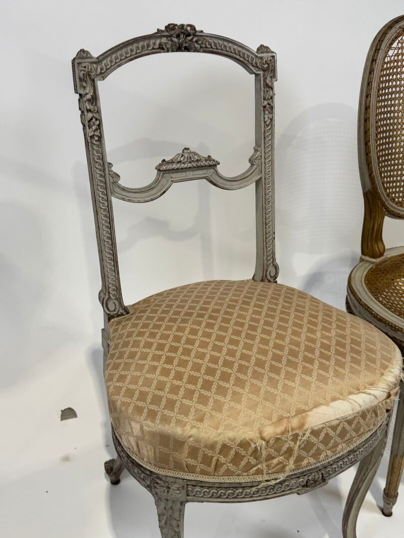 A moulded, carved and grey lacquered wooden chair (89 x 45 x 42 cm) and a Napoleon III chair in gilded wood.