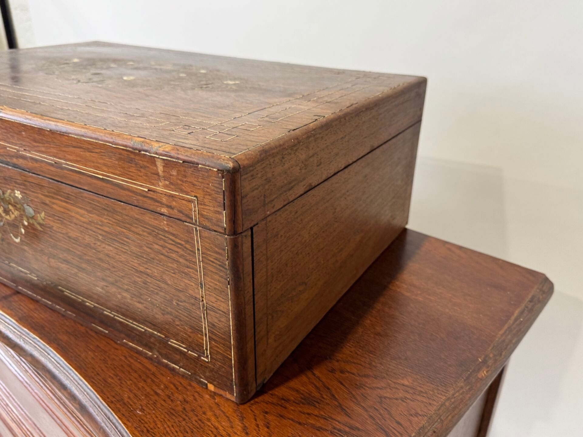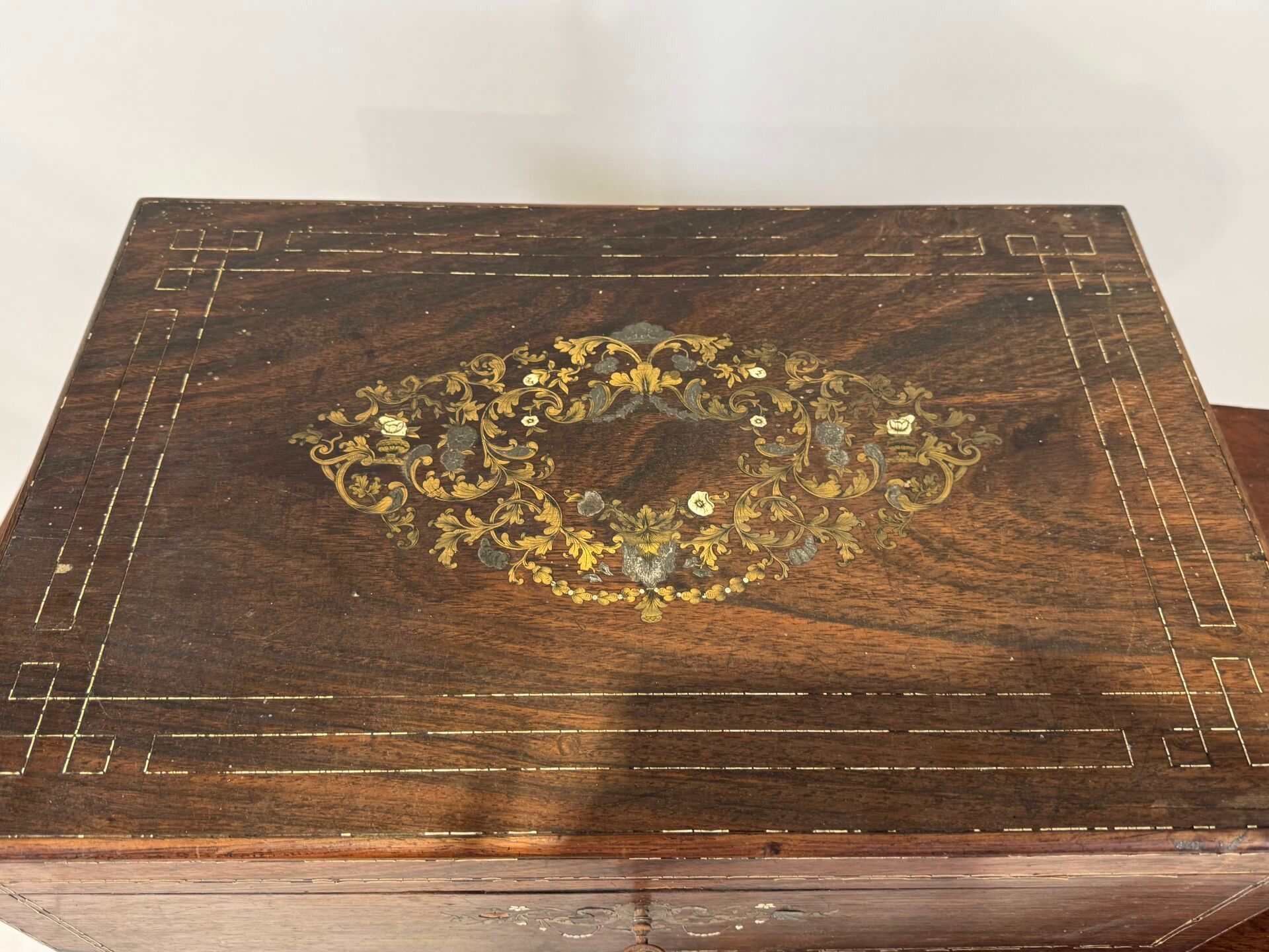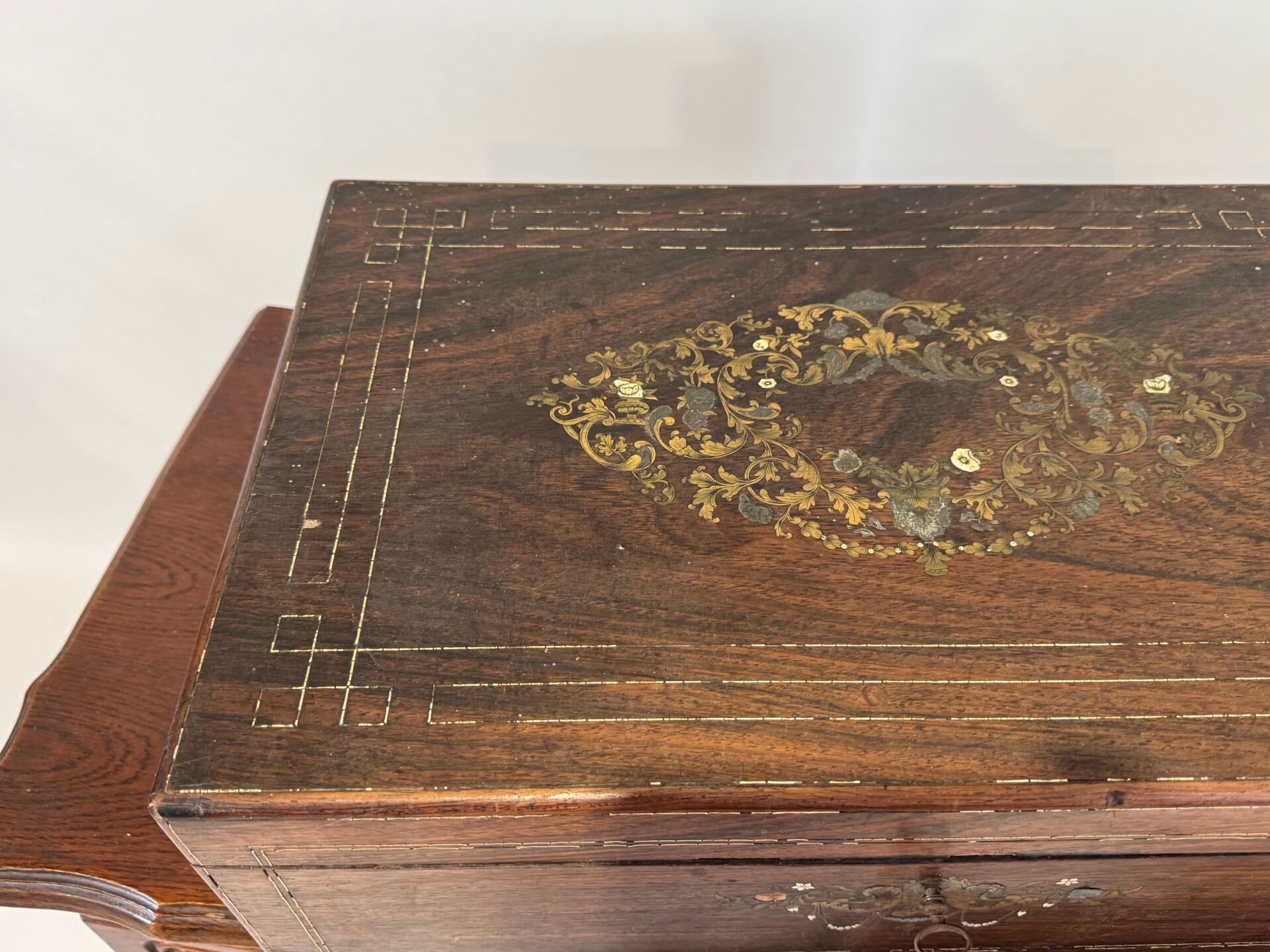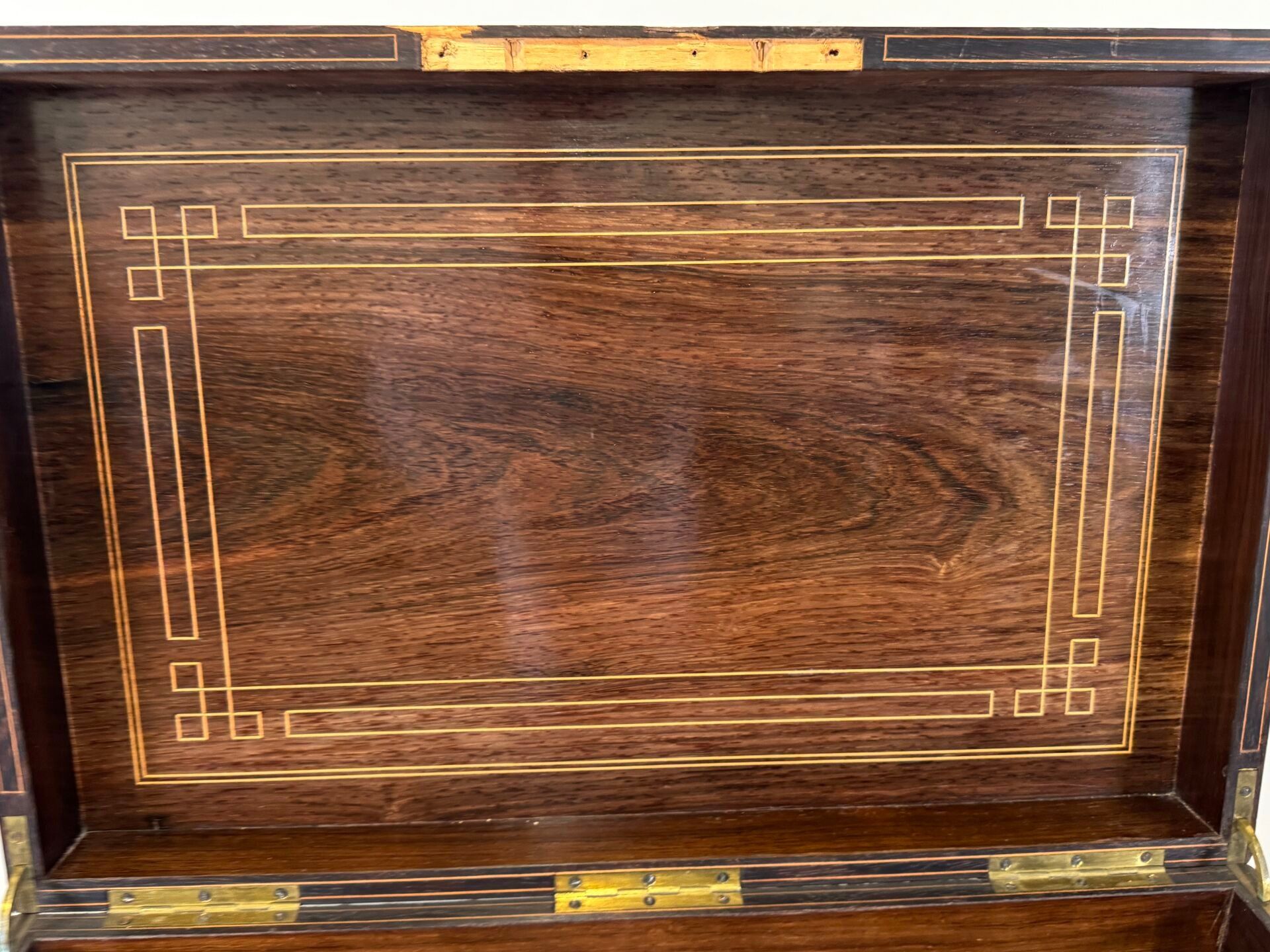 Rosewood veneered chest, the lid and front panel decorated with brass marquetry and bone inlays.