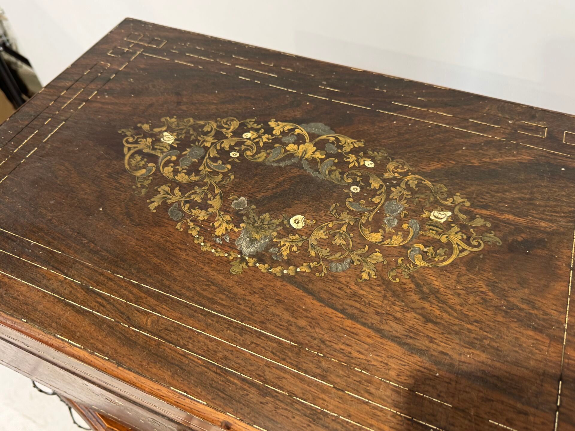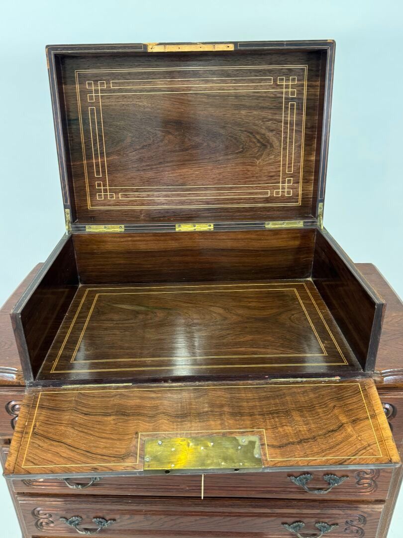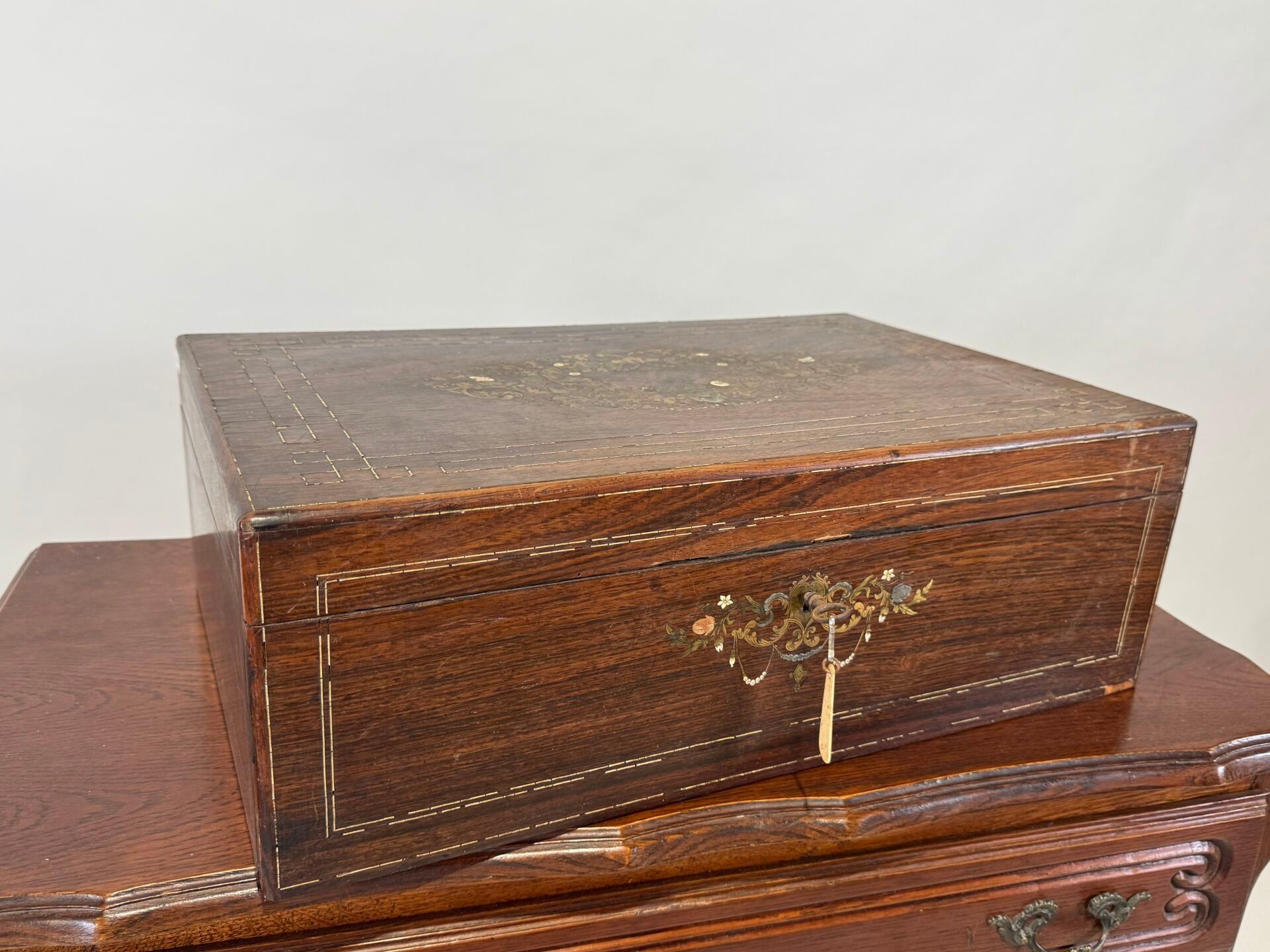 Rosewood veneered chest, the lid and front panel decorated with brass marquetry and bone inlays.