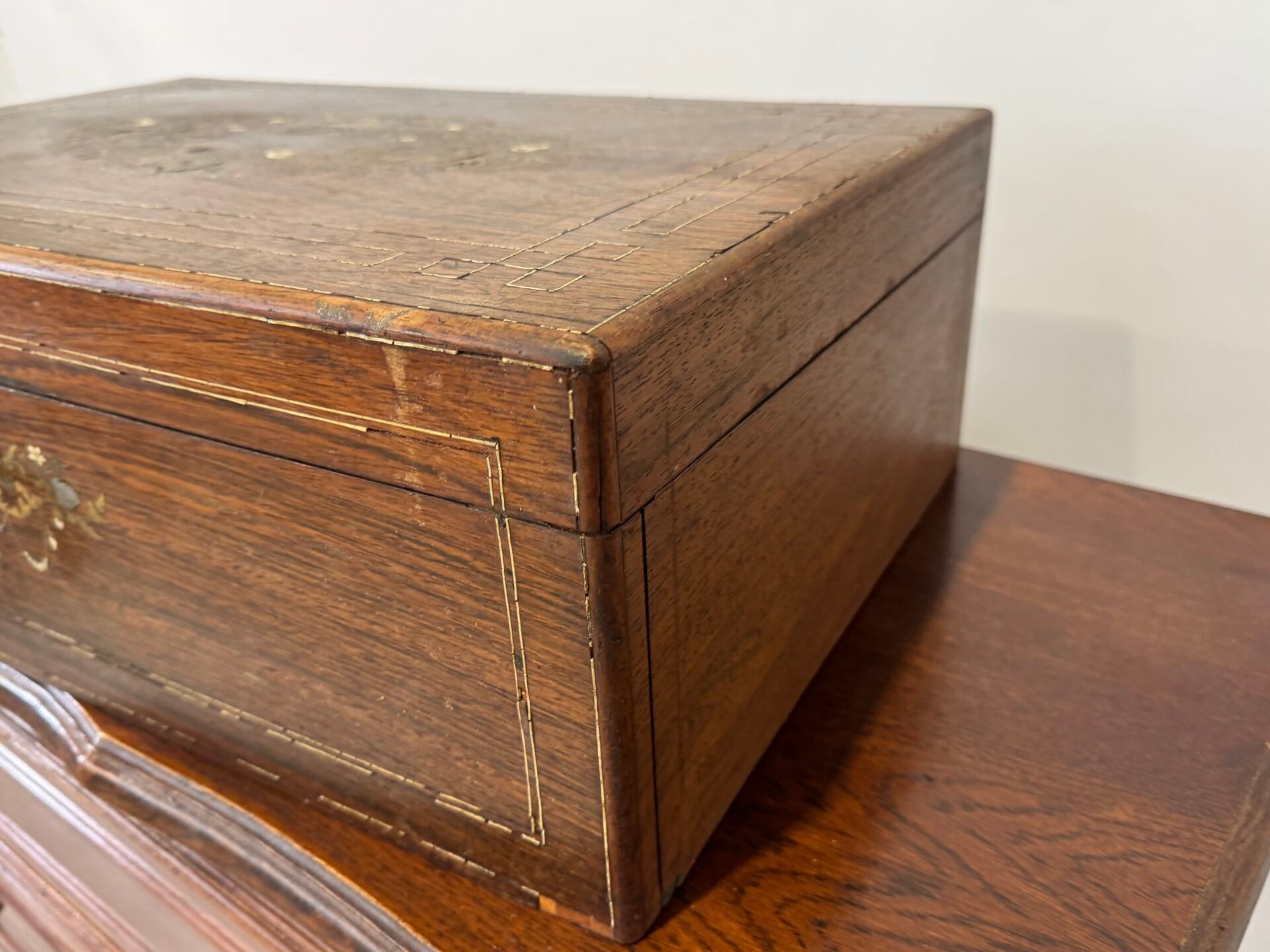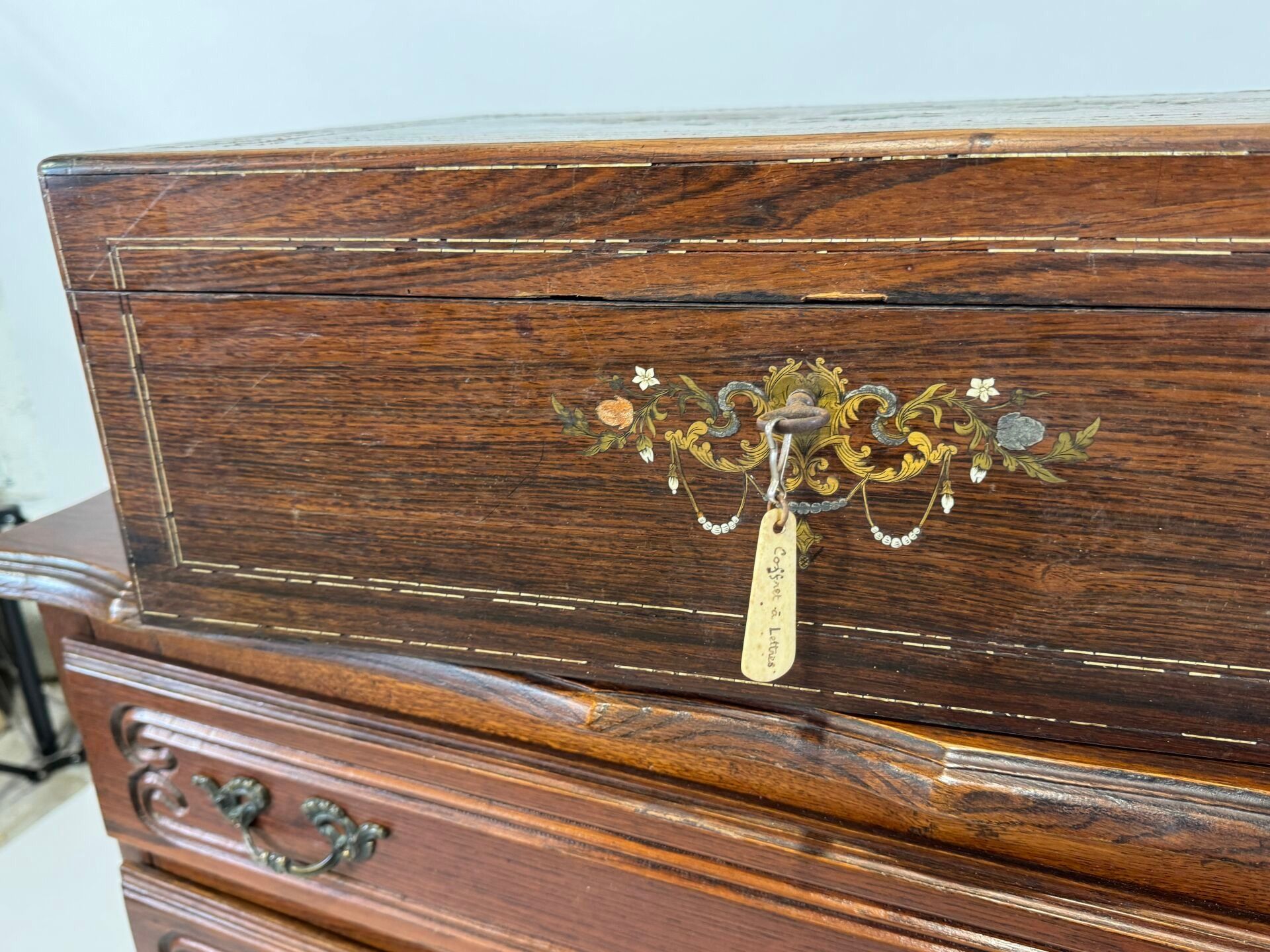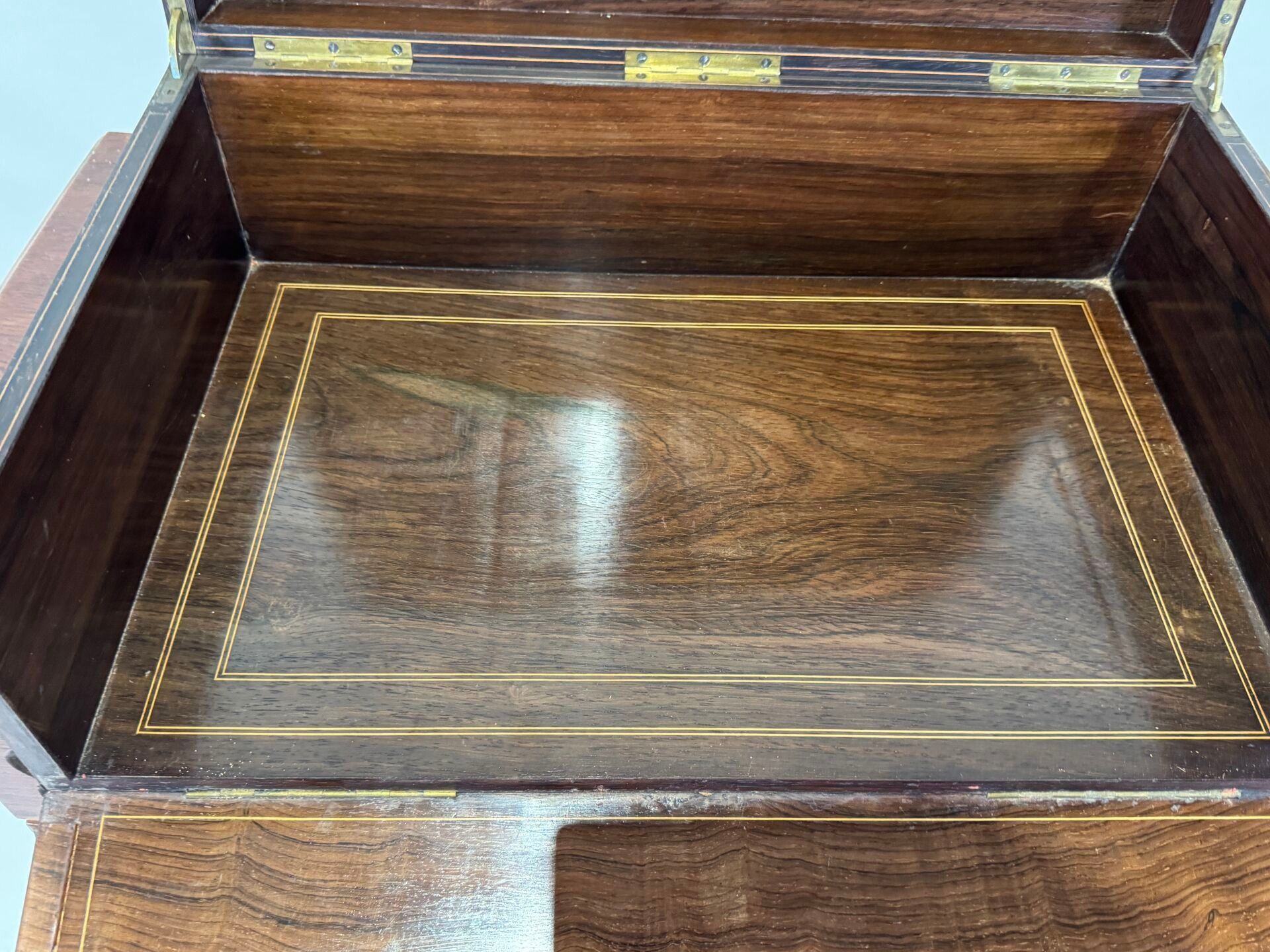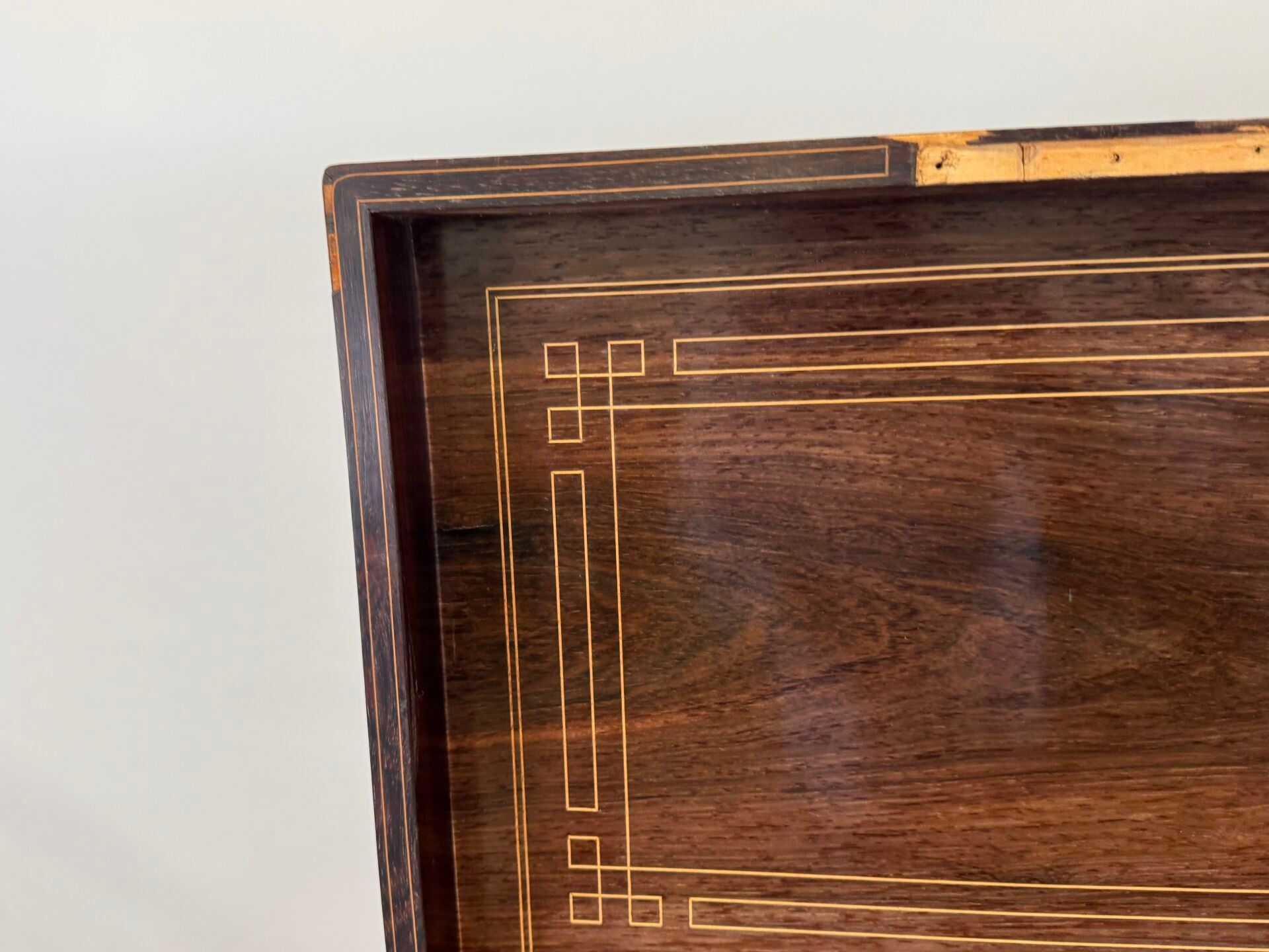 Rosewood veneered chest, the lid and front panel decorated with brass marquetry and bone inlays.