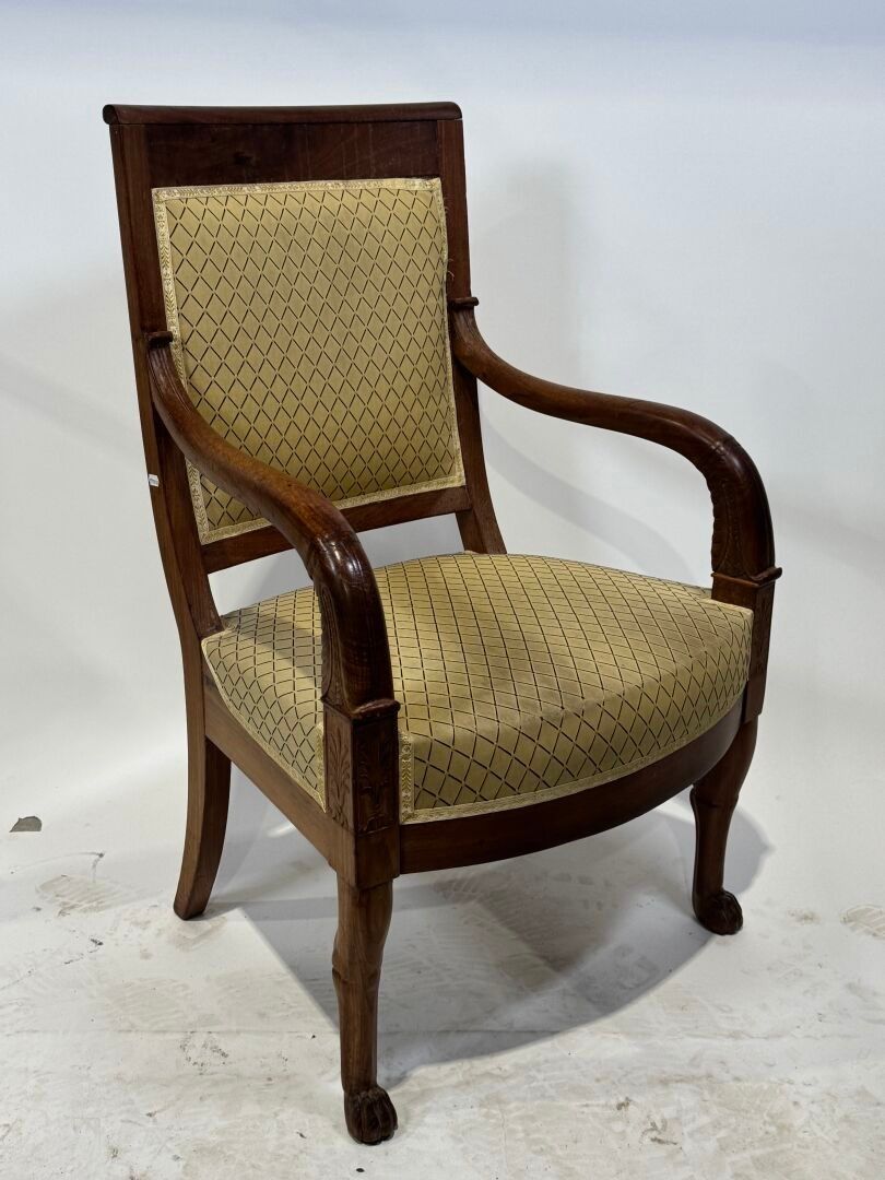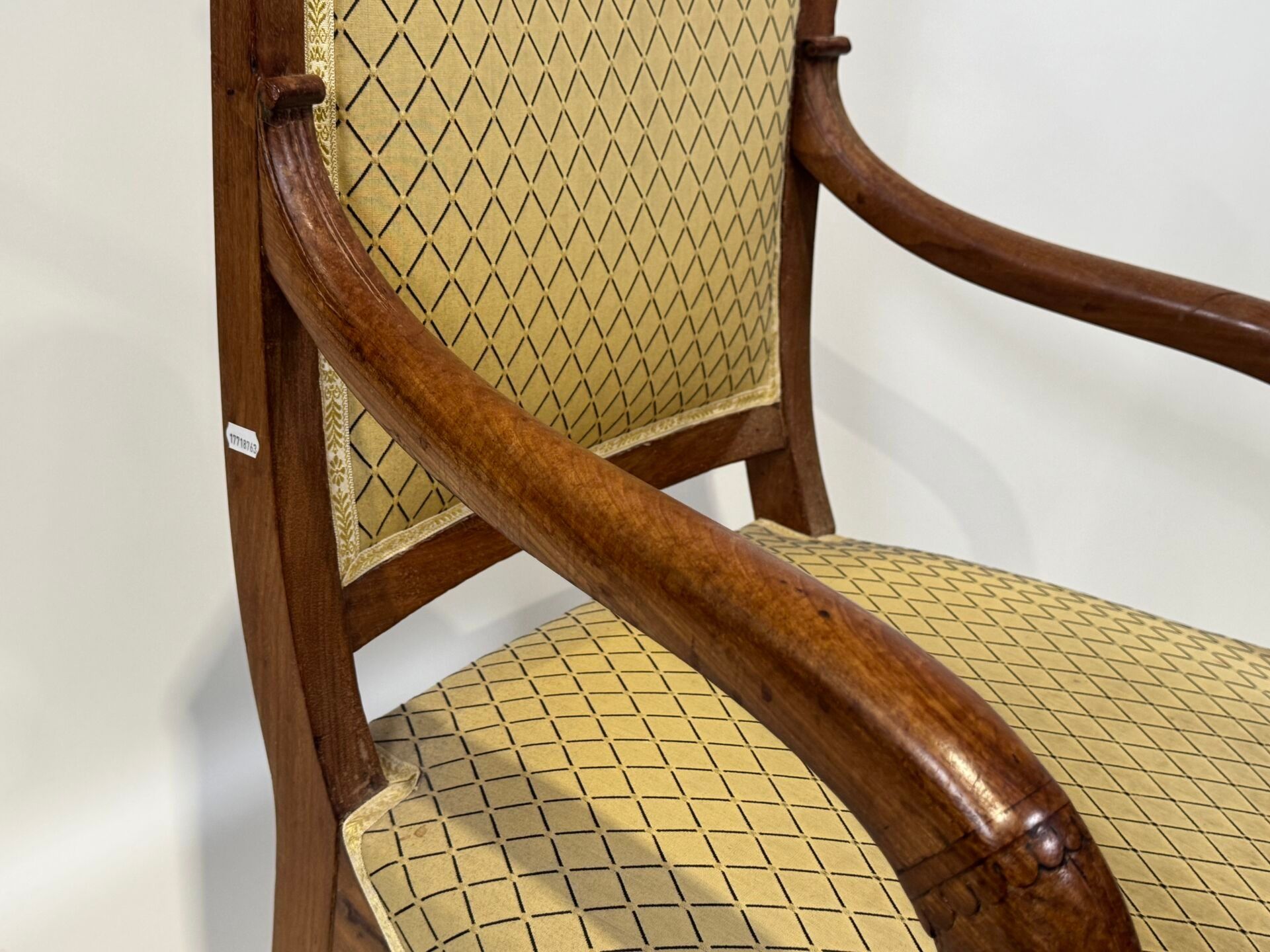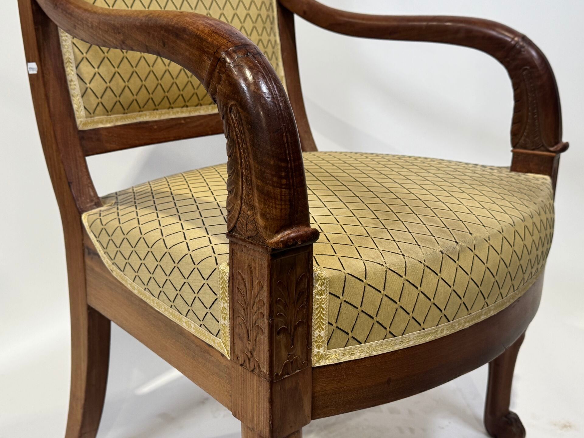 Walnut armchair with a slightly cabriolet back, the armrests depicting stylised dolphins. Cat's paw front legs and Etruscan-style back legs. Yellow textile cover.