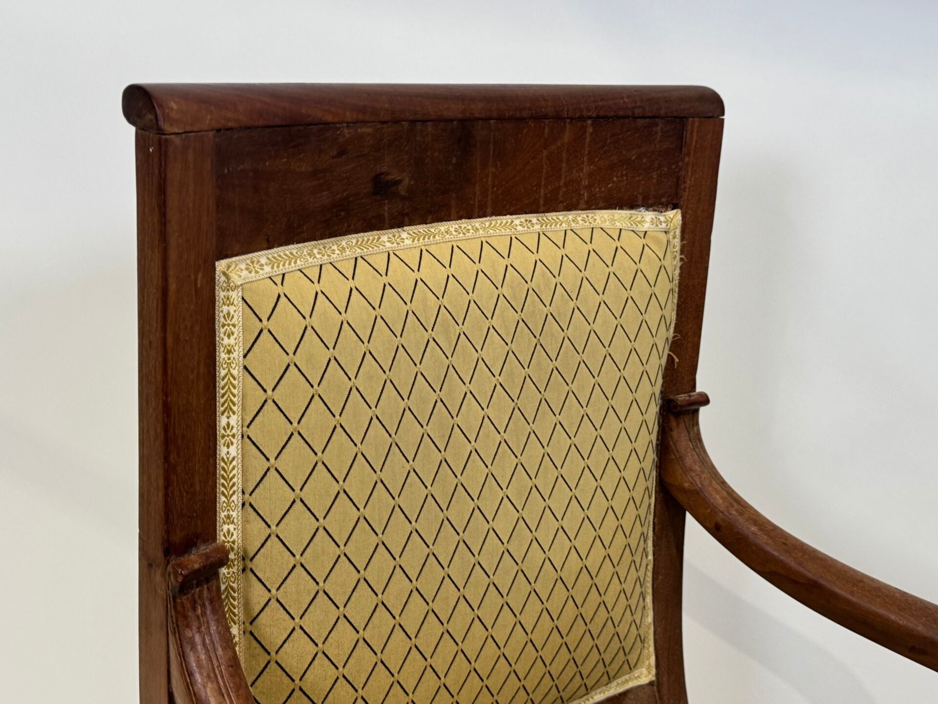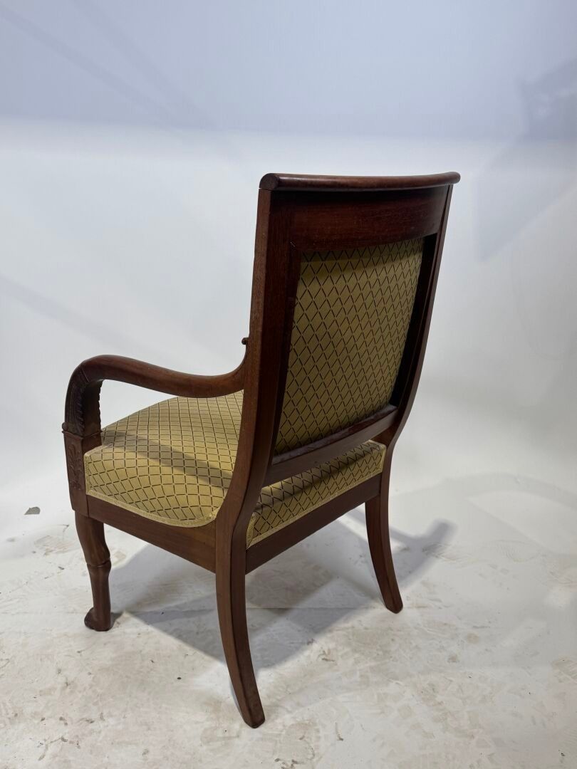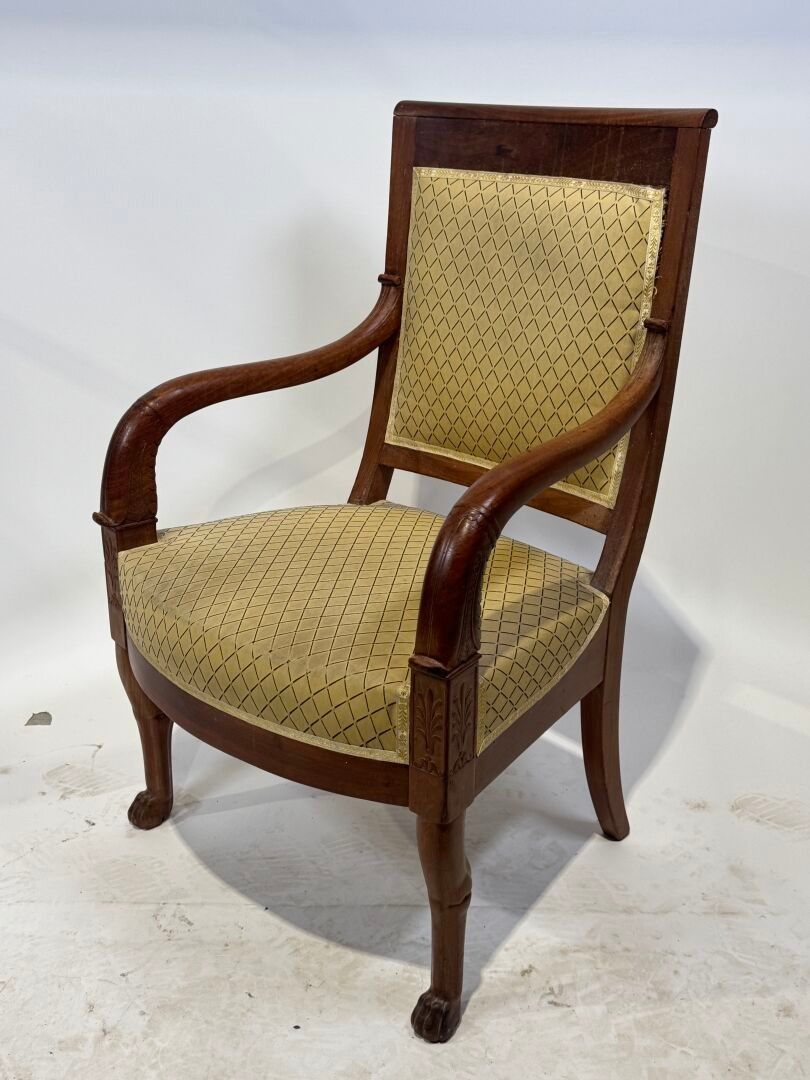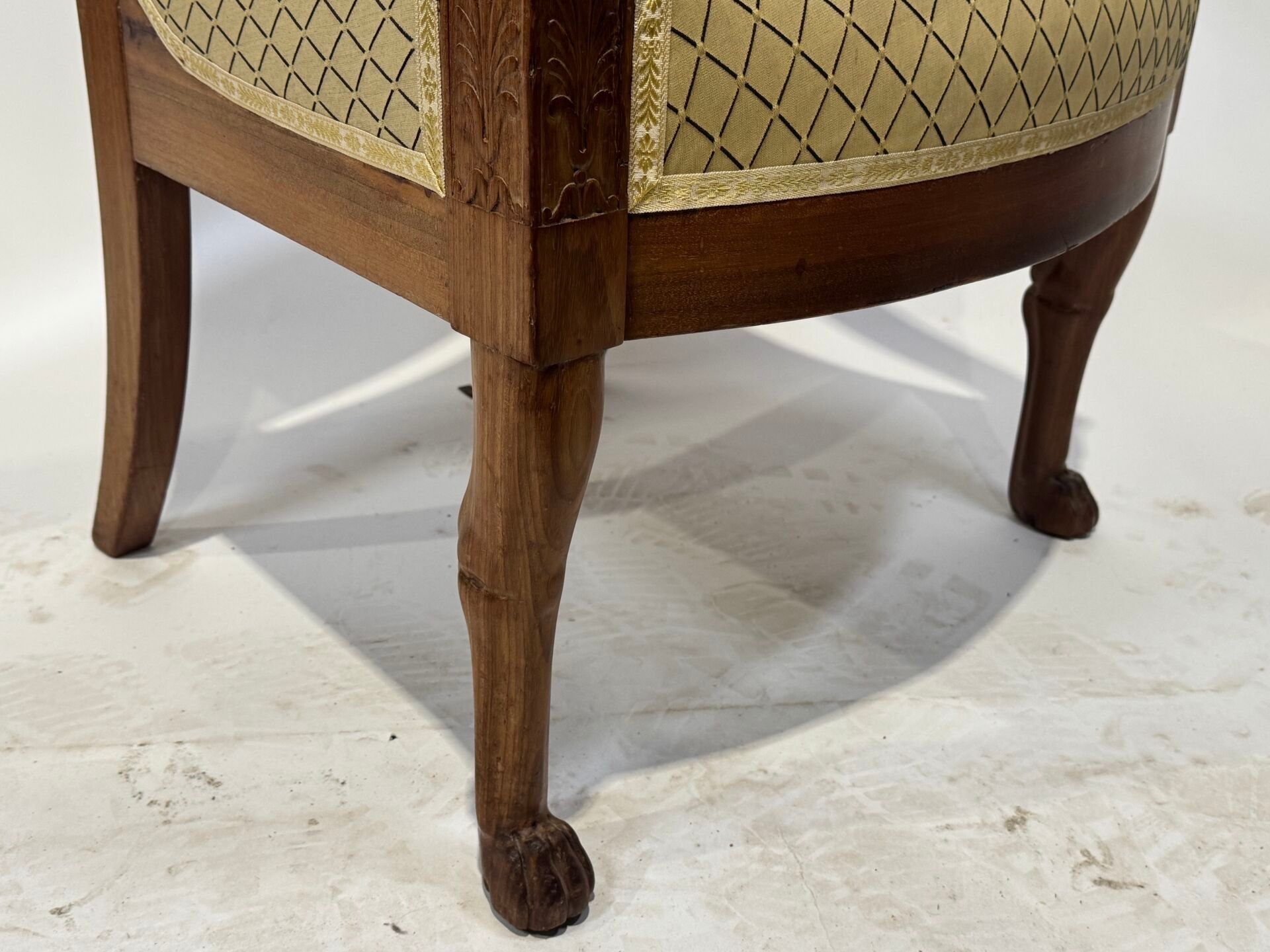 Walnut armchair with a slightly cabriolet back, the armrests depicting stylised dolphins. Cat's paw front legs and Etruscan-style back legs. Yellow textile cover.