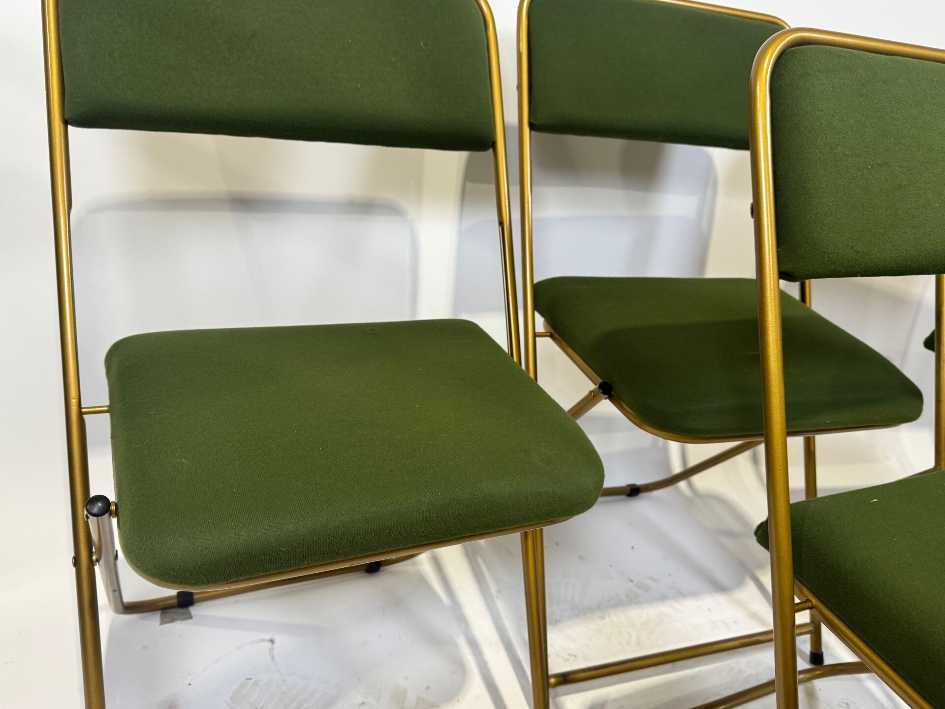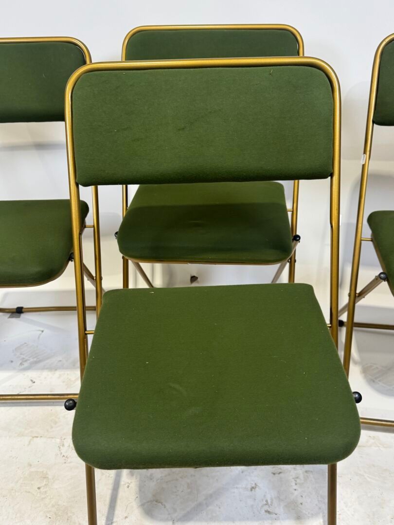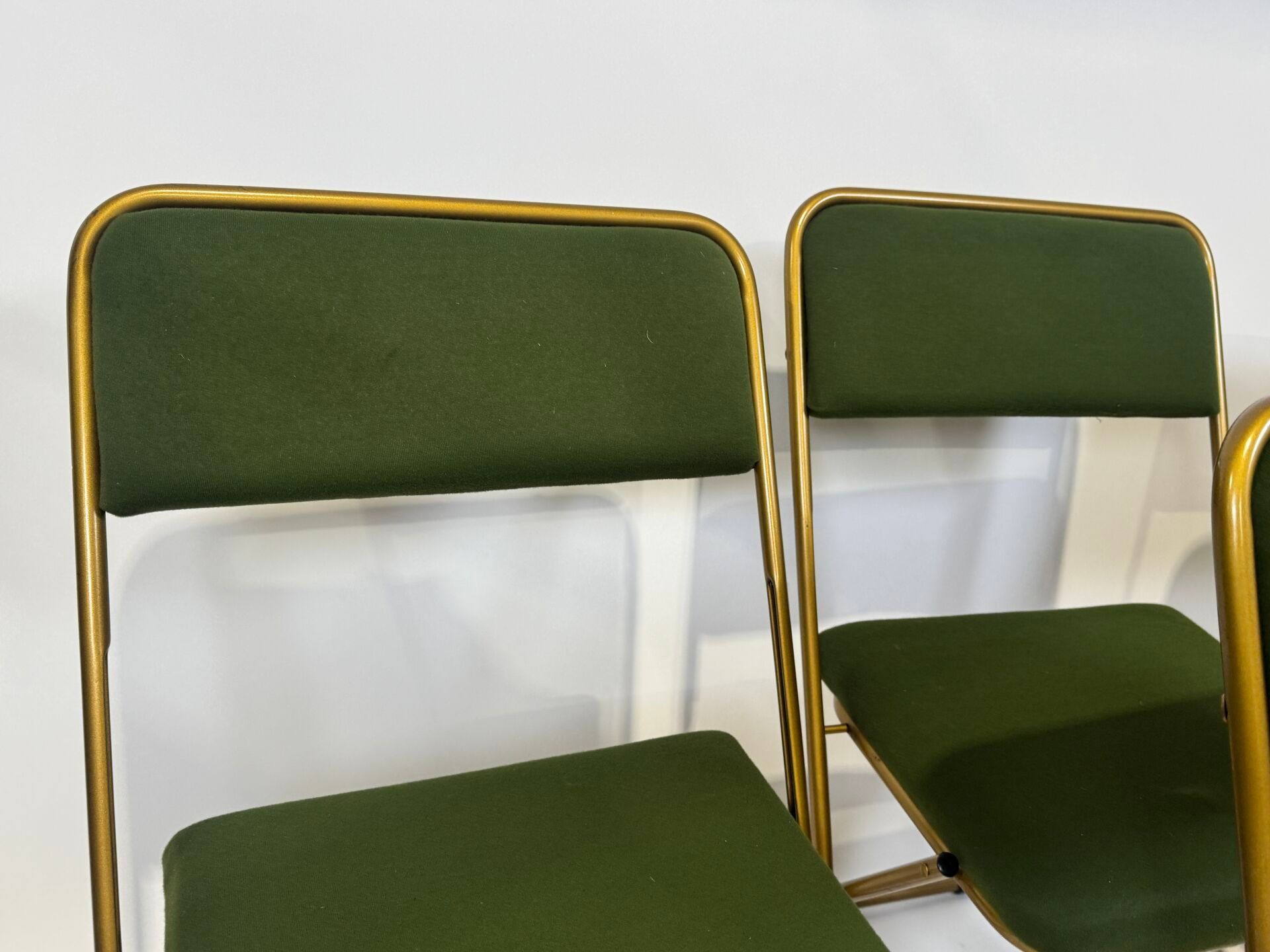 Suite of four folding chairs with gilded tubular uprights, the covers in green fabric.